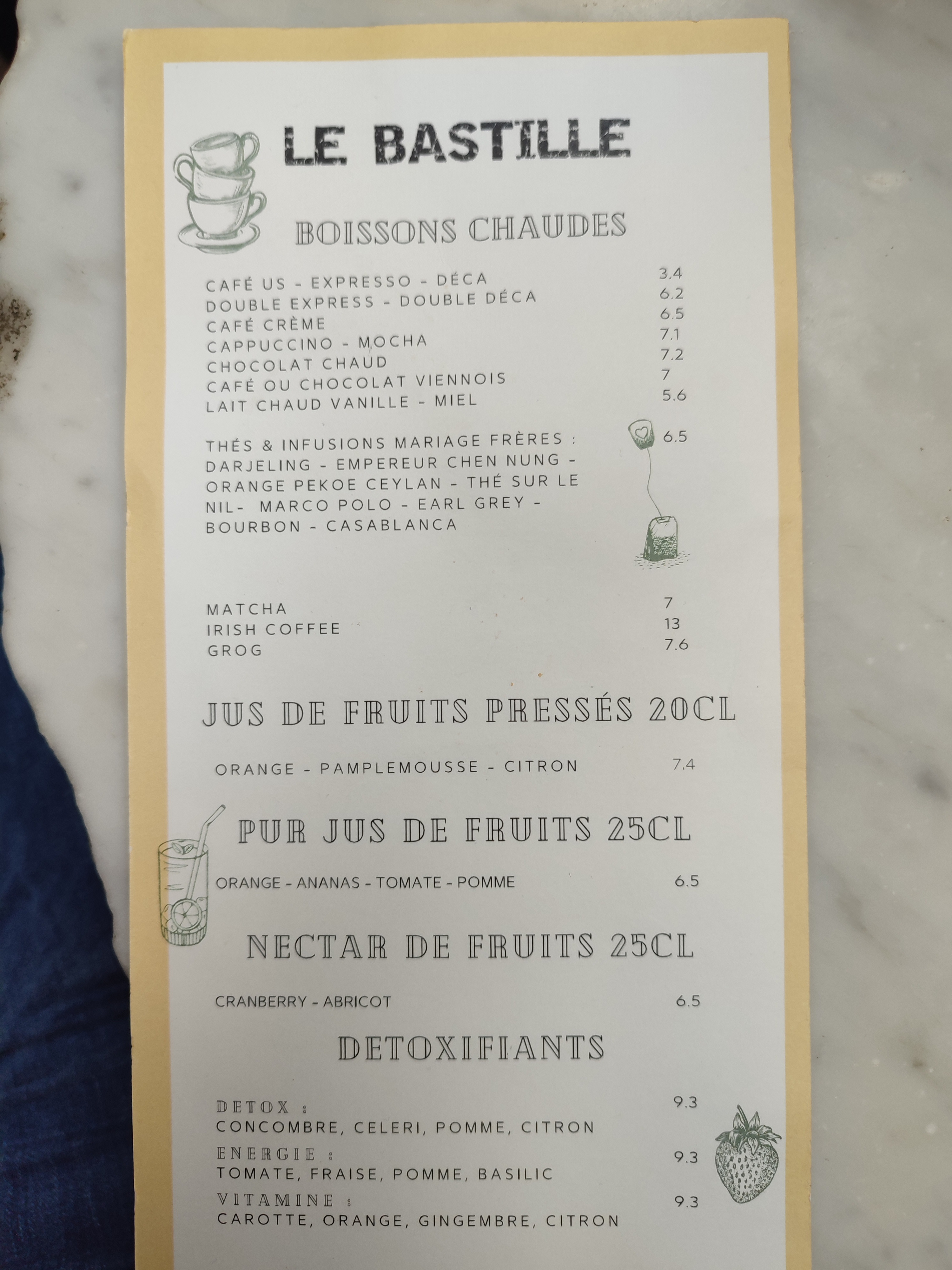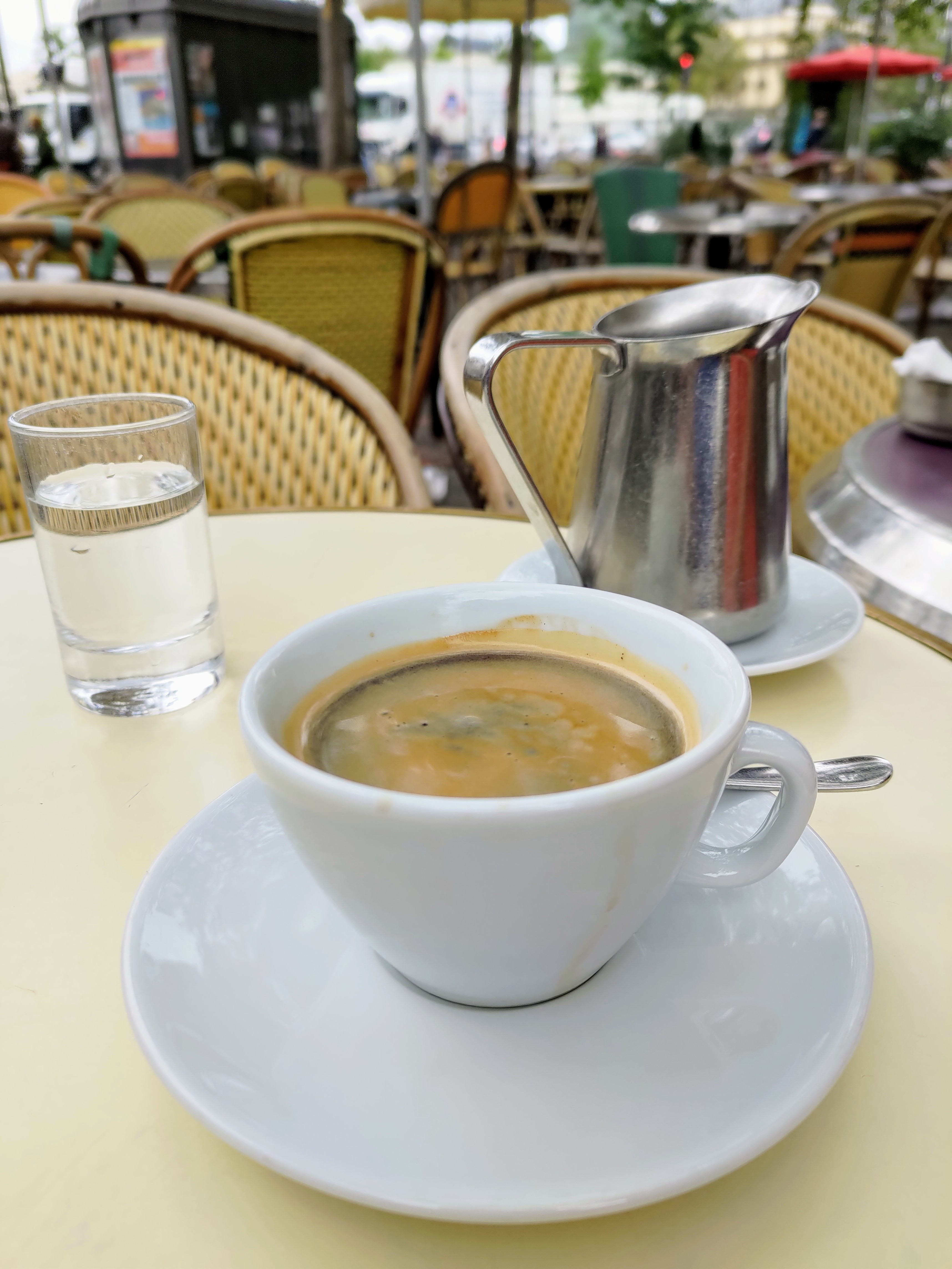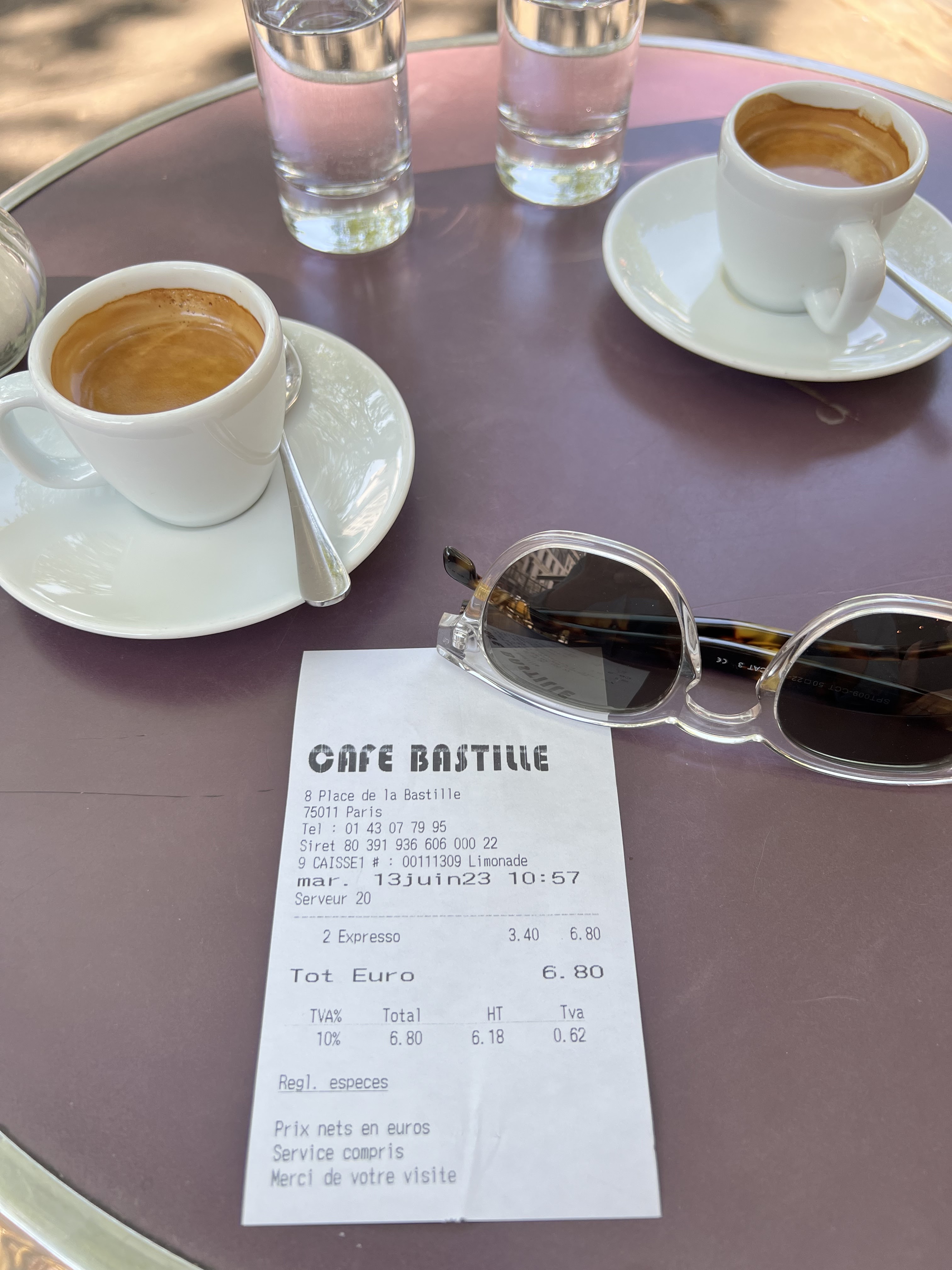 Nous ne sommes pas sur les Champs Elysées ! 6,80 € 2 expresso , même pas un chocolat et du sucre à dessert en motte non utilisable ! Génial , on ne m’y reverra plus et pourtant j’habite le quartier !