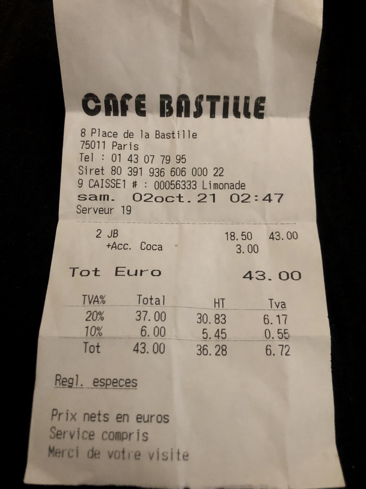 PIRE ARNAQUE DE PARIS Un vendredi soir, un des seuls bar de Bastille sans trop de monde et d'agitation, mais on comprend vite pourquoi. 2 whisky (JB) Coca commandés, 10 mn après une dose de whisky dans le verre et un petit pichet de coca pas frais (pas de bouteille n'en demandez pas trop). L'addition arrive : 43EUROS !!!!!!! En regardant la carte on comprend vite 13 euros le café ???!! Autant allez a l'épicerie pour 43 euros vous aurez deux bouteilles. RIDICULE FUYEZ