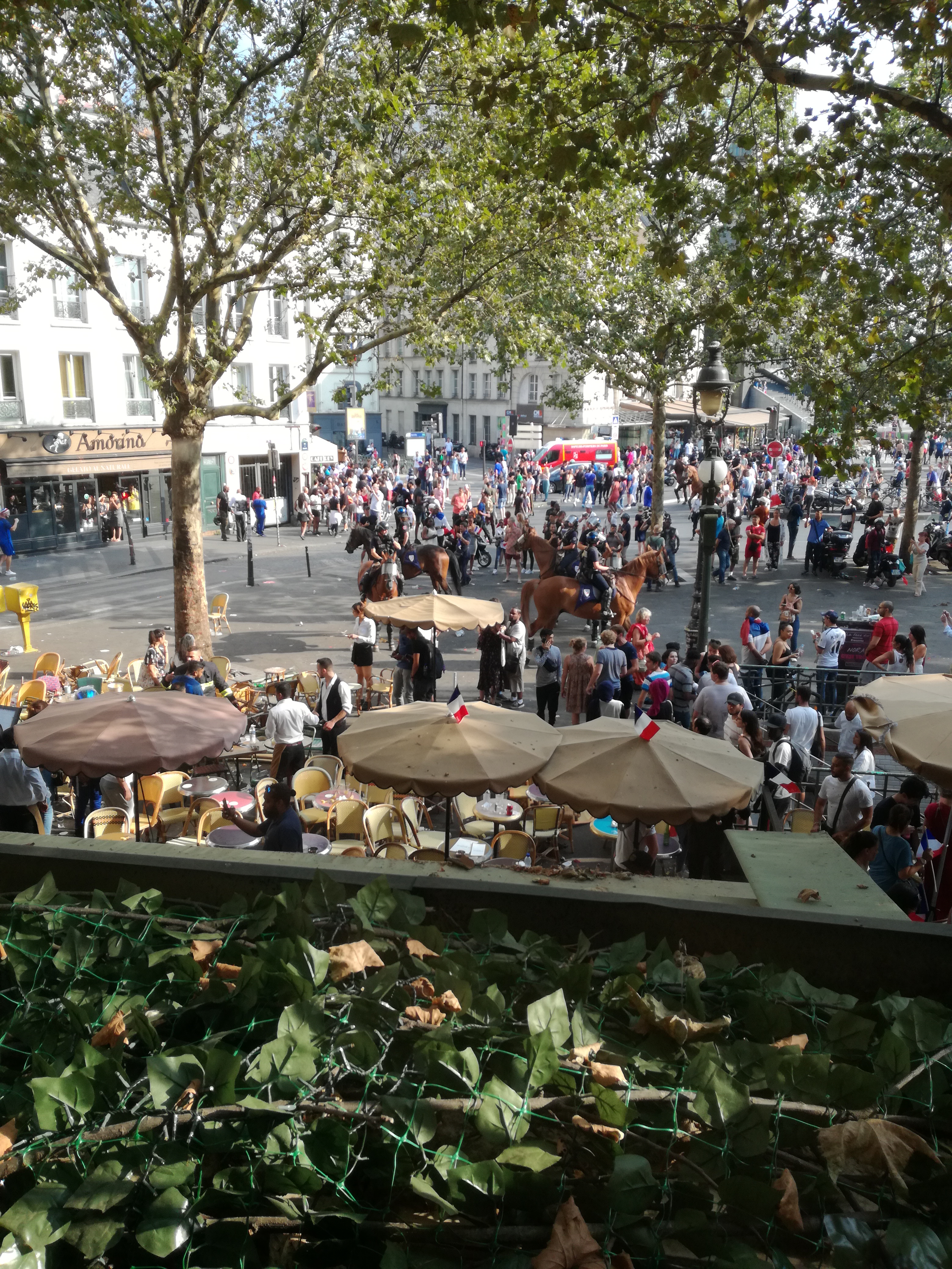 Moment de fête totalement gâché et sous tension avant le coup de sifflet final de la coupe du monde de foot pour à un mouvement de foule qui fuyait des casseurs en train de détruire le bar... very bad trip. On se s'y sent pas du tt en sécurité.