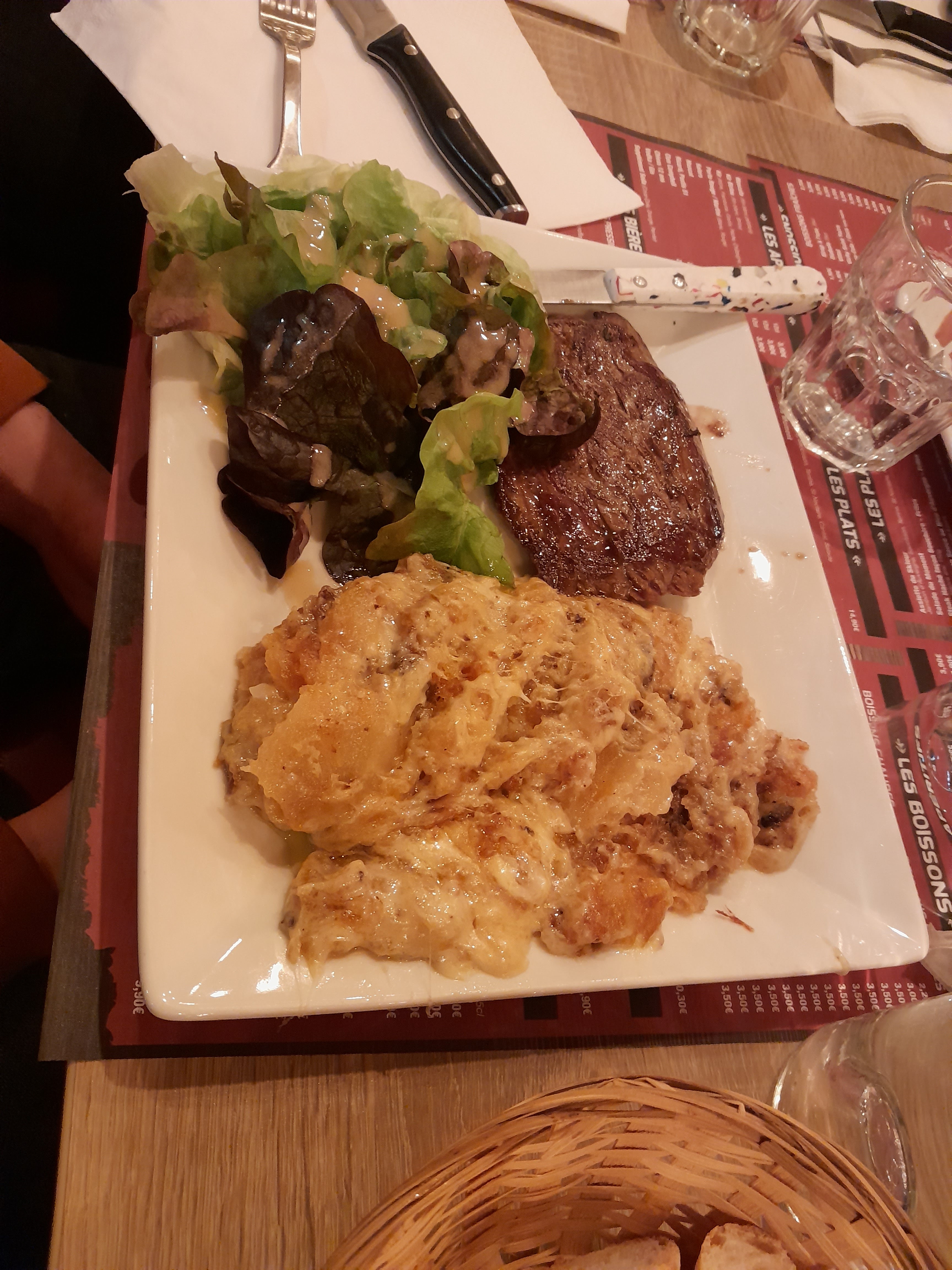 Le personnel était très accueillants et gentil, ils ont réussi à nous trouver une table pour 7 malgrés le monde, les frites étaient bonnes mais il serait judicieux d'ajouter un menu végétarien. J'ai tout de même pu demandé une truffade sans la viande qui était d'ailleurs correct. Les desserts étaient très bons cela dit ☺️