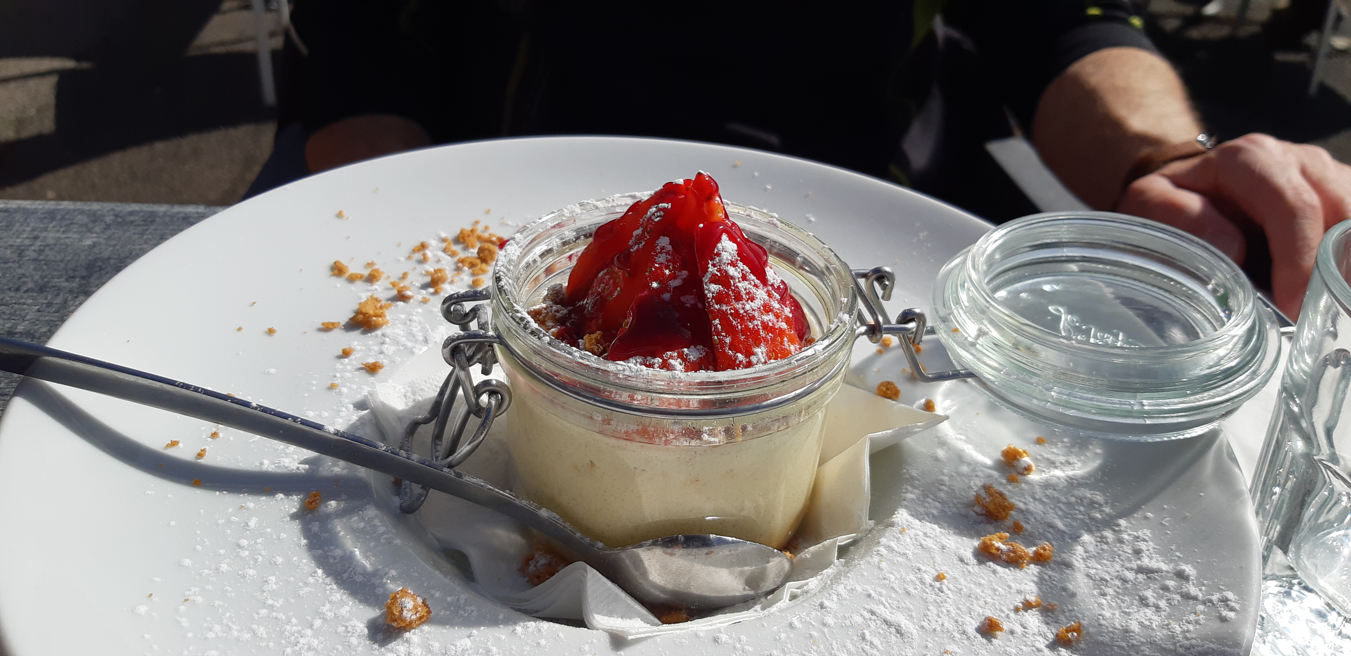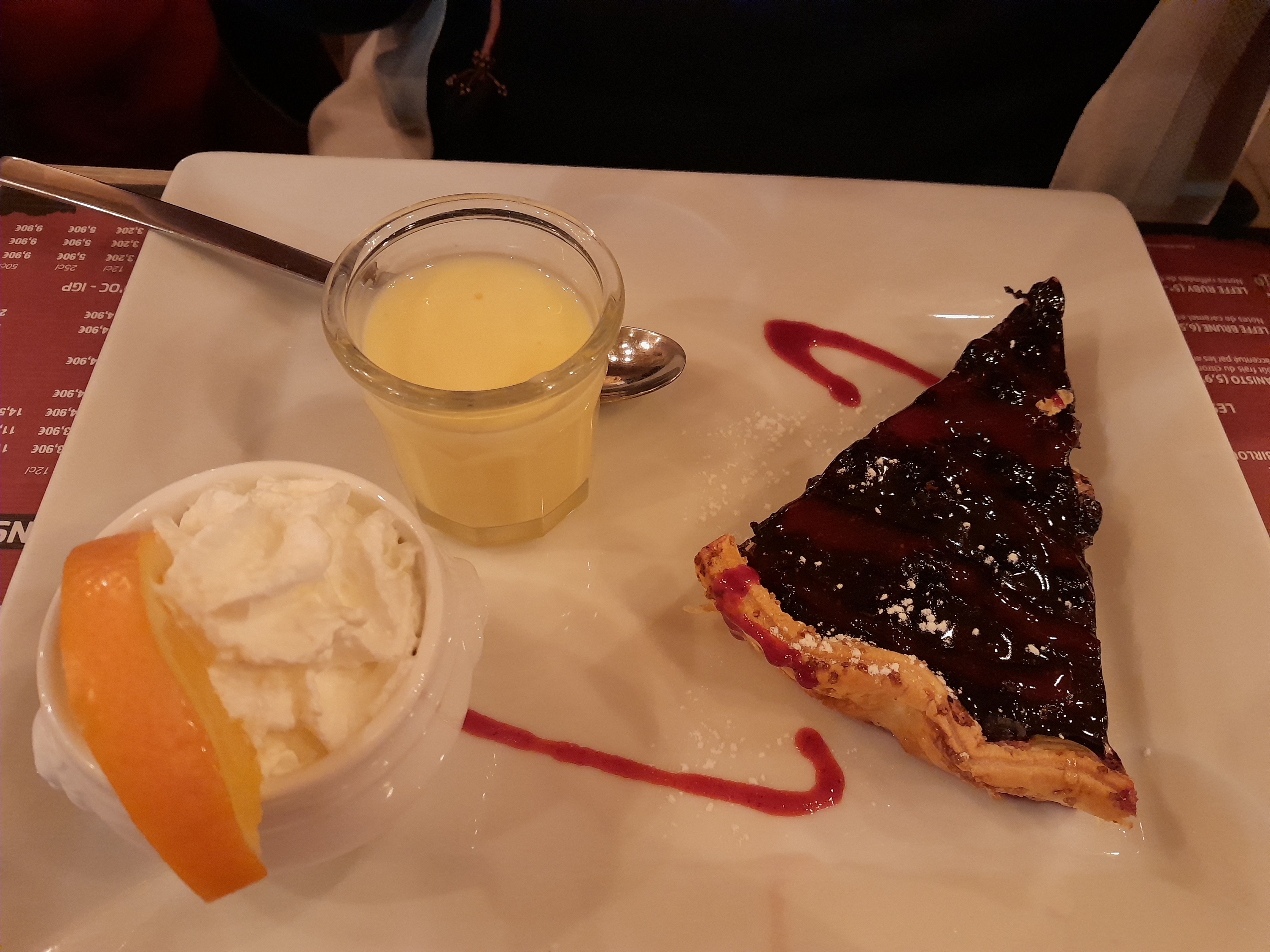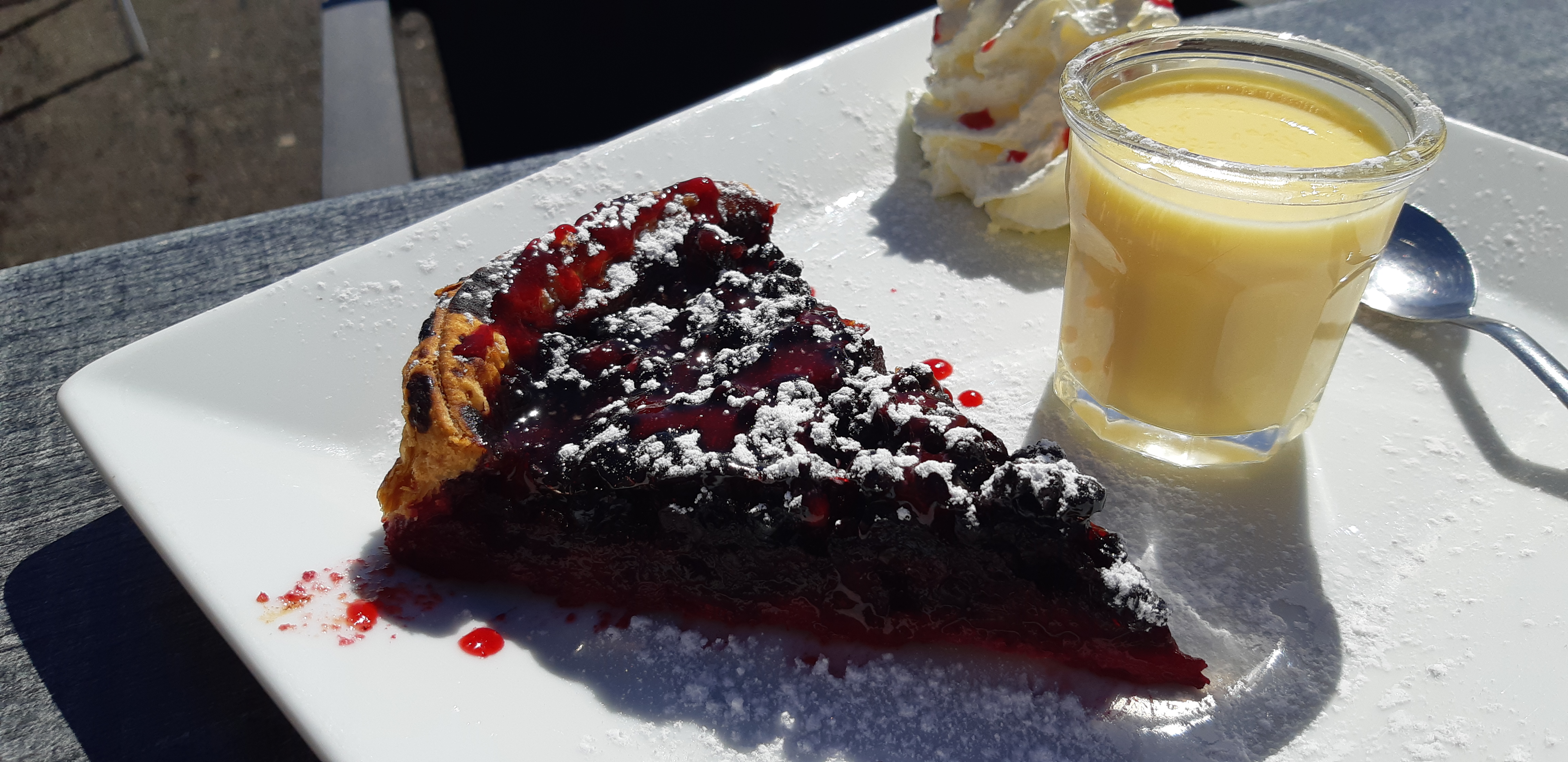 La tarte maison aux myrtilles, sur coulis de rhubarbe accompagnée de chantilly et de crème anglaise, est un régal. Les cartes des plats et desserts sont sur les tables et le service rapide et efficace. Contrairement au restaurant plus bas avec les parasols noirs.