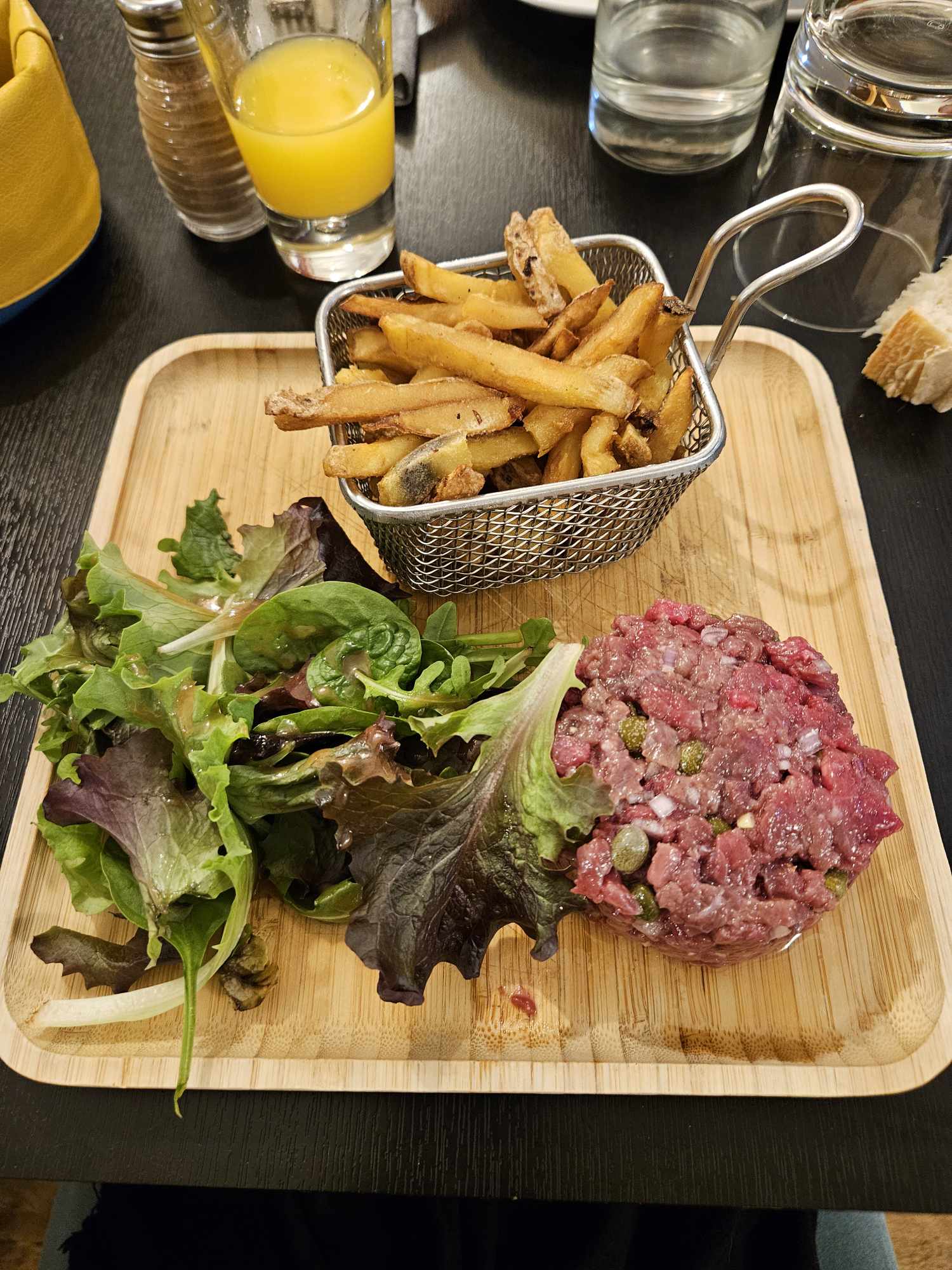 L'équipe a été super acceuillante , le repas était excellent ( respect des cuissons , temps de service très bon ), super située je recommande. Pièce du boucher , frites et salades :