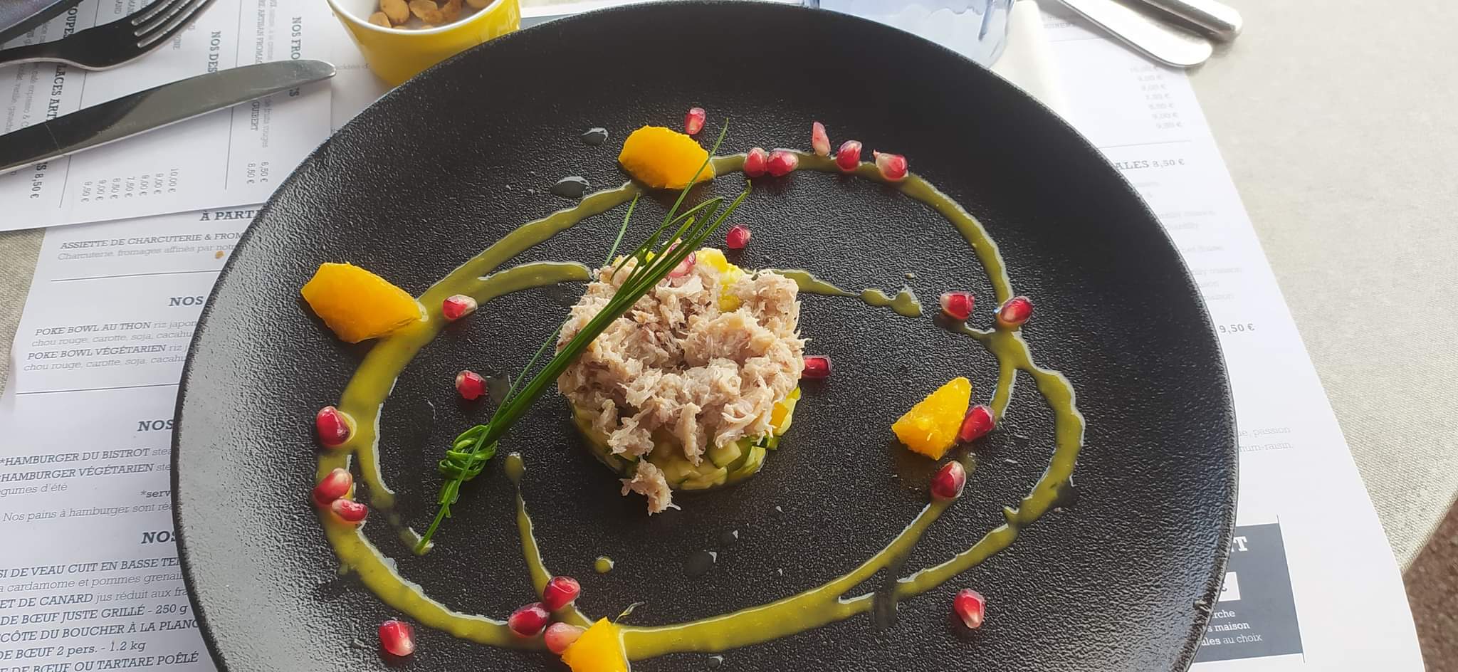 Service correcte, Spritz à 7 euros léger mais désaltérant. Mi-cuit de thon façon Thaï tout simplement scandaleux : 4 carrés de thon mi cuit même pas marinei, insipide, couché sur un mesclun de choux asiatique assaisonné d'une sauce sweet and sour tout aussi insipide. Le tout à 20 euros l'assiette, la serveuse n'a même pas demandé si ça a été pour me donner l'occasion de me plaindre. Tartare de boeuf coupé à la machine, trop l'impression se manger une bouilli de viande cru, assaisonnement du tartare tout aussi insipide. Le magret de canard était parfaitement cuit et assaisonné, ce qui comptera pour les deux étoiles de ce commentaire.