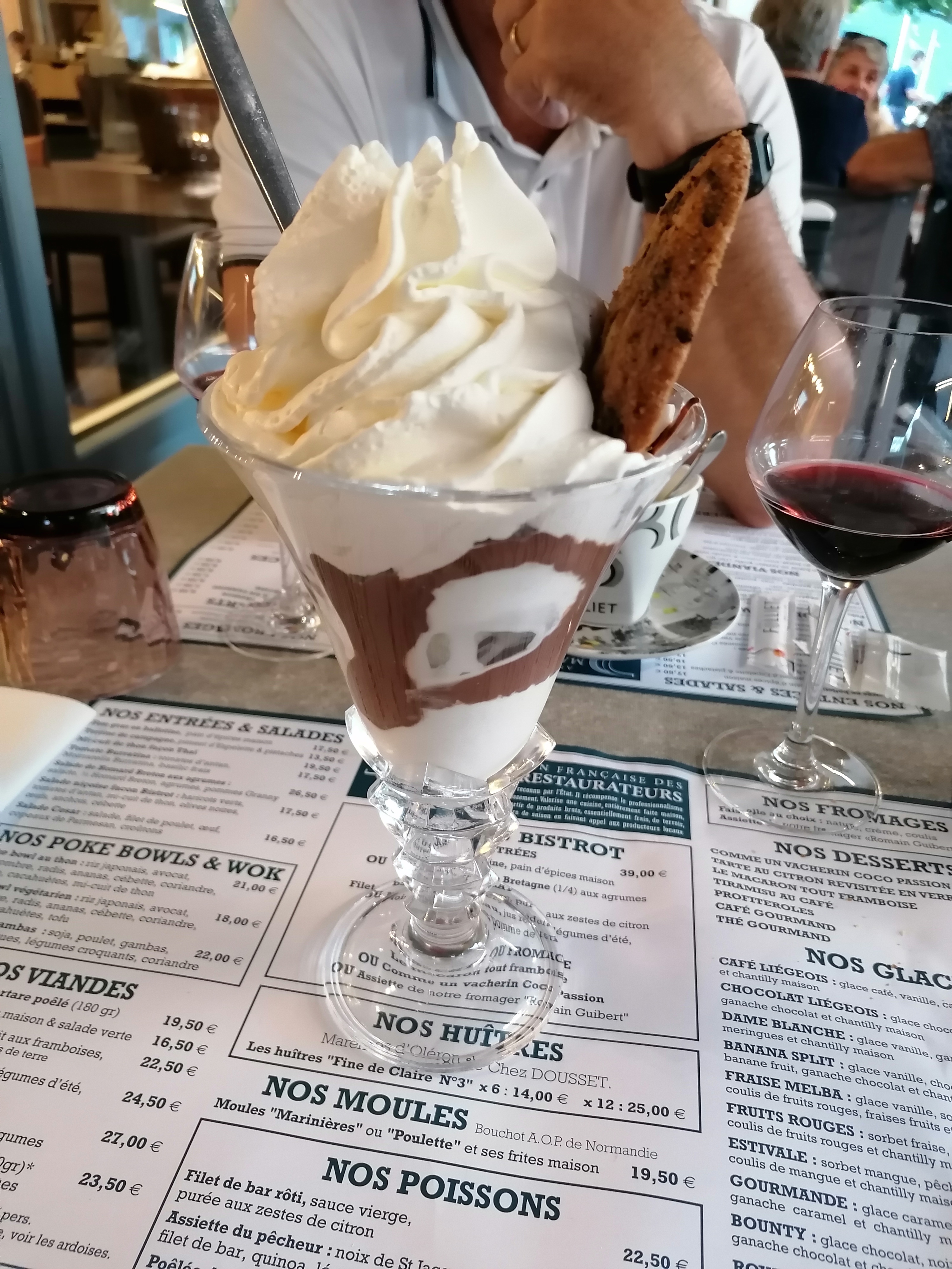 Superbe bar rôti avec sa timbale de riz crémeux. Un cafe liégeois qui deborde de son contenant. Un excellent repas.Une terrasse pour les beaux jours, Un peu bruyant.
