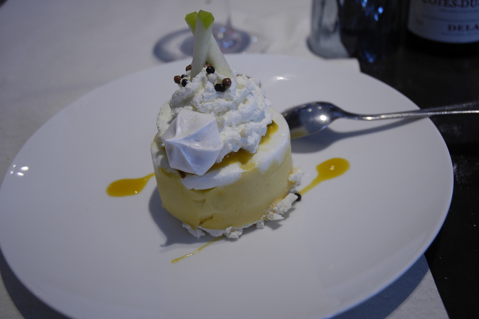Bon une étoile et surtout un message ! Les frites au gout de poisson pas top ... Bon on essaye le dessert … j’aime le danger ! Macaron noisette aux framboise fraîches ! Suspens ! Bon le macaron noisette framboise à 9 euros … no comment ! Mais on voit le lac !