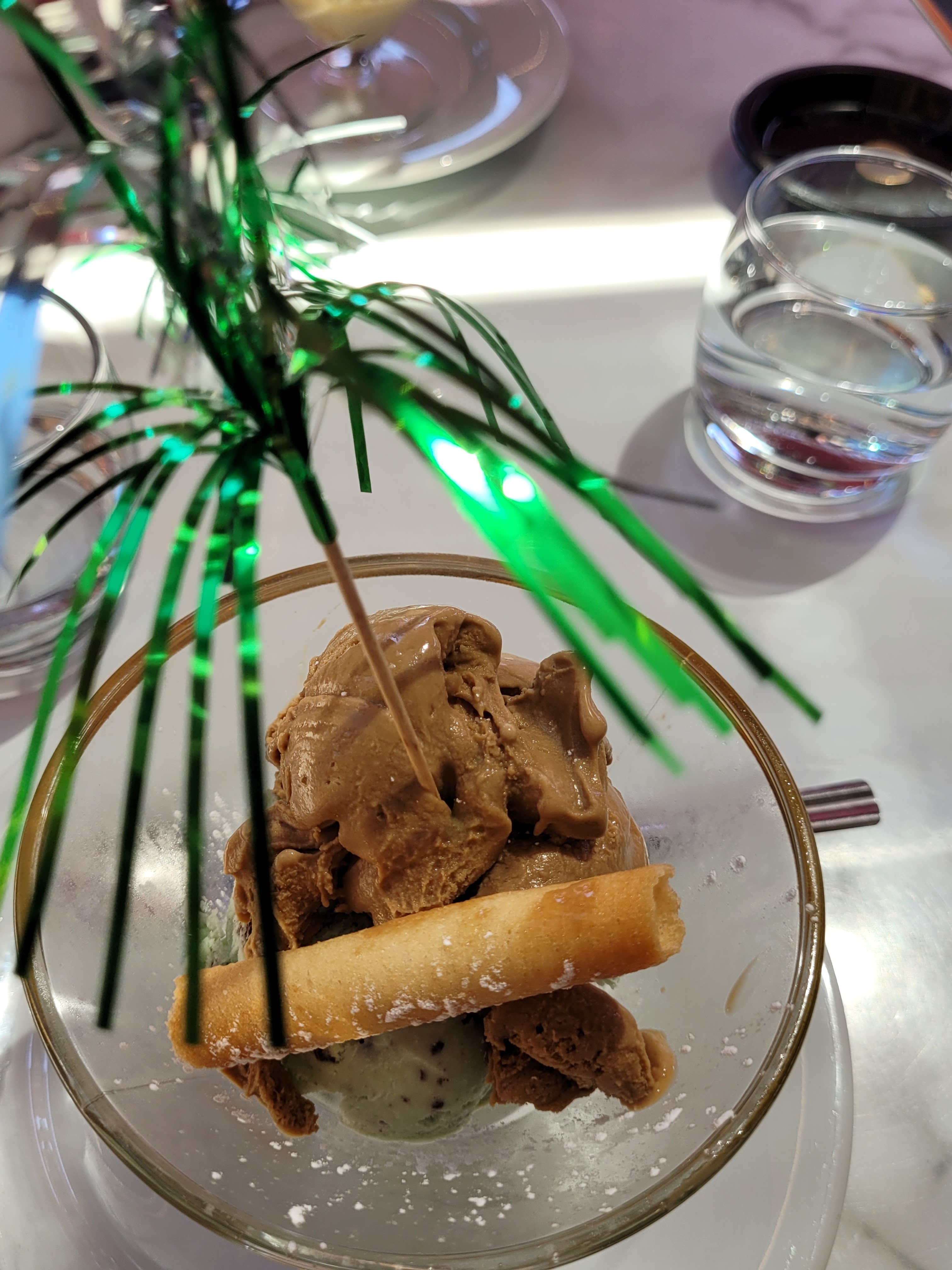 Cadre et terrasse très agréable Service rapide et avec le sourire visible malgré le masque imposé Très bonnes glaces chantilly au top