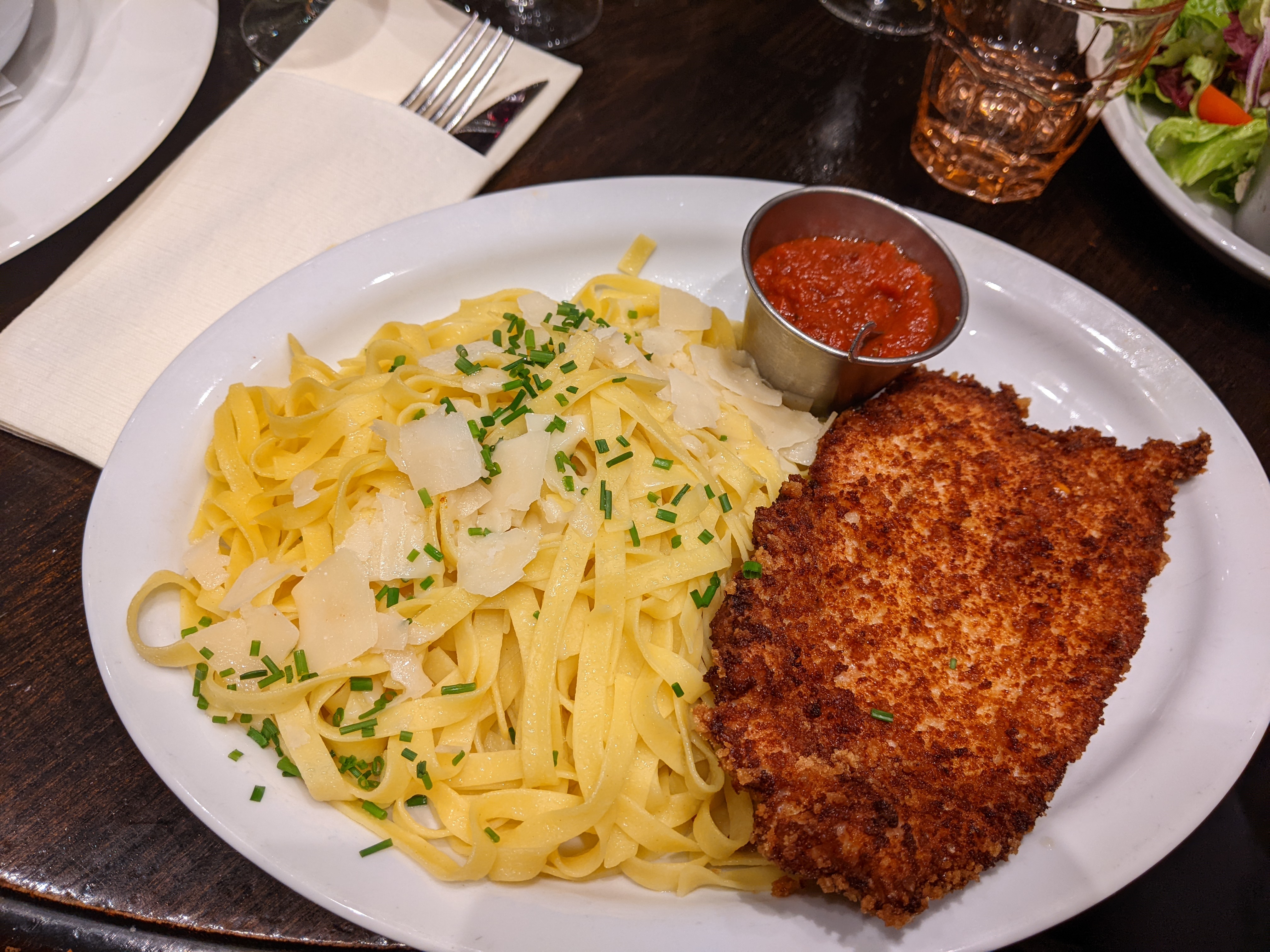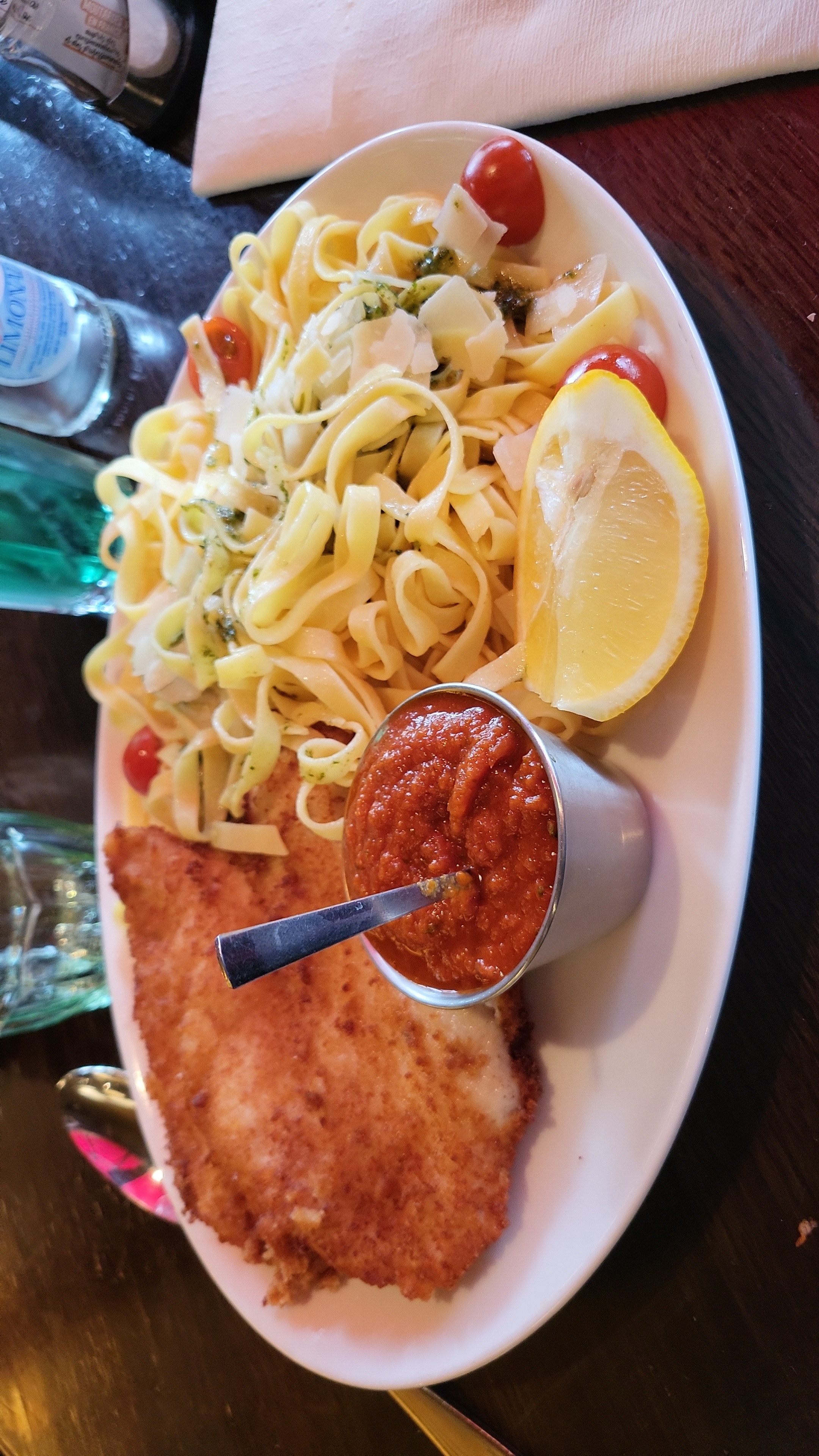 Spécialiste de l escalope milanaise j avoue que lorsque elle est présente sur le menu j en prend une volontiers. Les pâtes arrivent cuite à la perfection ,la panure est croustillante à souhait, la viande est moelleuse à cœur. Les dessert sont toujours très bon