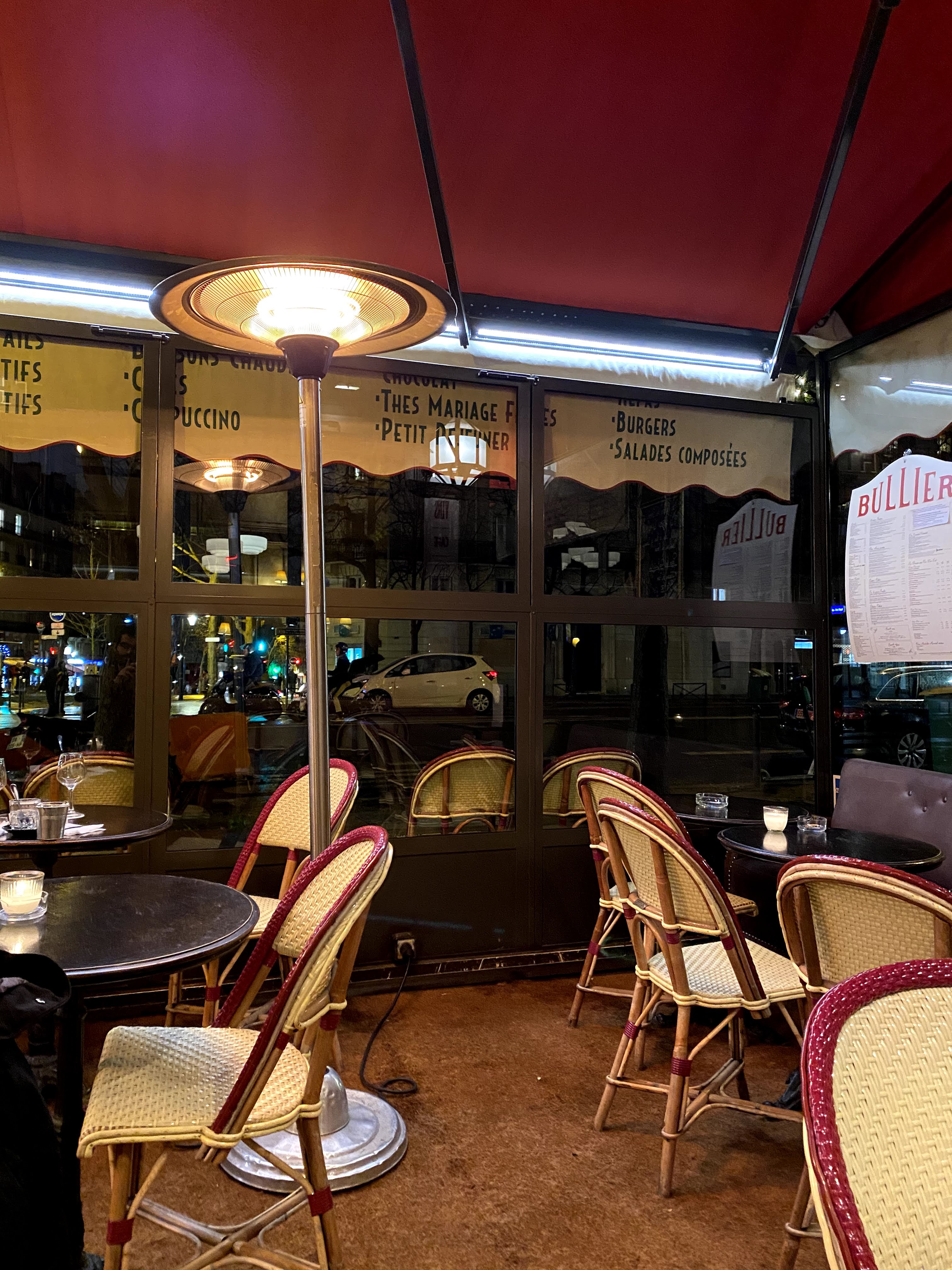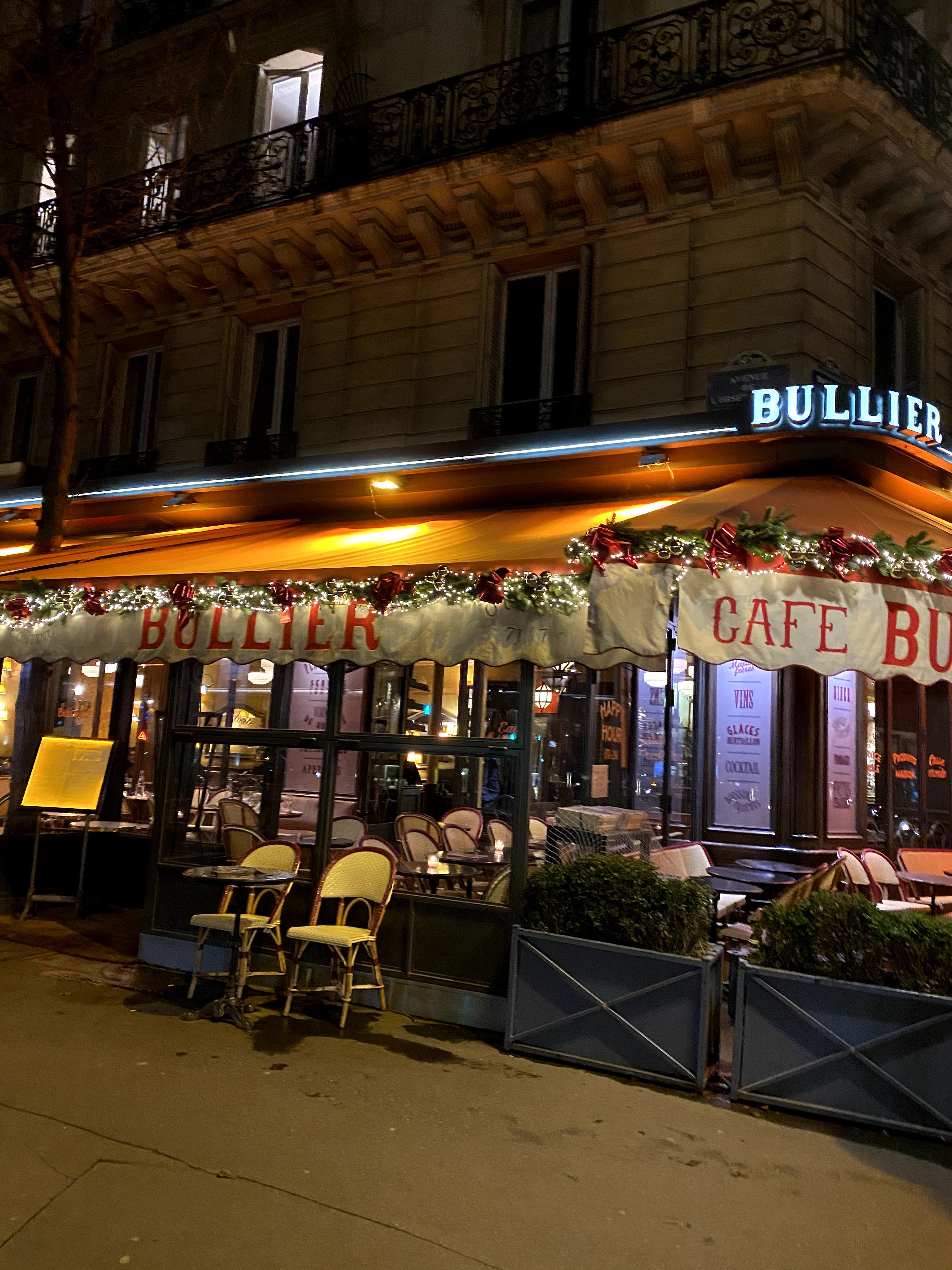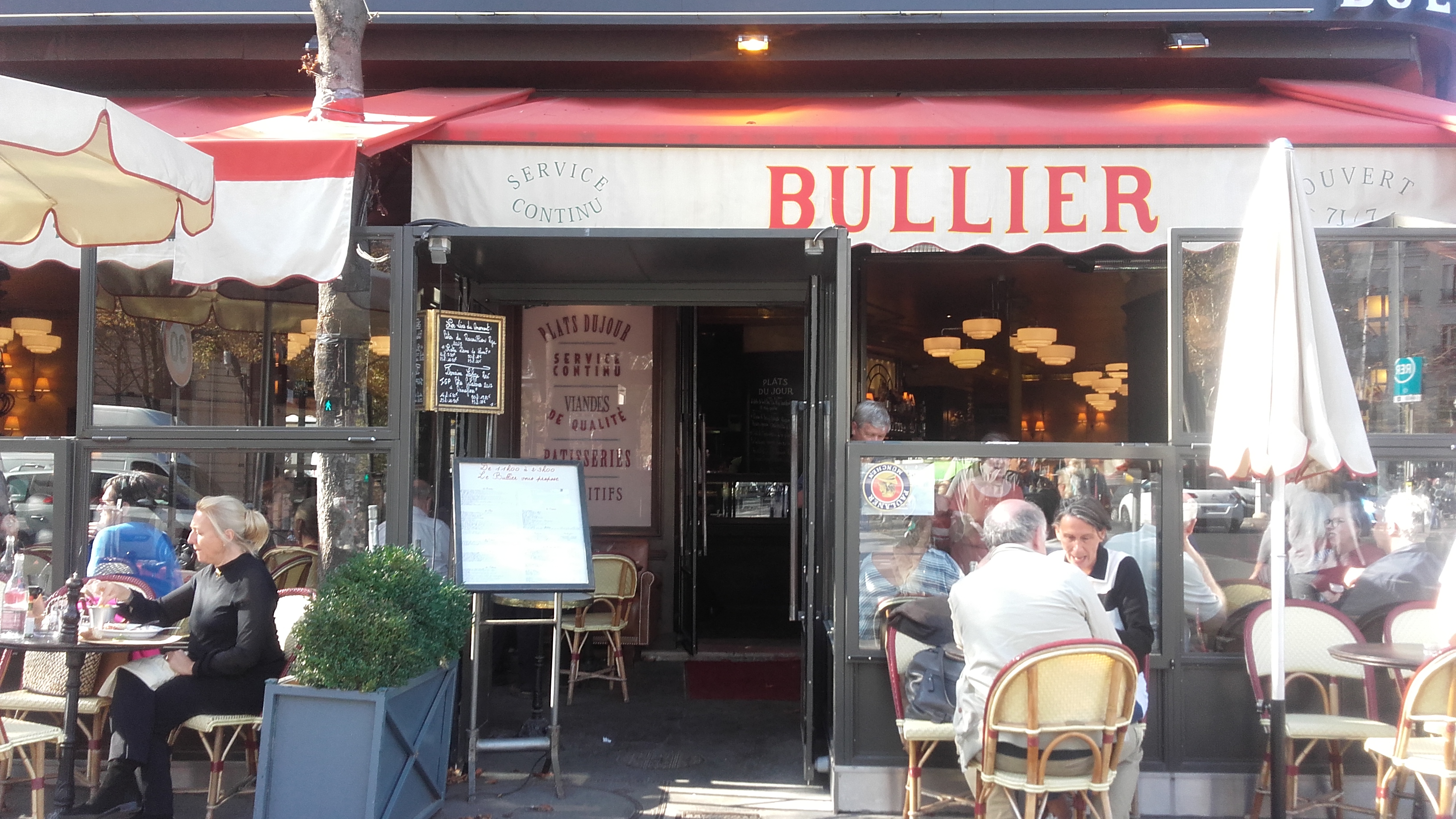 Nous nous sommes rendus au Bullier en famille un dimanche soir. Situé à l’ange des boulevards du Montparnasse et de l’Observatoire, nous avons pris un verre en terrasse avant de dîner en salle. La terrasse est spacieuse et donne une vue dégagée sur la gare Port Royal où se tenaient en 1850 le bal Bullier. Nous avons été installés en salle sur une table ronde où 6 convives peuvent s’attabler, 3 sur une banquette courbée et 3 en vis à vis sur des chaises. La décoration et le mobilier est restée fidèle à l’esprit des brasseries parisiennes. Nous avons commandé des plats du jour et à la carte. Les plats sont copieux et bien exécutés. Nous avons eu des frites faites maison et une salade verte en garniture. Le service est souriant, efficace et prévenant. Dans l’ensemble nous avons passé une très bonne soirée.