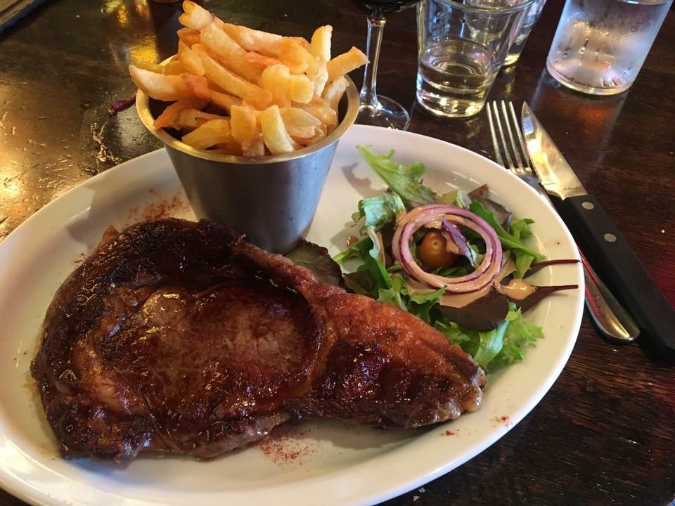 Bel endroit et serveurs sympathiques, mais la nourriture s'est avérée médiocre. Hier nous étions 4 : nous avons mangé de la soupe à l'oignon, du tartare, de la bavette et du fish and chips. Le poisson semblait avoir été frit deux fois, trempé dans une huile malodorante, les chips dans une huile trop vieille, la bavette dure et difficile à couper, le tartare restait bon, mais avec une salade mal habillée d'une sauce lourde. Pour plus de 100 euros nous avons mangé peu et juste ce qu'il fallait, sans aucun dessert. Nous n'y retournerons certainement pas pour manger, mieux vaut rester à l'excellent café au comptoir.