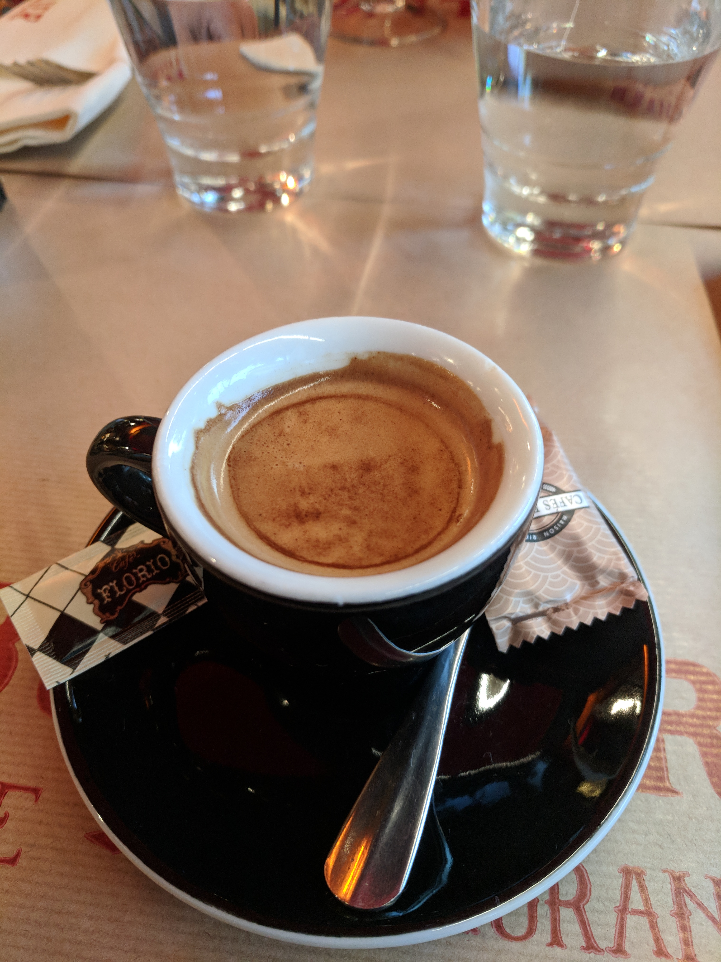 Café Parisien typique, comme beaucoup d'autres. Le barman est sympathique et dynamique, même en prenant le temps de chatouiller la serveuse... En revanche, quand donc les Cafés Richard, qui ont conquis le quasi monopole des bistrots de Paris arrêteront de distribuer des cafés robusta de mauvaise origine, cueillis trop verts, préparés trop vite, avec un goût aussi peu français que les vins courants d'autrefois, les rouges qui tache, qui ont fini par lasser les consommateurs ? C'est suicidaire de leur part.
