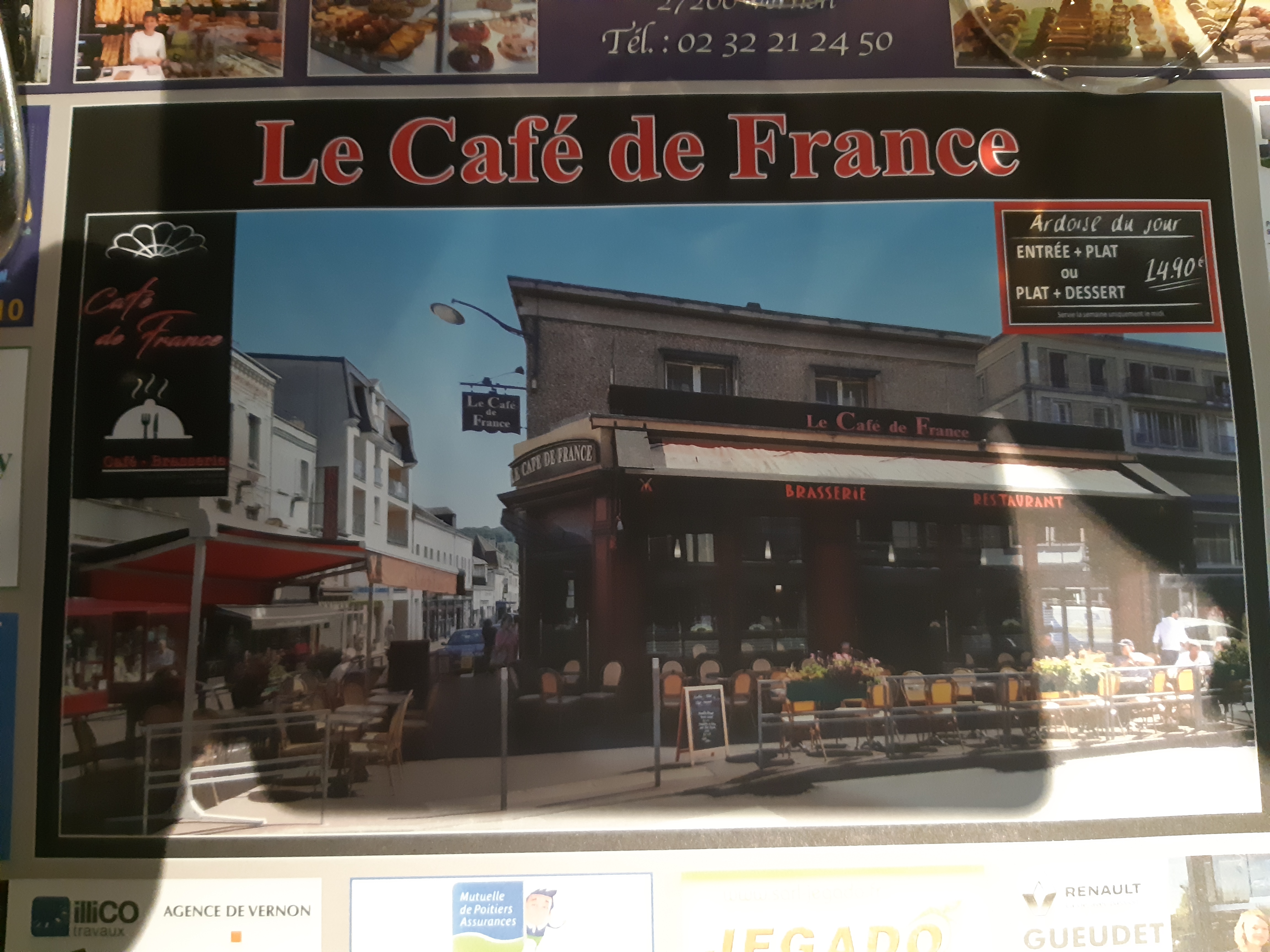 Voici toutes les informations sur le Brasserie Le Café de France qui ce trouve au 59 Rue d'Albufera, 27200 Vernon (27). Sur cette fiche vous trouverez les photos, l'adresse, les horaires d'ouverture, le numero de téléphone et les avis clients.Vous pouvez églement rédiger un avis si vous le souhaitez en bas de page.