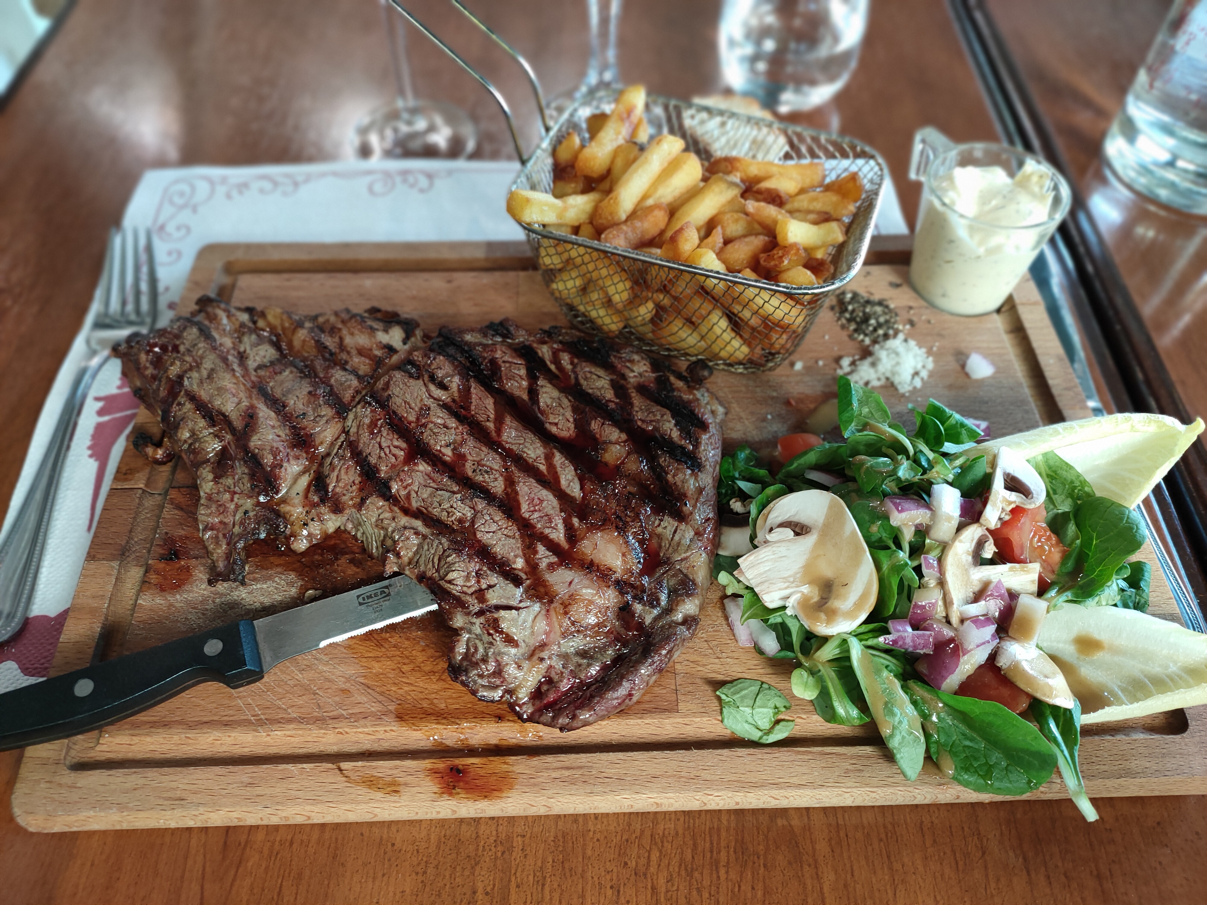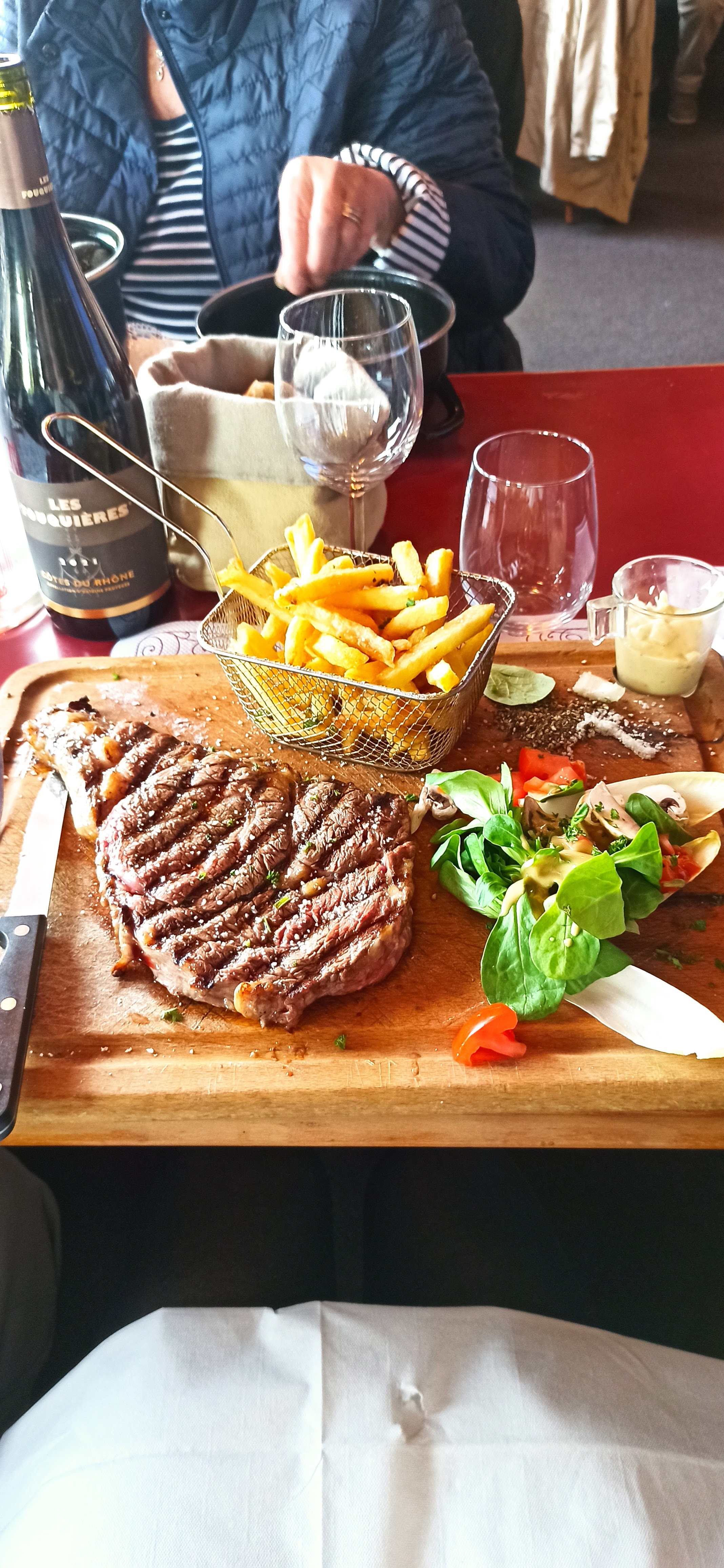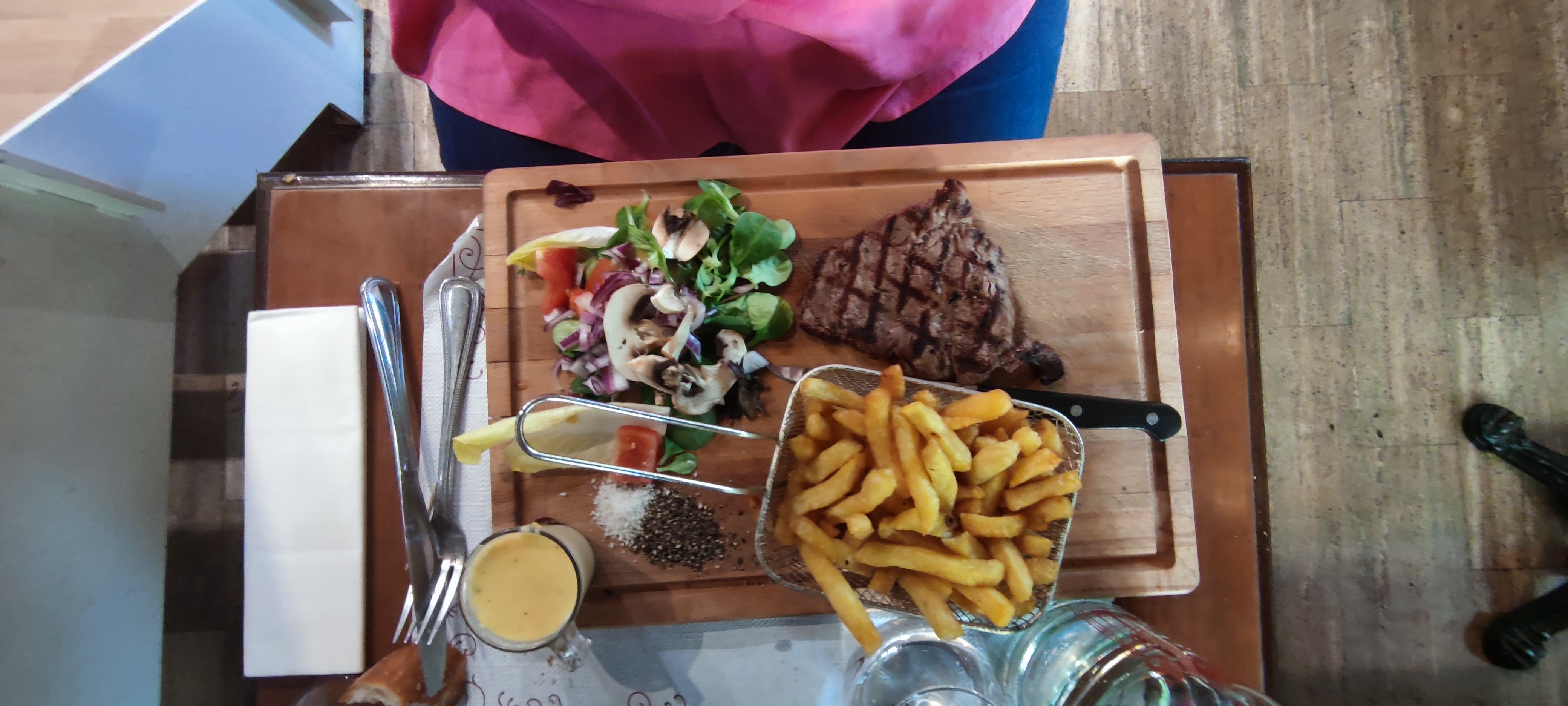 Lieu sympathique. Avons pris 2 entrecôtes avec frites salade présentées sur planche. Viande très bonne, cuisson maitrisé. Bon rapport qualité/prix Personnel plutôt accueillant et souriant Je recommande ce lieu