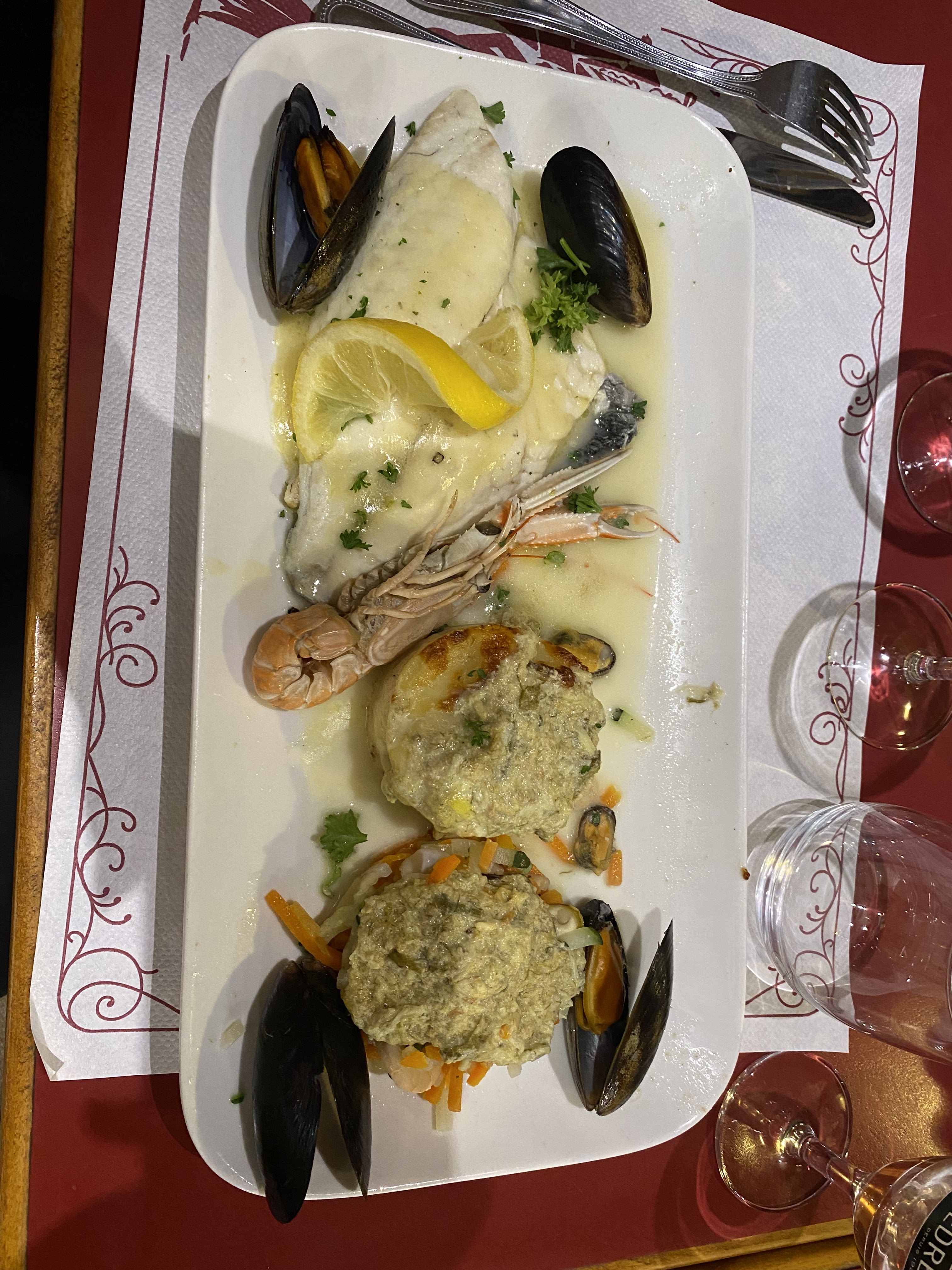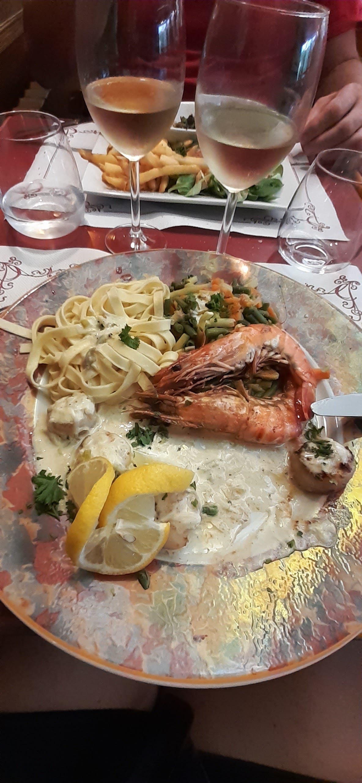 Poisson servi 25 minutes après les plats de viande, frites surgelées, accompagnement légumes surgelés, gambas surgelées, vin pichet très bas de gamme, pain pas frais. Le nombre de clients est privilégié à la qualité des produits servis. Dommage, le cadre est très sympathique et les serveurs agréables.
