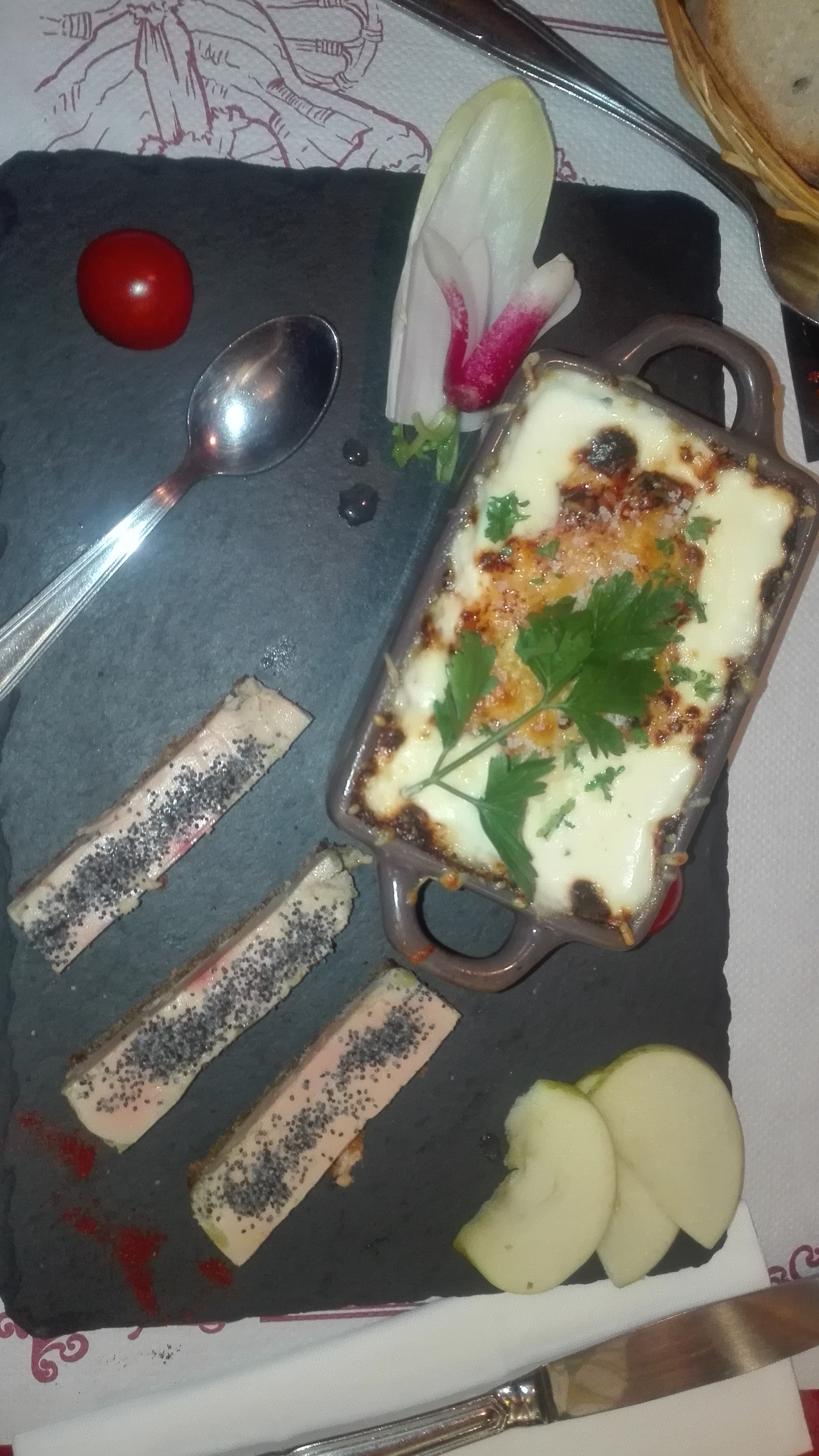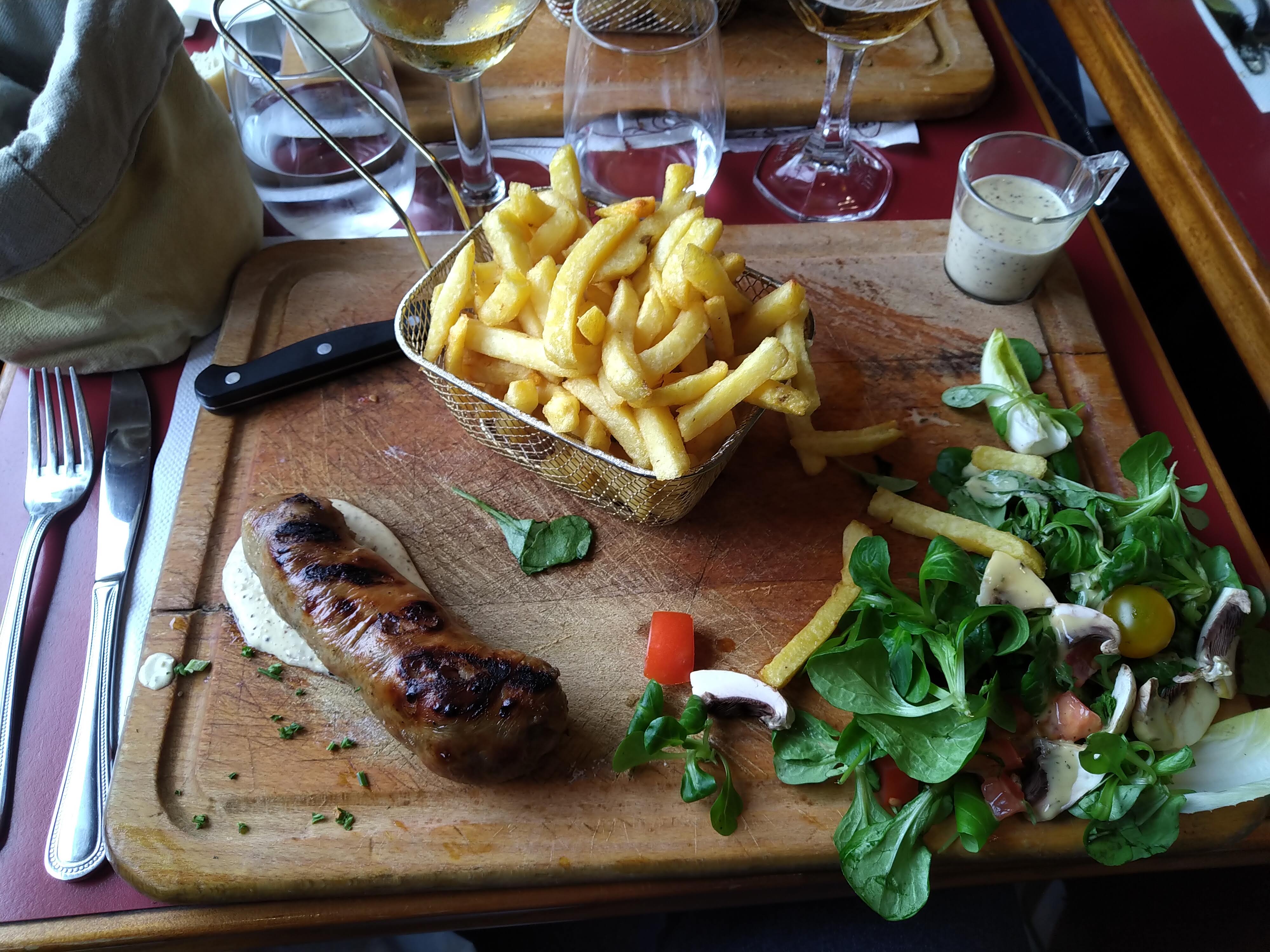 Expérience très mitigée. Adresse recommandée. Mais déception à l'arrivée de l'entrée. Assiette matelote fruits de mer congelés (quel dommage) avec le marché le jour même. **Assiette plat sur planche copieuse et de qualité, l'andouillette est très bonne ! Et prix correct. Déception pour le service. Serveur très gentil mais maladroit, vin renversé sur la table, se fait des réflexions à lui même a voix haute, très éparpillé et beaucoup d'oublis. Au final de très bons plats mais déception pour l'entrée congelée et les desserts très moyens. Niveau prix ça reste cher pour cette qualité moyenne.
