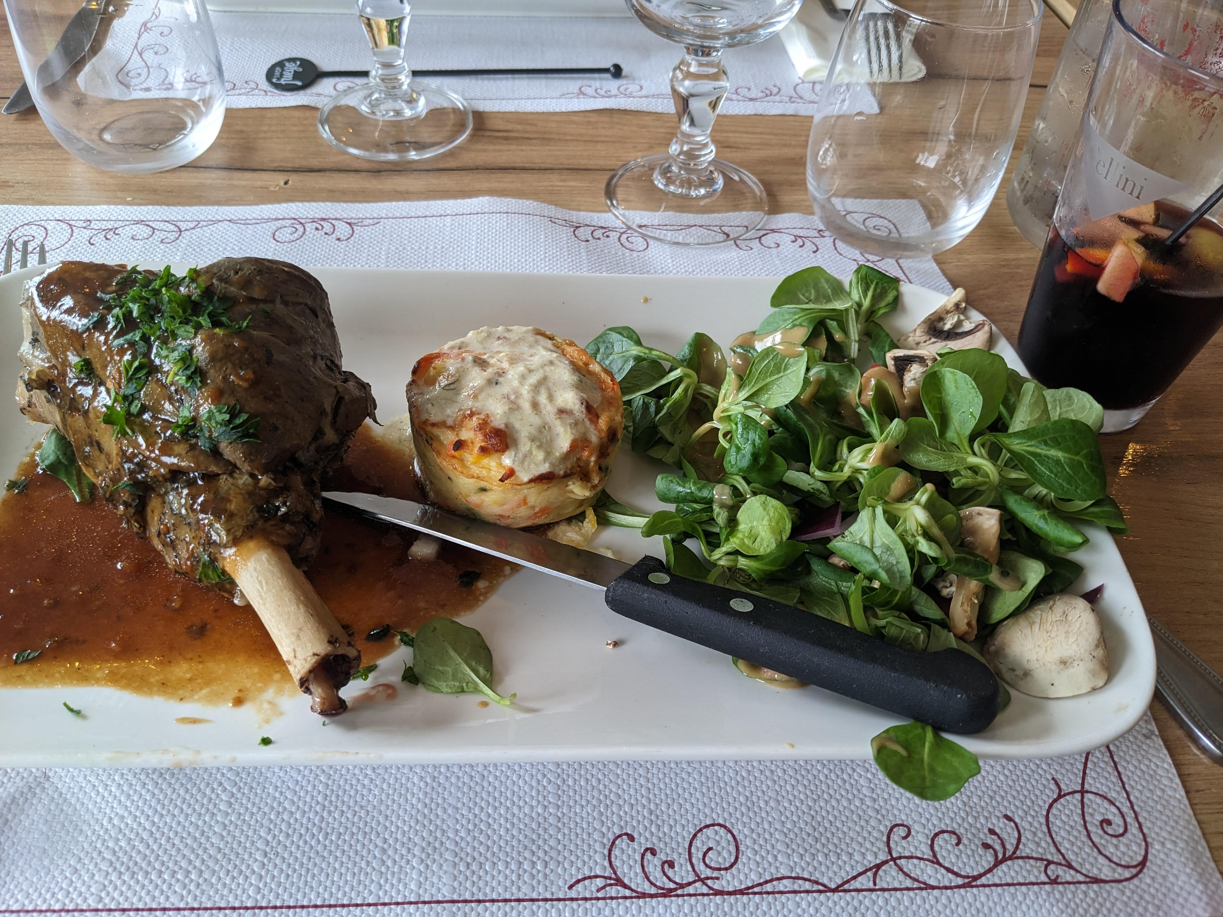Expérience vraiment décevante Le pain était dur, il devait être de la veille. Petite odeur vieillotte dans le restaurant. La souris d’agneau présentée par le serveur comme la spécialité maison était très moyenne, froide et sans goût. Néanmoins le serveur était sympa et la sangria réussie quoique petite.