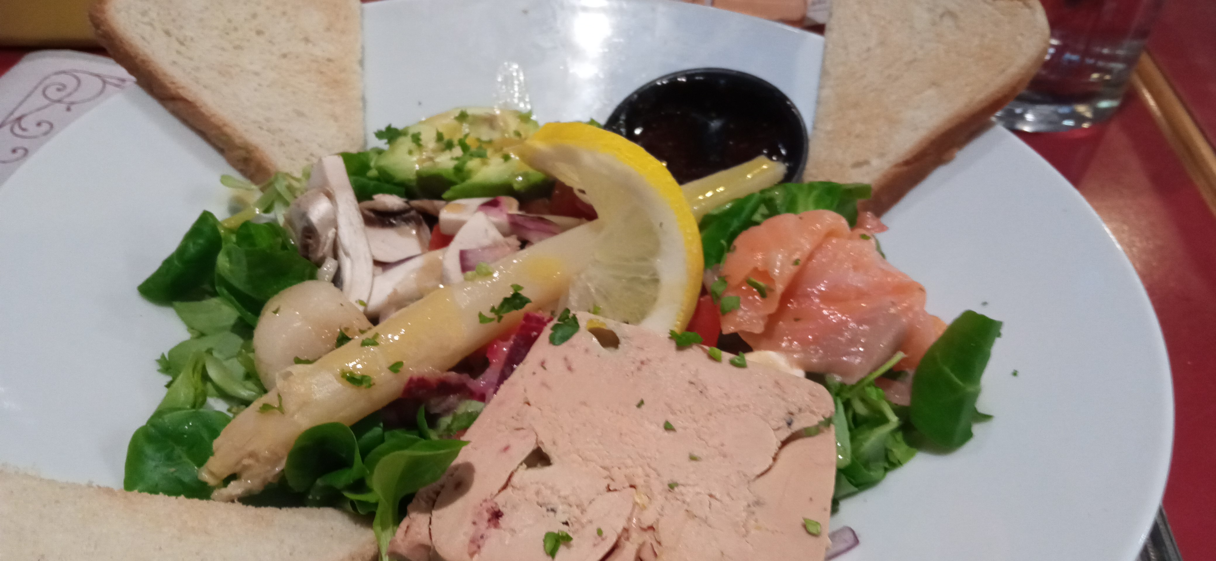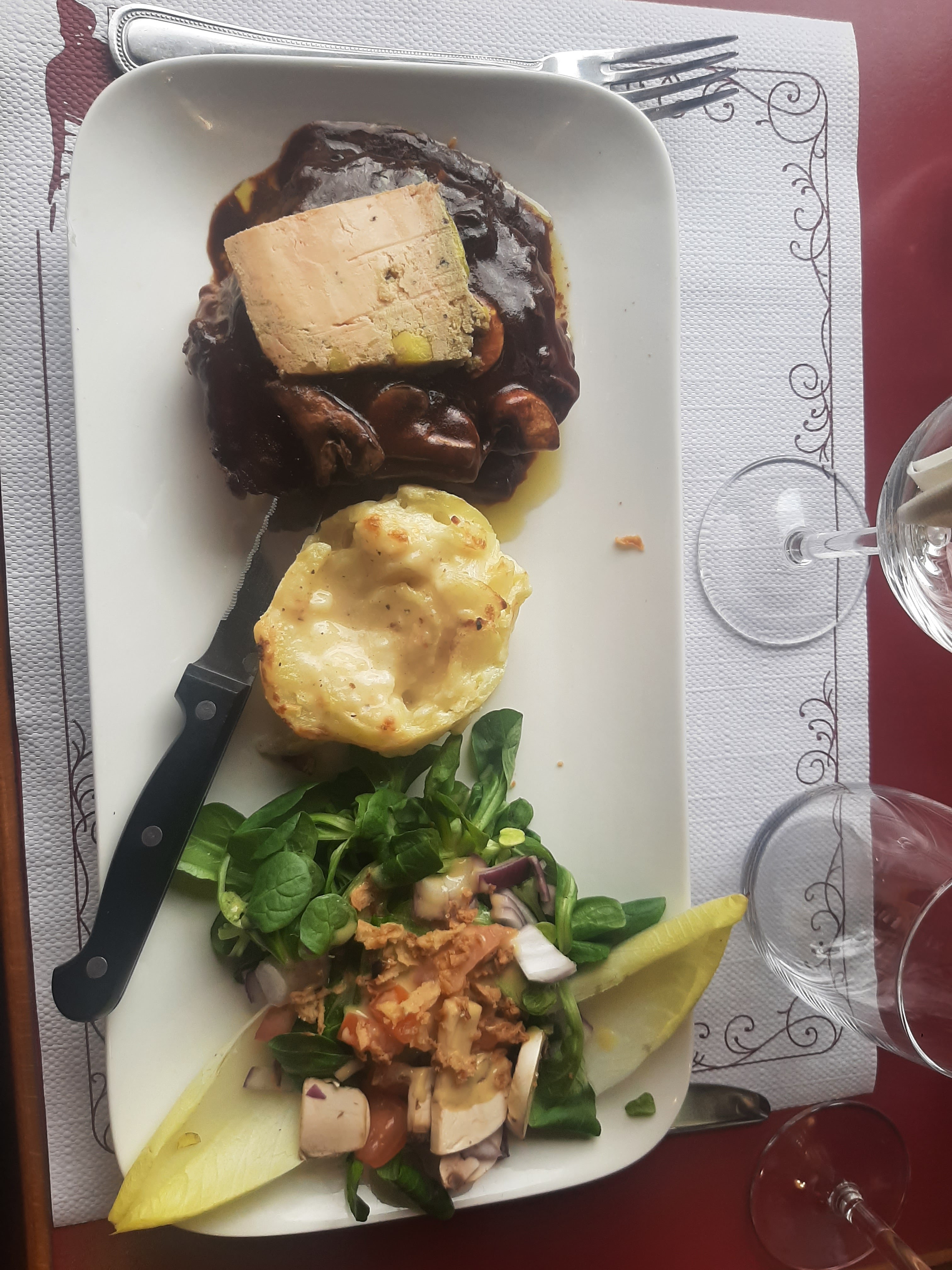 Le restaurant est bien situé, nous eu une superbe vue. Nous y sommes allés car ils avaient de très bon avis. Je suis mitigé en avis. Personnellement j’ai été très déçue par la qualité de la salade. J’ai pris une salade à 18,50 qui baigner dans la vinaigrette, le foie gras n’était pas bon … je prend des profiteroles en dessert les choux dure une impression qui date de la veille ? Franchement j’ai pas bien mangé et j’en ai eu pour très cher au vue de la qualité. Cependant, mon conjoint avait pris une entrecôte et n’a pas été déçue par la qualité de sa viande. En ce qui concerne le service ils ont été débordé, il me semble qu’il y a eu un imprévu en cuisine avec l’un des cuisinier… je pense qu’ils n’ont pas su gérer avec le stress car on l’a ressentis tout au long de la soirée. Nous y sommes peut être pas allé le bon soir dommage …
