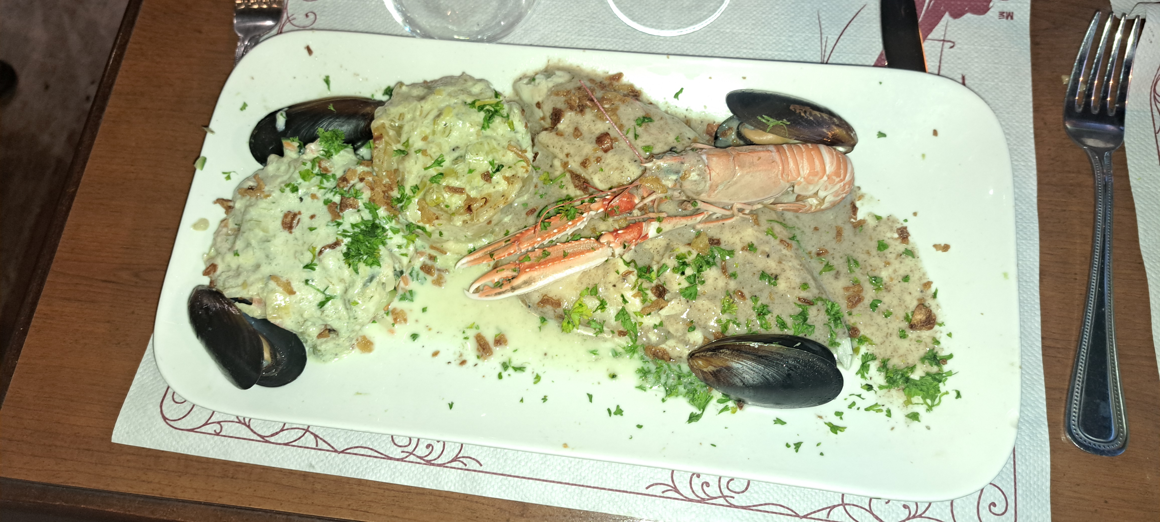 Méli mélo de poisson médiocre. Les encornets et les crevettes sont surgelés. Le poisson ainsi que la julienne de légumes et des pommes de terre trempent dans l'eau au fond de l'assiette. La plat est très fade. Je déconseille de prendre ce plat.