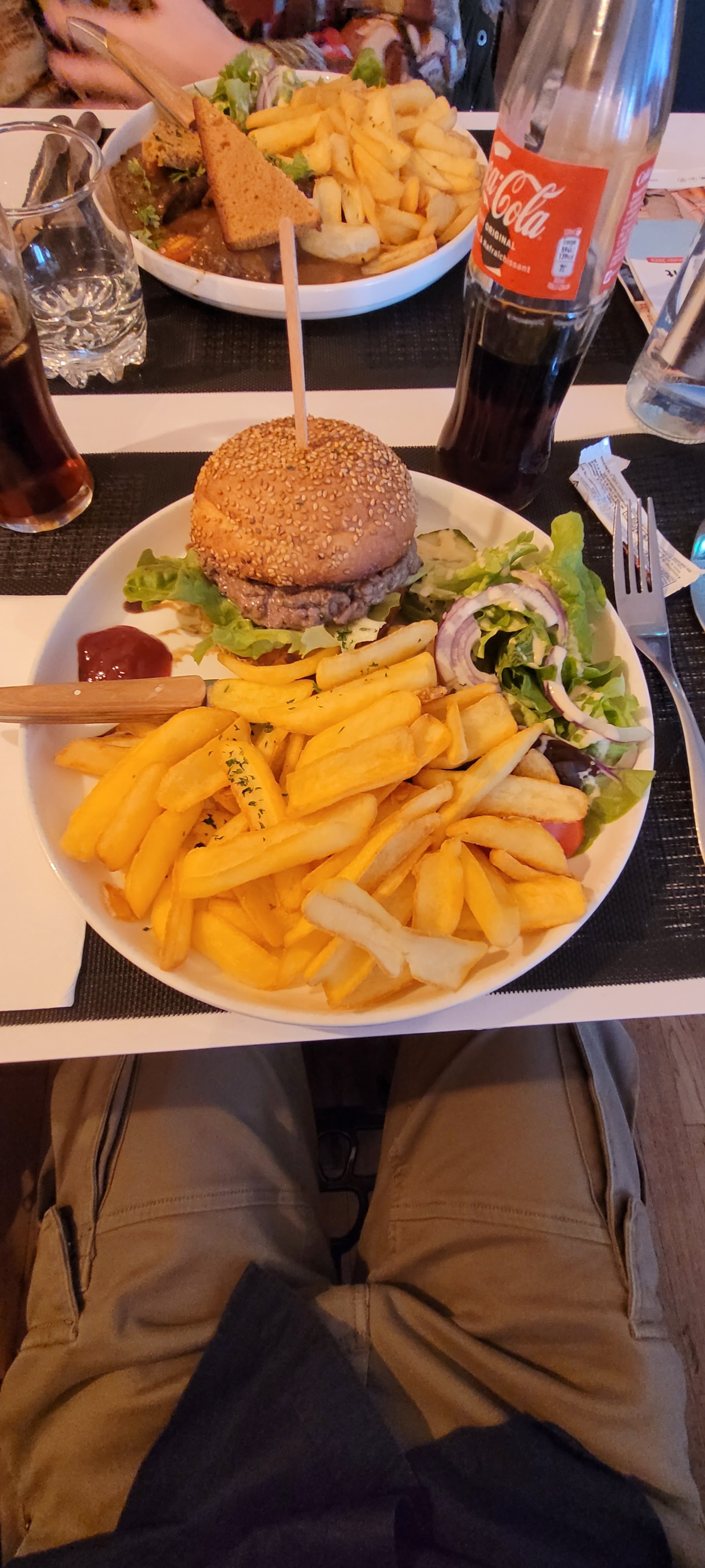 Personnel désagréable, 3 feuilles de salades (sans vinaigrette) dans l’assiette, serveurs lourds, on avait l’impression de déranger. Un soir de match : pas top