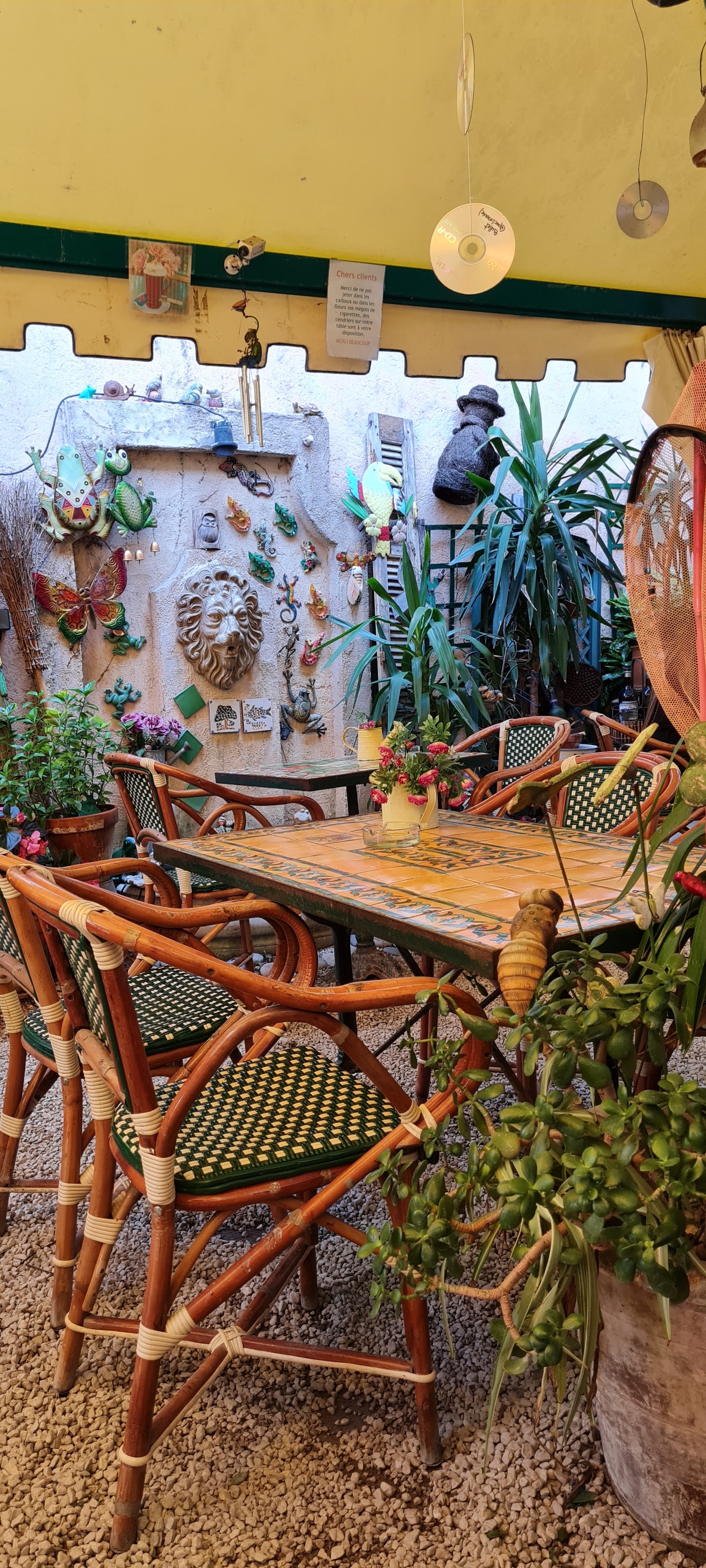 Terrasse interieure très sympa. Une ambiance originale et champêtre pour un coin de fraîcheur au cœur du vieil antibes. Personnel très agréable et service impeccable .
