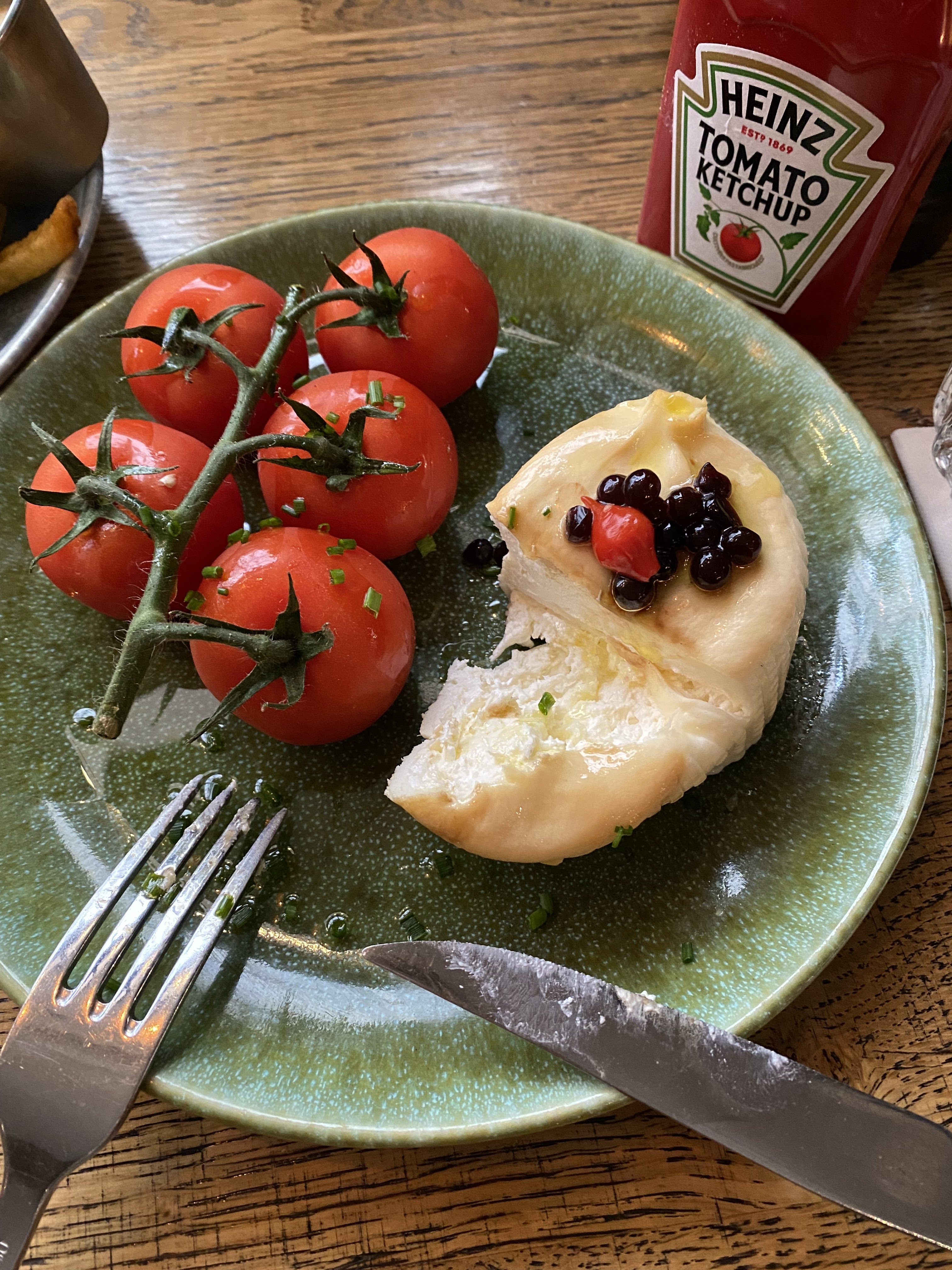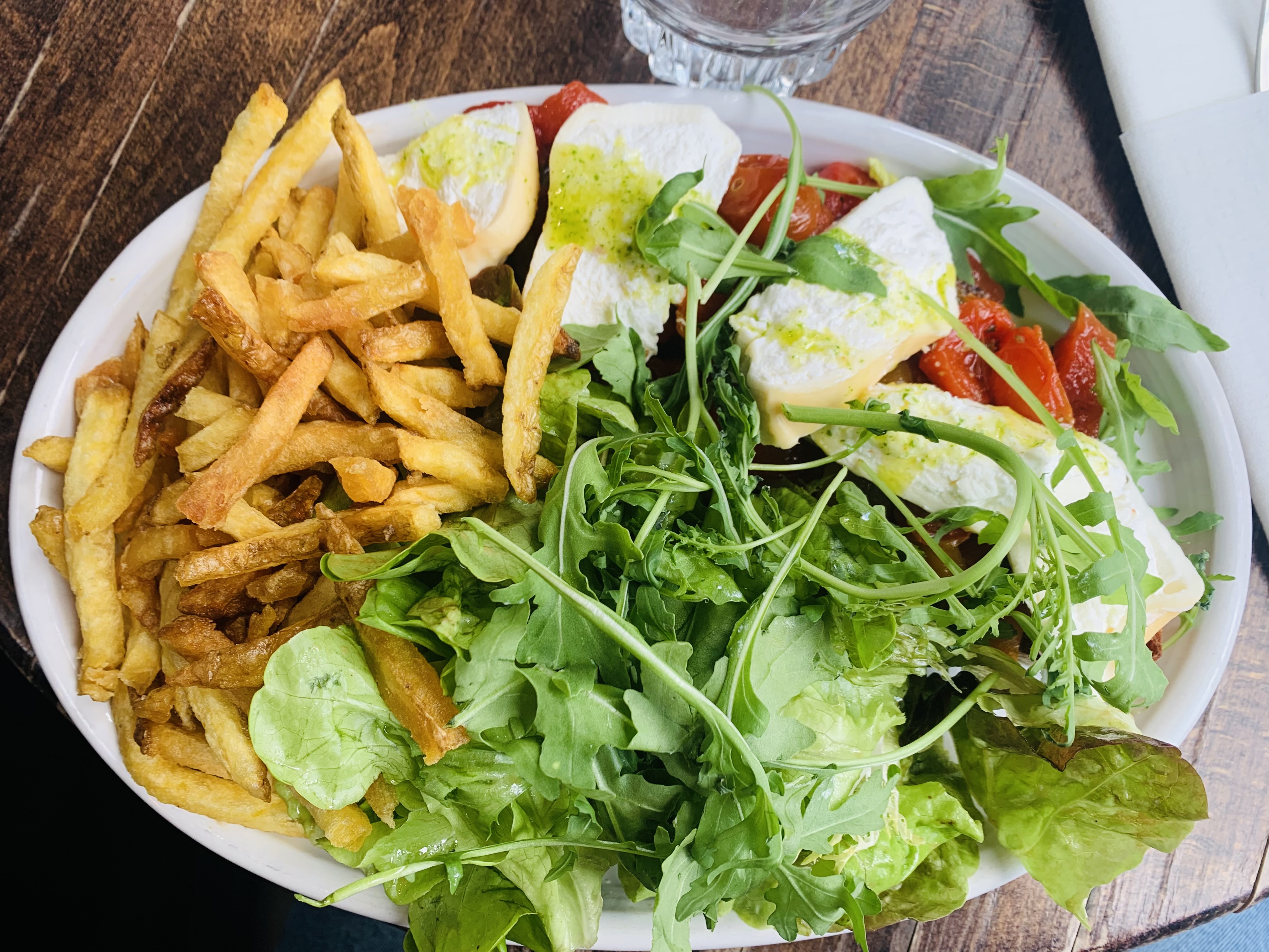 Burrata dur et degueulasse, servi avec des tomates comme ça! Les frites étaient bonnes. Mais ça veut pas le prix