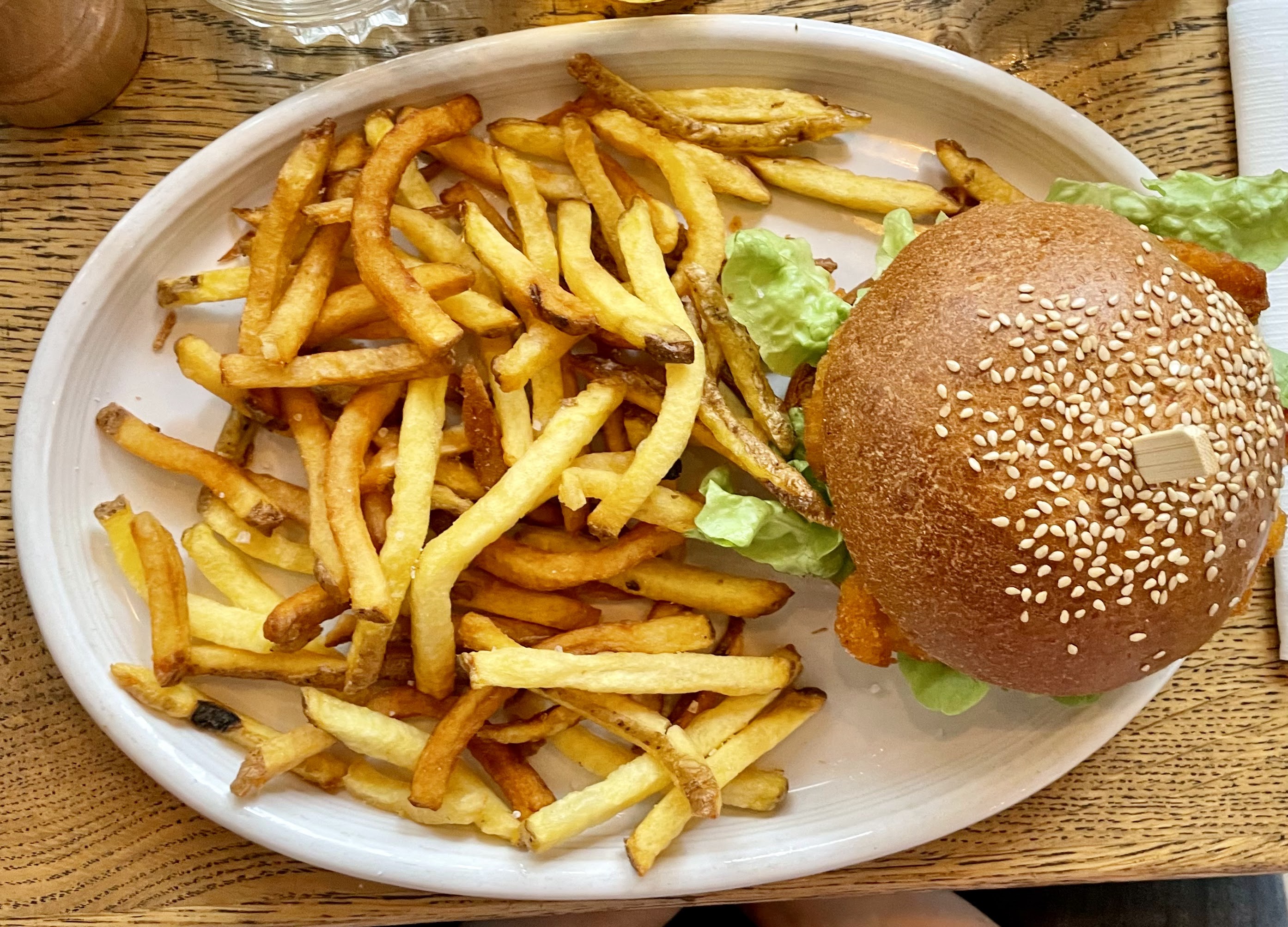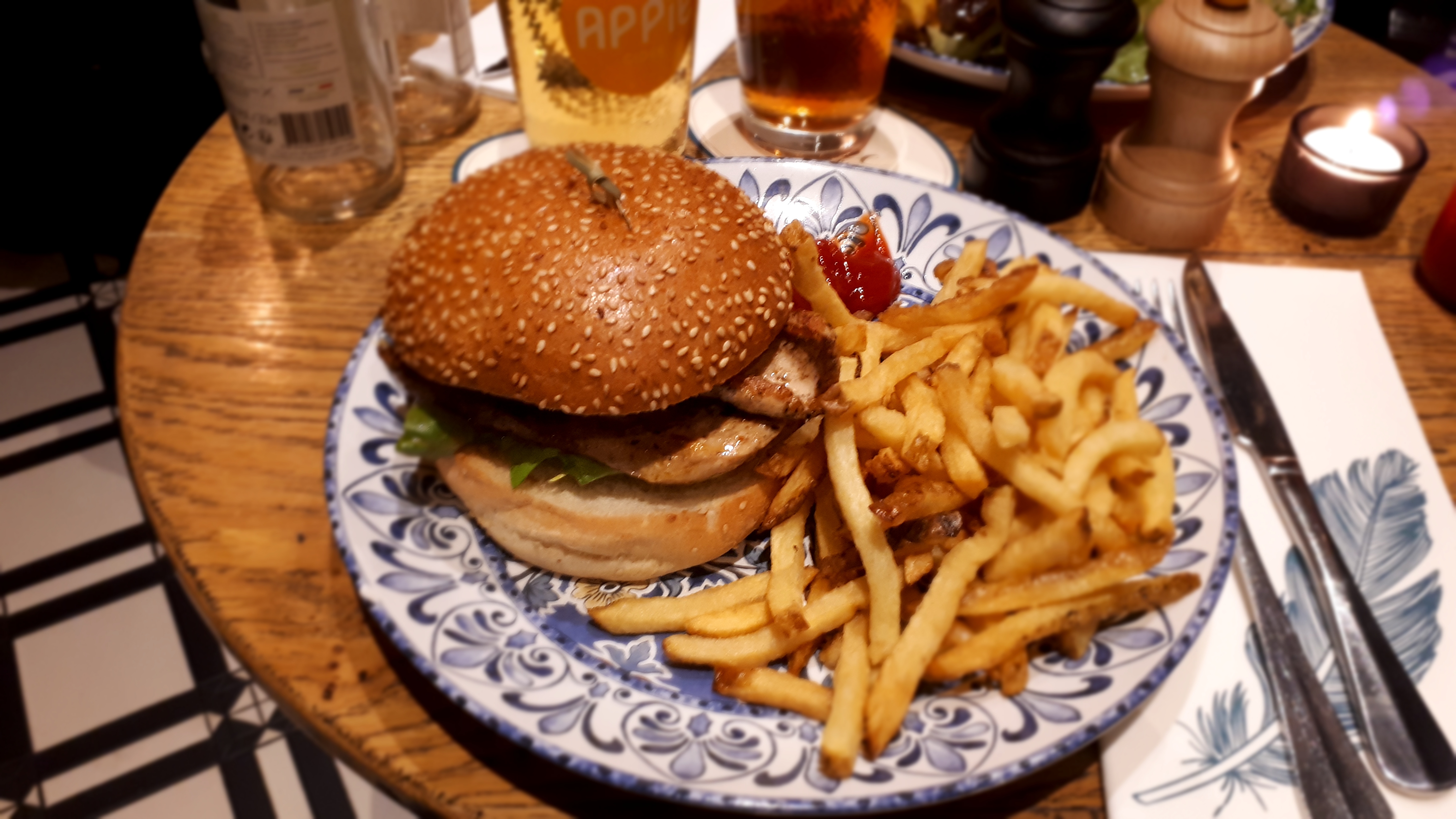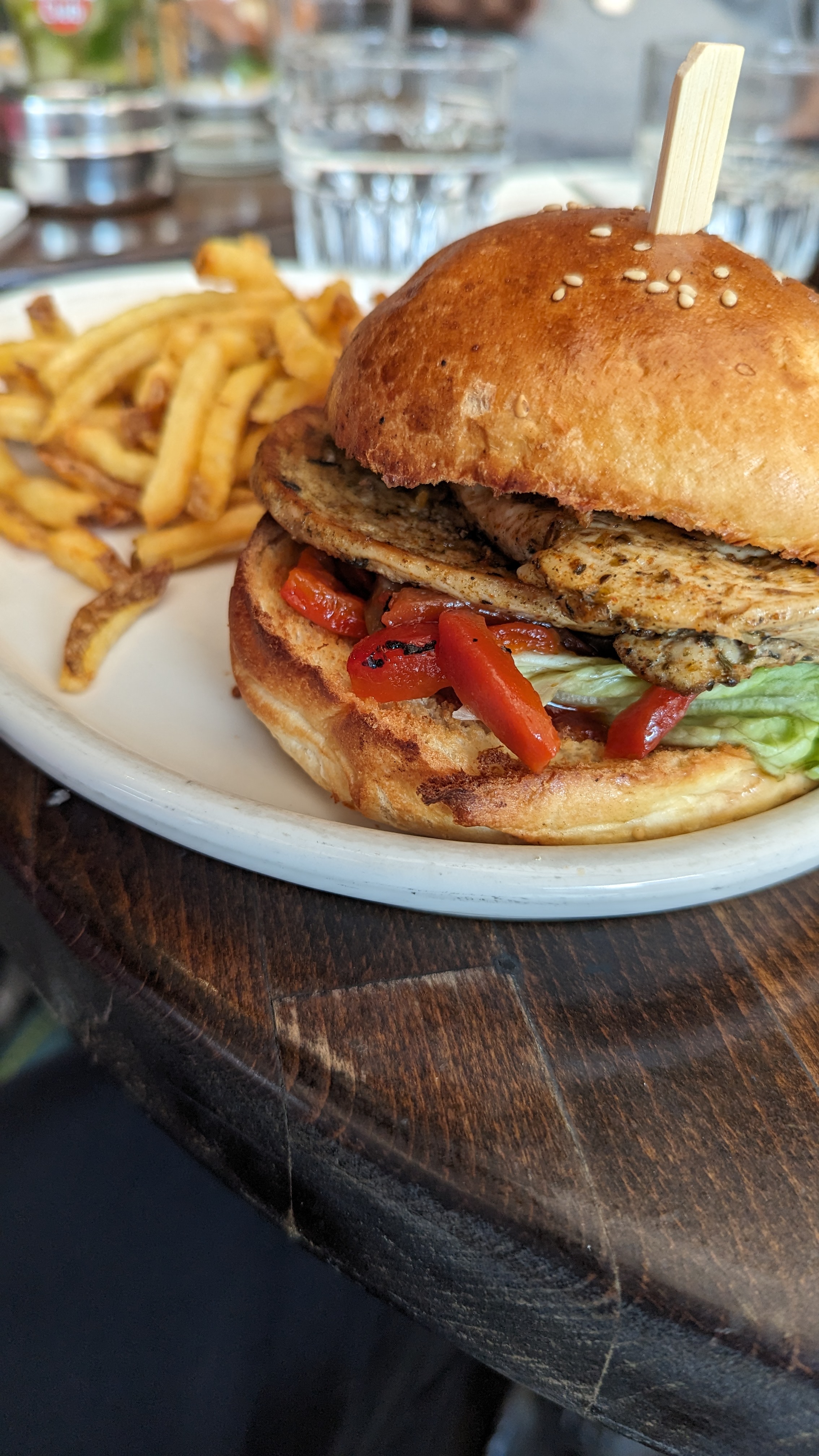 Le burger au poulet était délicieux. Les frites étaient un peu trop cuites et il a fallu 10 à 15 minutes au serveur pour revenir avec du ketchup - le restaurant n'était pas très occupé. Mon groupe a commandé un dessert après le repas principal et nous avons dû nous renseigner avant de l'apporter à la table.