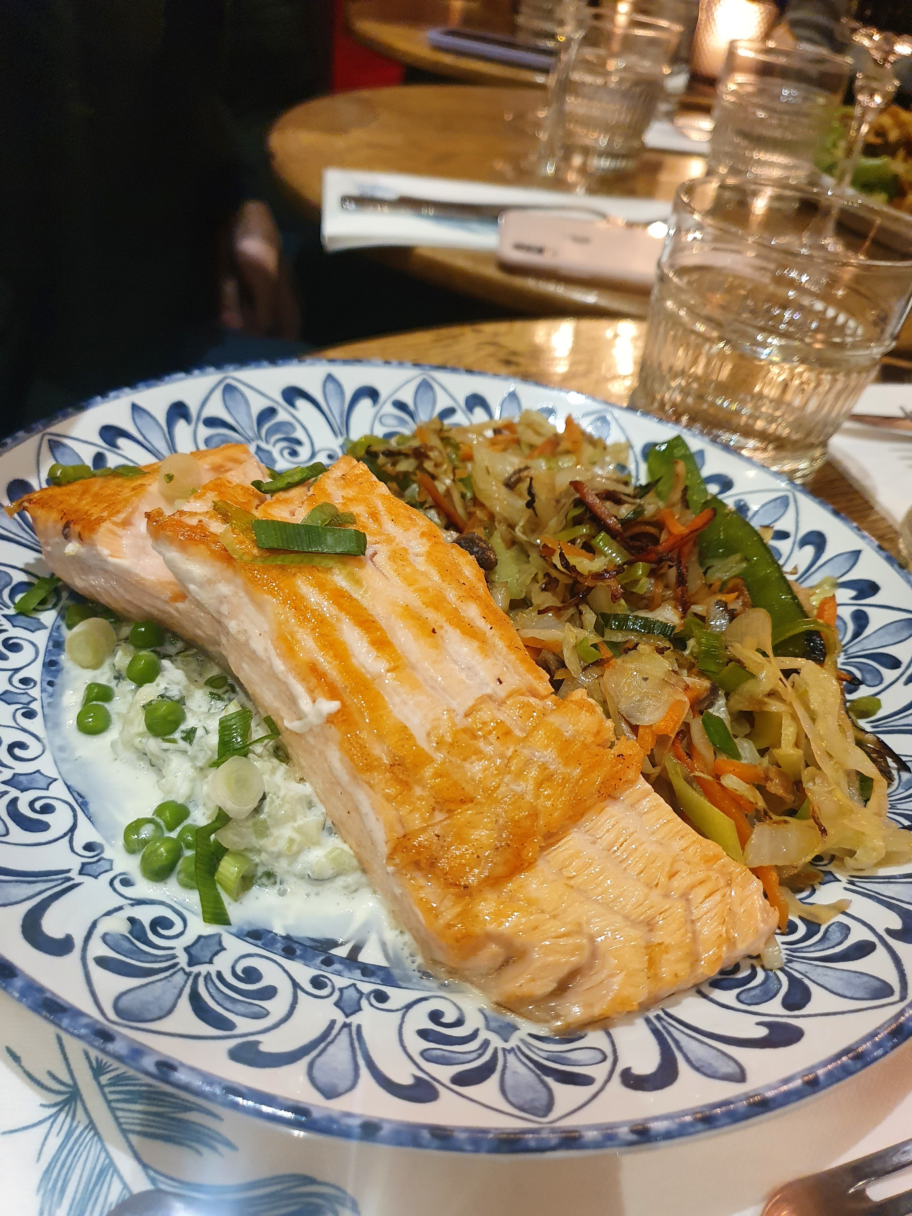 Ambiance bistro a la fois authentique (deco, style vestimentaire et allure des serveurs) et elegante, le service est efficace. La bonne surprise vient du contenu de votre assiette : saumon Gravelax affine, gratin dauphinois savoureux, viandes tendres, desserts gouteux. Parfait pour un dejeuner parisien elegant/business