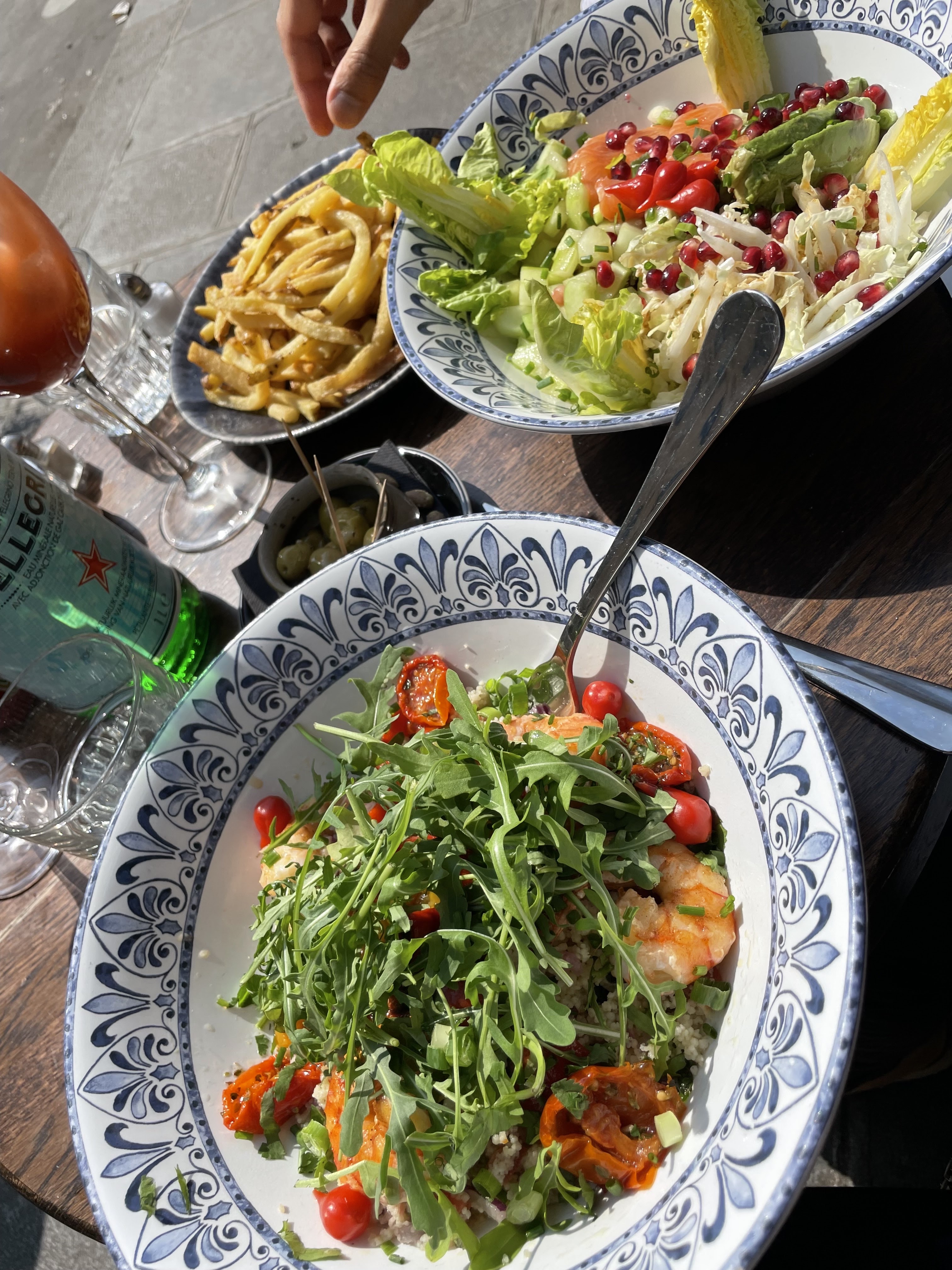 Service sympathique et rapide. Beau soleil de midi dehors. Avec salades fraîches, quinoa et couscous. Les prix sont bons, normaux pour le centre de Paris.