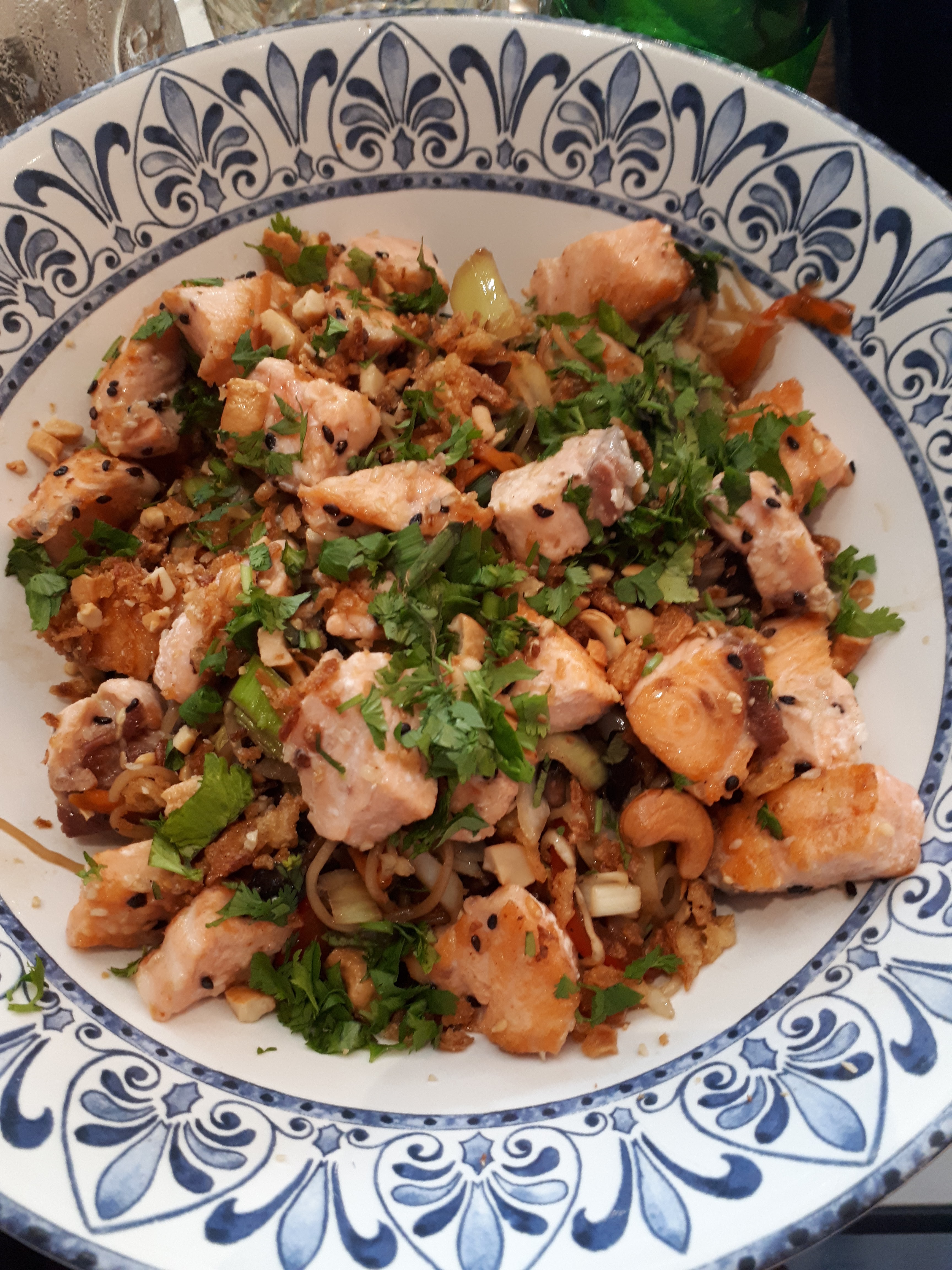 Je me suis régalé avec le wok au thon ,mais sans coriandre car cette plante a un goût très fort qui selon moi couvre le goût des autres saveurs