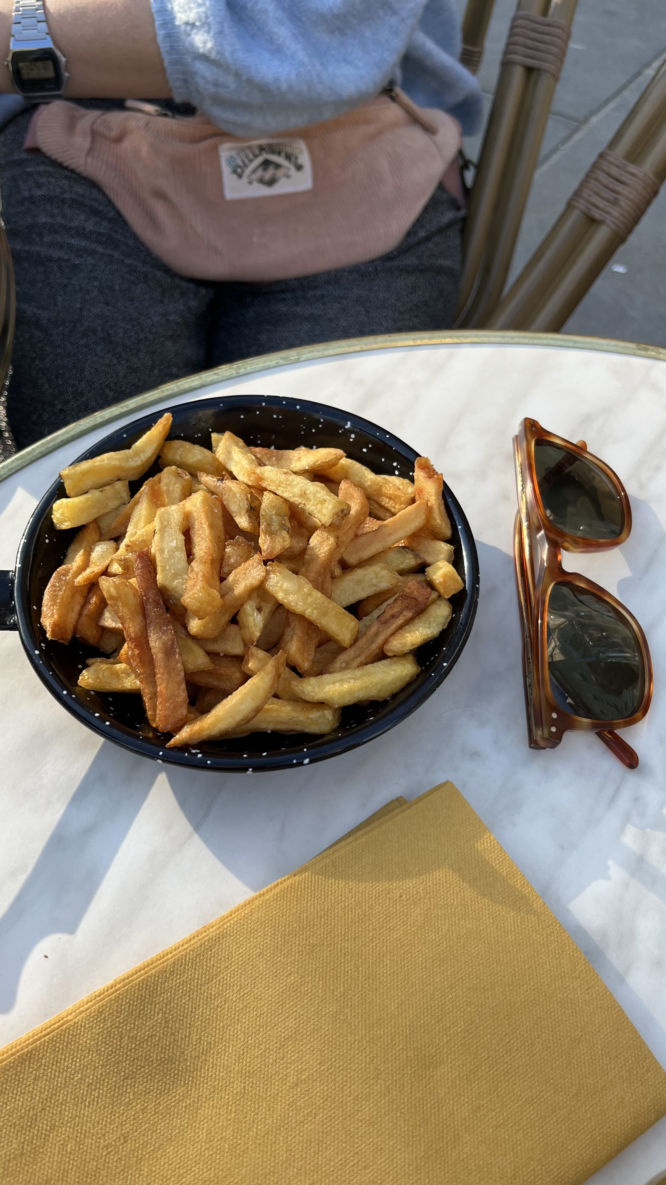 Après plusieurs bonnes expériences pour boire un verre en fin d'après-midi, hier rien n'allait : On a attendu plus de 20 min pour qu'un serveur vienne prendre notre commande; et c'est nous qui lui avons fait signe. Peut-être ça lui a déplu, car impossible d'avoir le moindre sourire et le ton était plutôt sec. Bon, à la rigueur, il y avait beaucoup de monde, et tout le monde a le droit de passer une mauvaise journée, donc on ne lui en tiendra pas rigueur pour cette fois-ci. Par contre, ce qui est inexcusable, c'est le bol de frites que nous avions commandé. Ce n'est pas un bol mais plutôt un ramequin, d'une taille purement scandaleuse (cf photo, j'ai mis mes lunettes de soleil à côté pour l'échelle). Si encore ce bol était vendu à prix raisonnable, pourquoi pas, mais à 6€ il faut arrêter de se moquer du monde. Donc soit vous le vendez moins cher, soit vous augmentez drastiquement les quantités. On reviendra probablement boire un verre en espérant avoir plus de chance niveau service, mais on n'y mangera certainement pas (un petit tour à la boulangerie de l'hôtel de ville sera bien mieux)