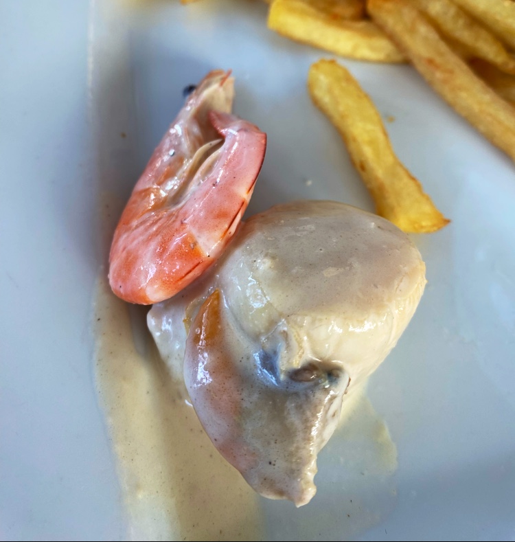 Je vous conseille la cassolette de Noix de St Jacques. 3 grosses St Jacques avec une crevette et un peu de poireaux et de champignons, avec une super bonne crème Normande avec des frites délicieuses. Les plats sont arrivés bien chaud par le serveur qui fut très gentil. Déception par contre pour le pain perdu…