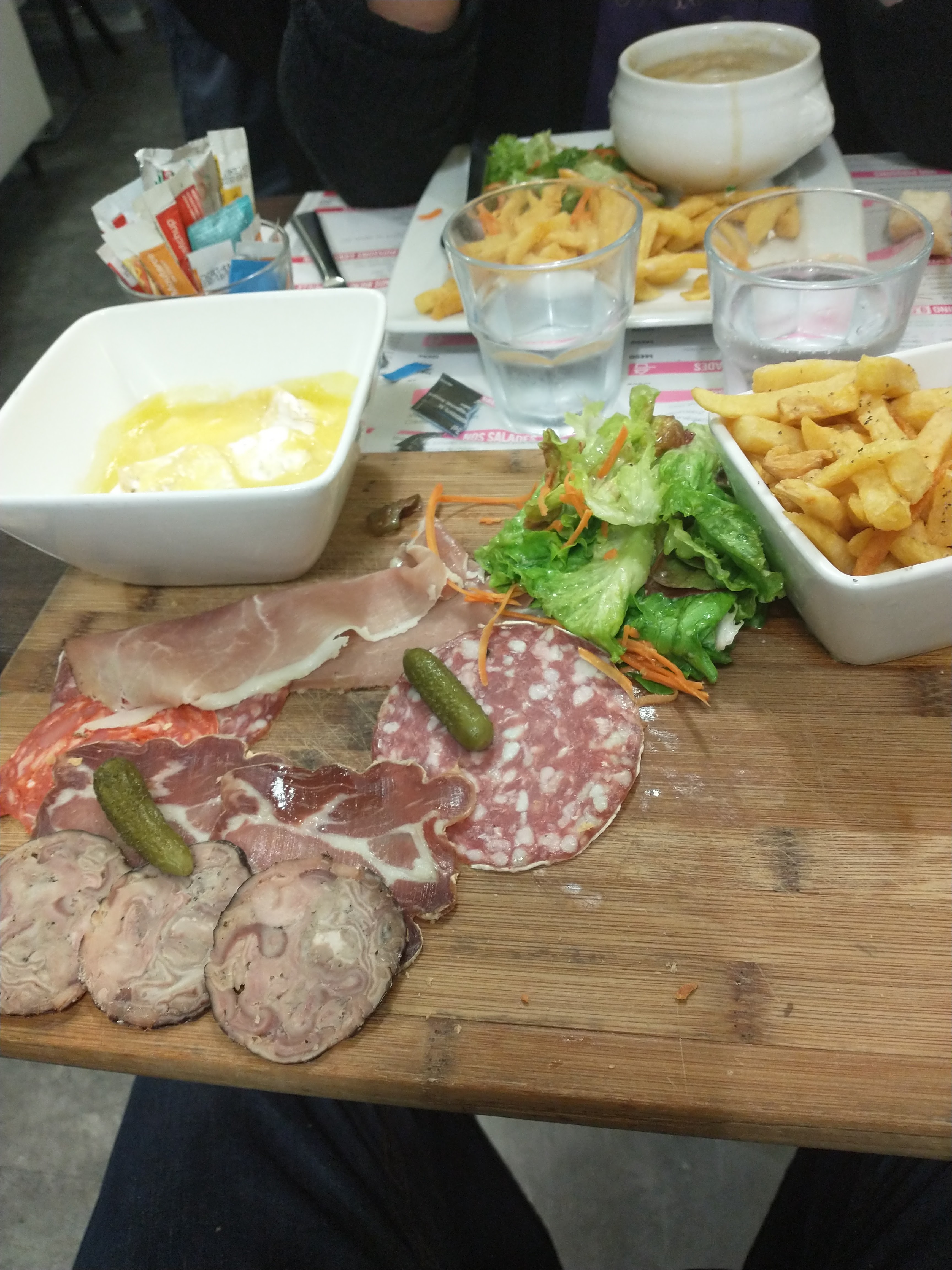 Pour commencer nous sommes arriver à 12h nous avons attendu 10 minutes pour que un des 4 serveurs viennent nous voir sachant qu'il tournait en rond et qu'il nous regarder ensuite pour l'entrée on a attendue 20 minutes pour 5 boues de saucissons ensuite pour le plat nous avons attendue 30 minutes pour 2 malheureuse paupiettes avec 3/4 frites! Franchement c'est des radins en pomme de terre sachant que ça leur coûte pas très chère.