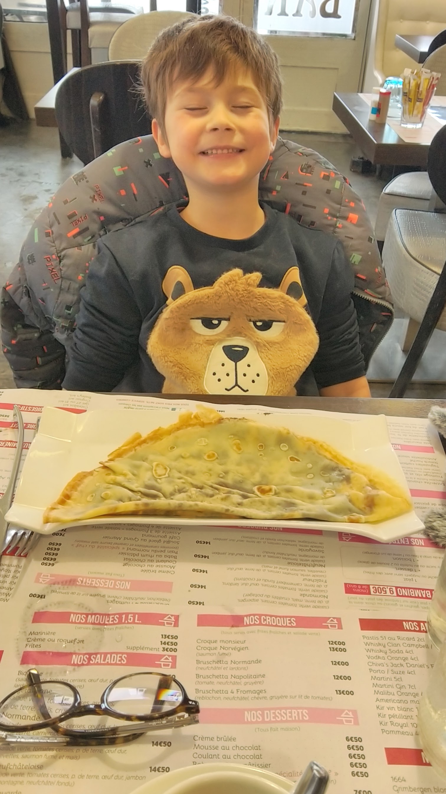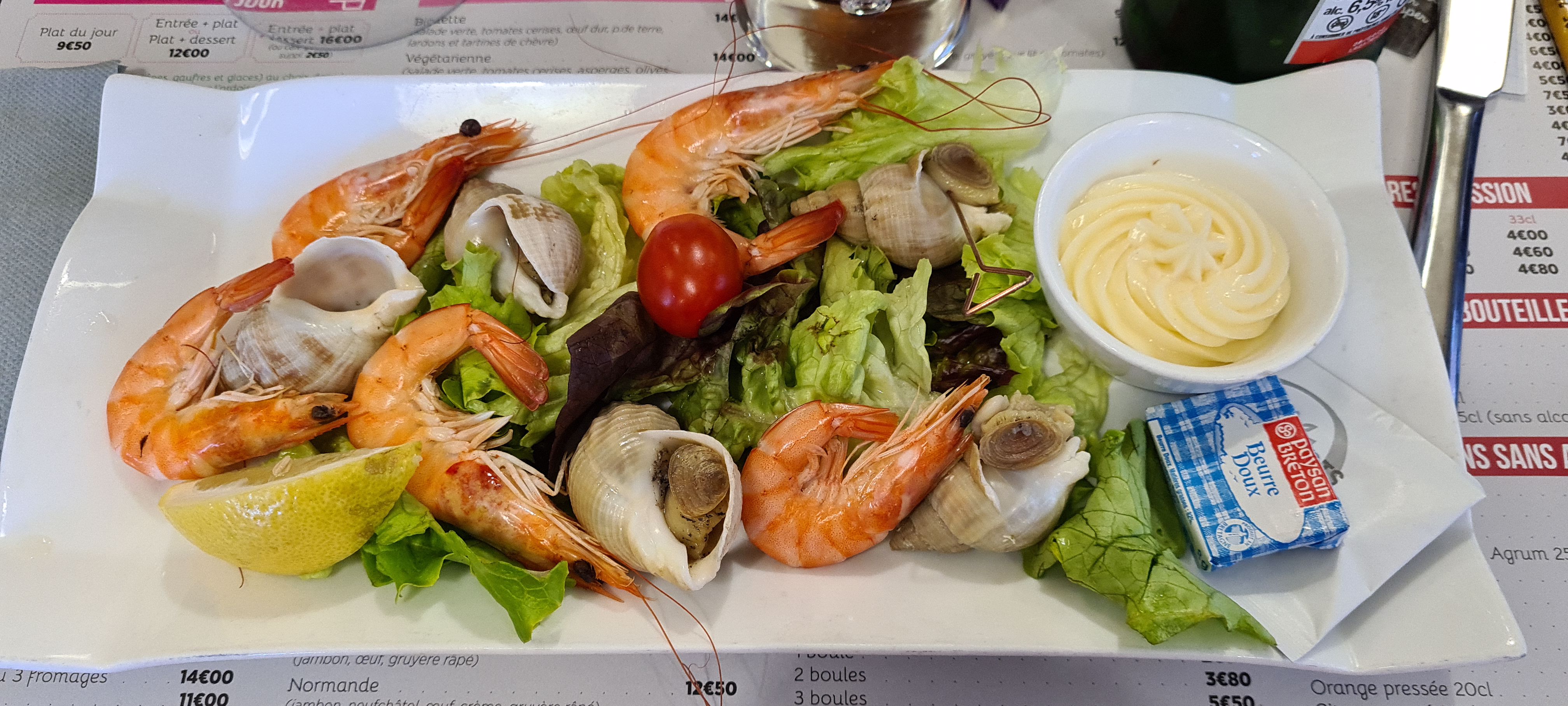 Une assiette fraîcheur qui porte bien son nom : saumon, crevettes, salade croquante...un délice et une assiette très garnie. Mon petit fils a dégusté une crêpe 🥞 au Nutella ou plutôt du Nutella à la crêpe. Accueil agréable, souriant et serviable. Merci