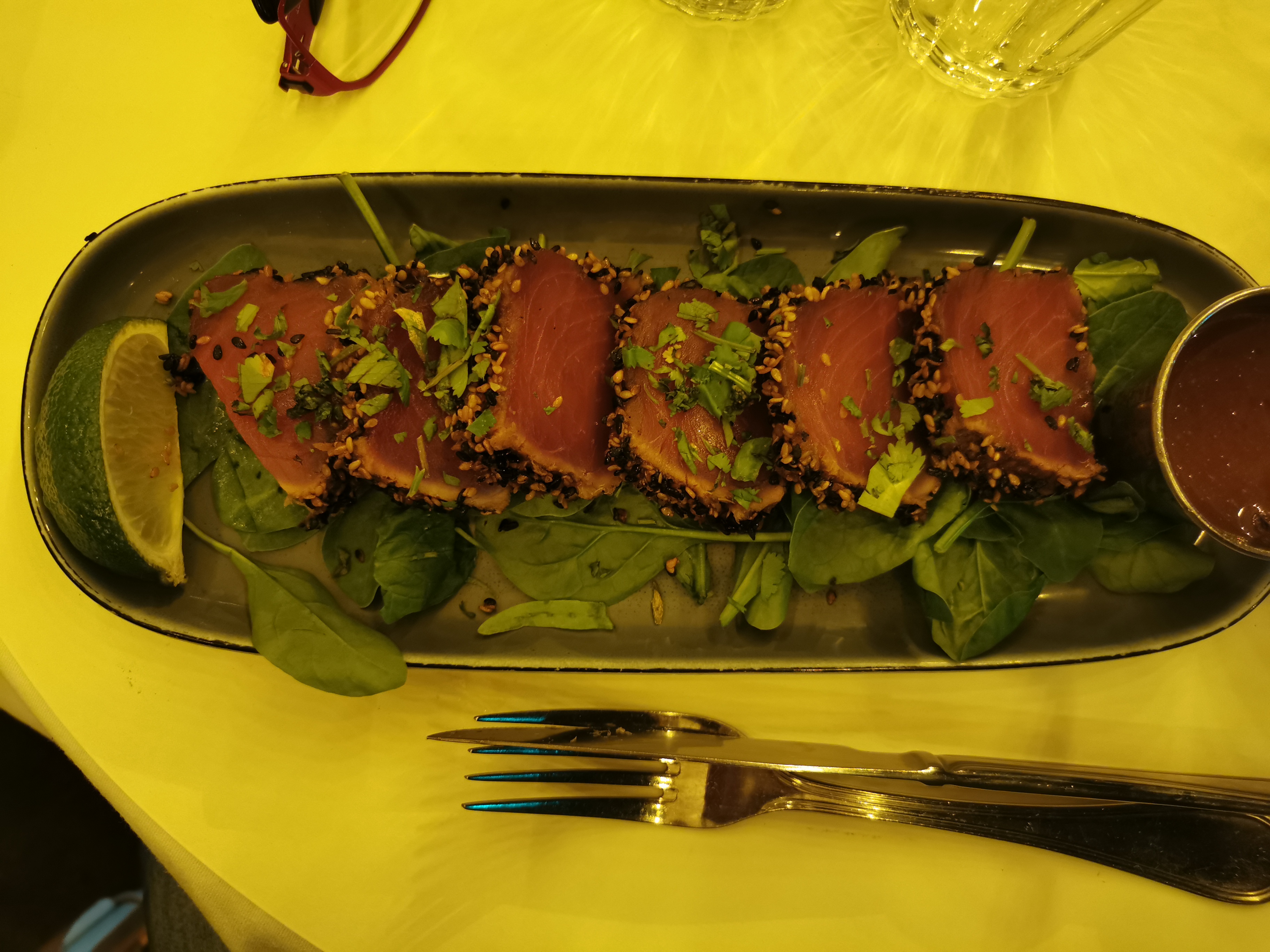 Un dîner léger après l'entraînement de volley-ball et... une très bonne surprise. Notre resto habituel de 3ème mi-temps nous ayant refusé, faute de place... nous étions à la recherche d'un restaurant à 22h30 en semaine... Pas gagné. Nous sommes arrivés au Campanella où l'accueil a été très sympathique, la cuisine toujours ouverte et la carte assez variée. Pour ma part, après la traditionnelle bière (3ème mi-temps oblige ! Il faut du houblon pour les muscles !! 🤪🤣), j'ai commandé un tataki de thon et un verre de Bordeaux et je me suis régalé ! En plus le rapport qualité prix est raisonnable, bref une très bonne adresse !
