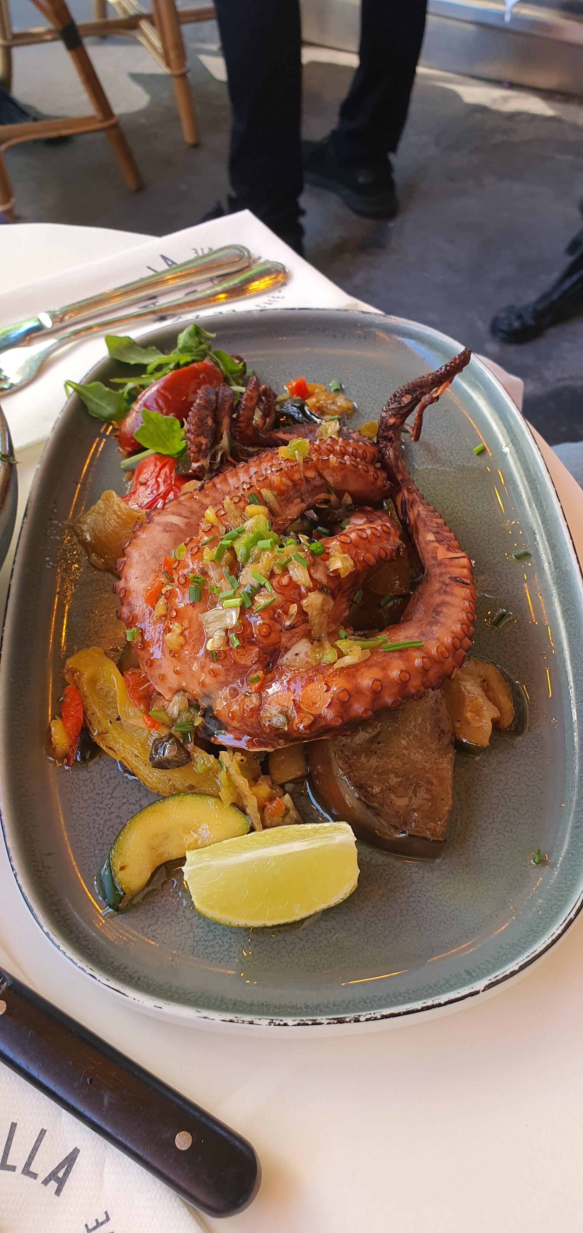 Très beau restaurant, ambiance sympa, et service assez rapide. J’ai pris un poulpe snacké : très bon et copieux mais j’avoue que je n’ai pas vraiment apprécié l’assaisonnement dans lequel baignait le plat, qui le rendait assez lourd. Mon ami a pris un rumsteck, qui était tiède mais très bon avec une sauce excellente ! C’est un bon restaurant, aux prix très corrects :)