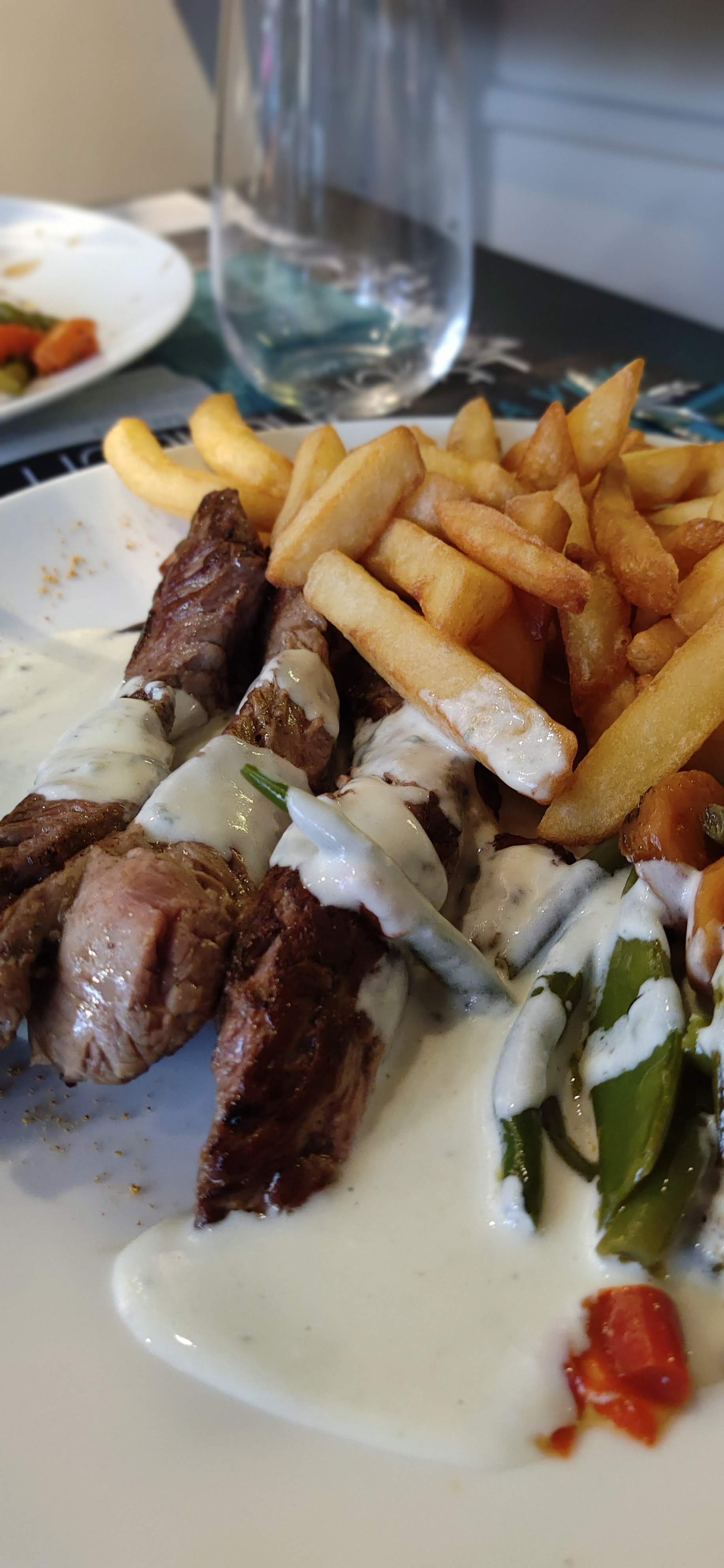 Dommage pour les sauces en stick. Plat pas chaud et serveurs pas trop à l'écoute. Il à fallu les interpeller plusieurs fois, pour du sel, de l'eau, du pain cela fait beaucoup trop de demande. Pendant qu'un collègue fumait tous les 1/4 h. Plat pas chaud et viande sans saveur, des sauces maison serait les bien venue avec la viande rouge.