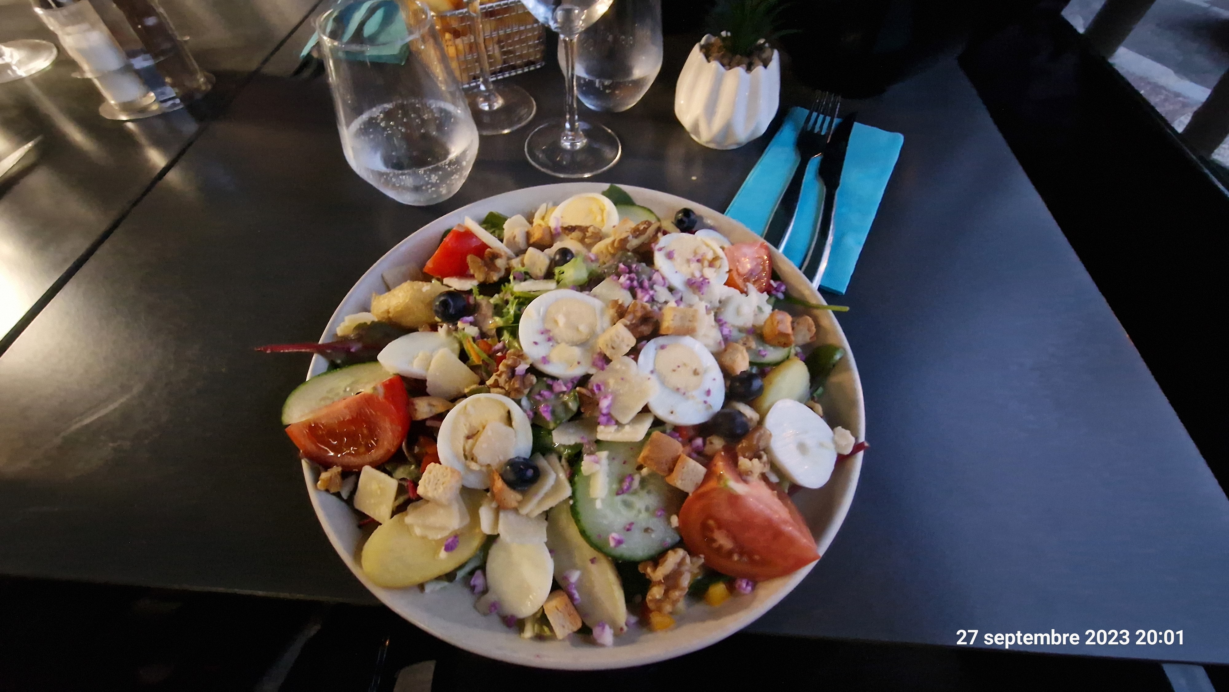 Nous avons commandé 2 salades, Mr Le directeur nous ne sommes pas à la cantine du coin, la salade verte tout droit sortie d'un sachet du supermarché, sans vinaigrette, les tomates complètement dur et semi-congelée, le saumon aucun goût, une honte pour votre restaurant, la serveuse nous a apporté de la vinaigrette, blanche façon industrielle, ce n'est pas de la cuisine, mais un assemblage très basic d'aliments industriels, nous vous avons fait part de notre mécontentement et vous nous avez tourné le dos, nous aurions du regarder les commentaires sur Tripadvisor, car visiblement nous ne sommes pas les premiers très mécontents.