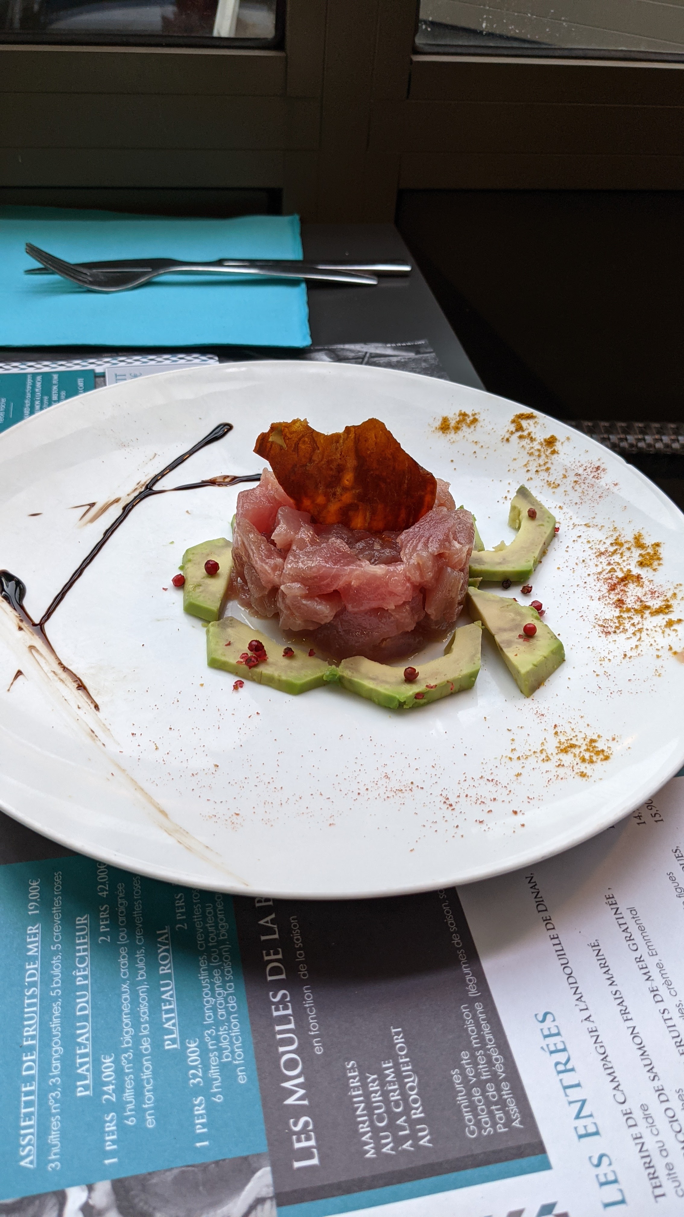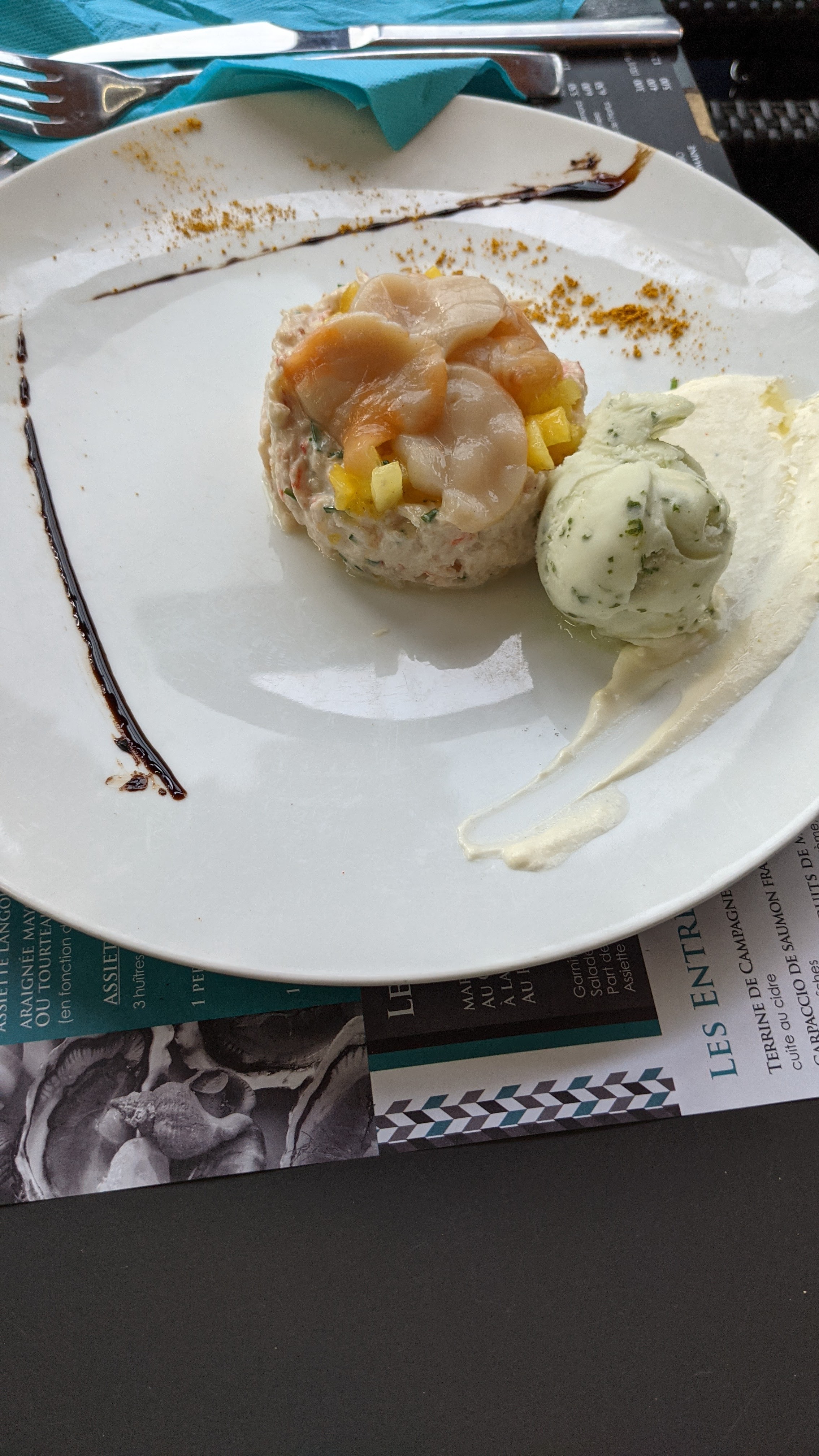 J'ai pris un tartare de thon rouge qui étais succulant bien présenté Ensuite un burger de Saumon grillé avec des frites maison et ils ont même mit des petites feuilles de salade et des petites crevettes roses dans le burger enfin pour le dessert une super belle île flottante ! Pas du tout déçu pour mon petit séjour en Bretagne