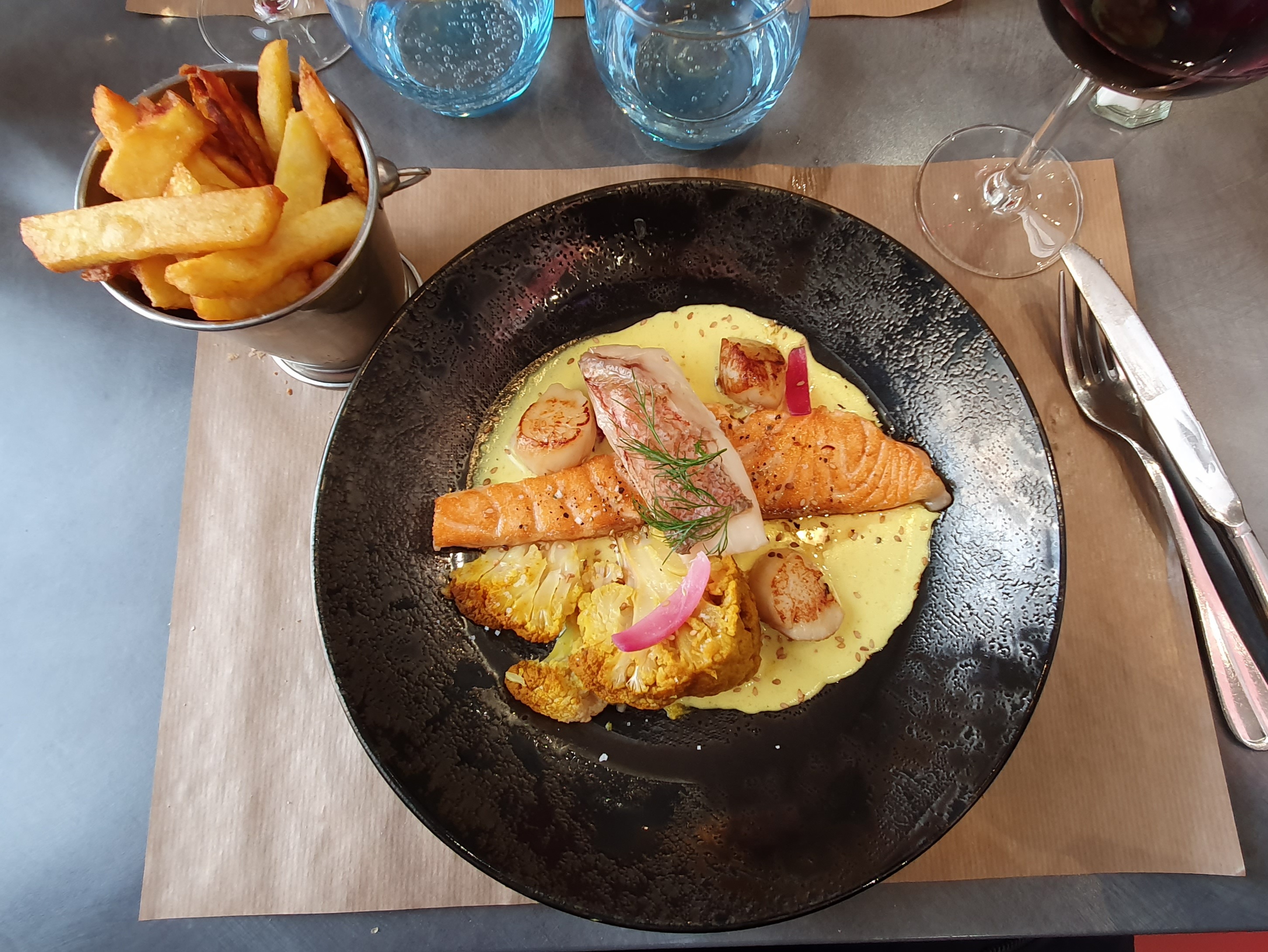 En arrivant je pensais avoir à faire à un pub. Mais on m’avait conseillé l’adresse , alors je me suis laissé tenter et j’ai eu raison . J’ai demandé à être en terrasse avec les beaux jours . Contrairement à ce que l’on m’avait dit, ce n’est pas trop bruyant. Certes il y a un peu de passage , mais rien de bien gênant . La carte propose différentes formules , avec des menus mais aussi des assiettes façon plancha , ou spéciale saumon, etc… Pour ma part j’ai opté pour l’assiette tout saumon . Pour 18 euros , vous aurez une belle assiette avec du saumon gravelax, en brochette , en tartare et en filet fumé . Le tout accompagné de frites maison. Un excellent rapport qualité prix pour une assiette vraiment très bonne Vins à prix corrects Service très agréable . La patronne et très agréable et souriante Place de parkings gratuites le soir du moins ( emplacement bleu en journée) En résumé une bonne adresse , avec des tarifs corrects