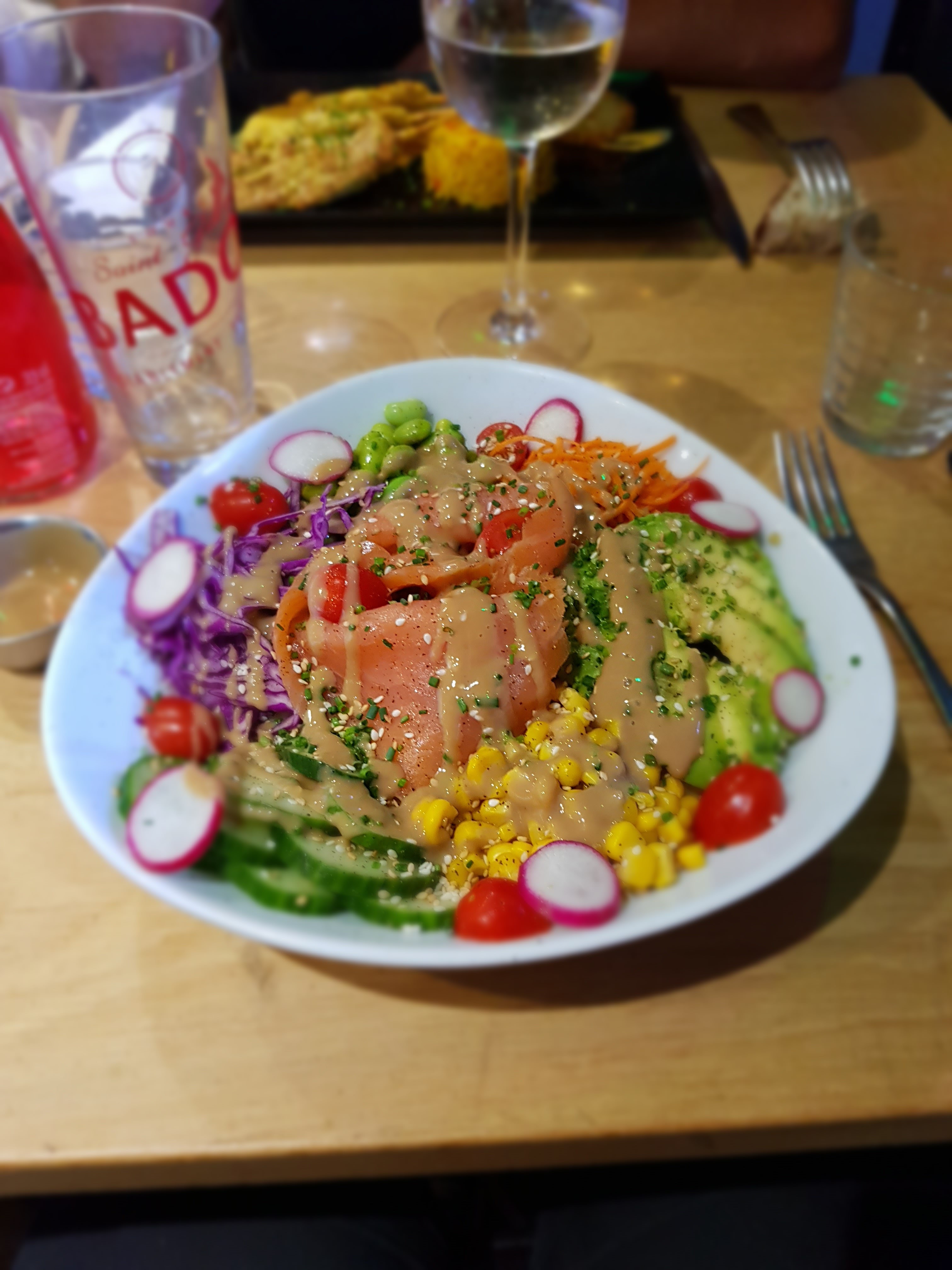 Accueil sympa et rapide. Bonne ambiance, serveuse aimable, souriante. Tapas d'apéro copieux (houmous, poivrons farcis et fromage) et bons. Très contente de la salade océane (bien garnie de saumon et crevettes). Sauce à revoir pour moi (ça n'est qu'une question de préférence, elle est bonne mais un peu compacte et manque de peps). Très bonne soirée avec le duo musical 😊