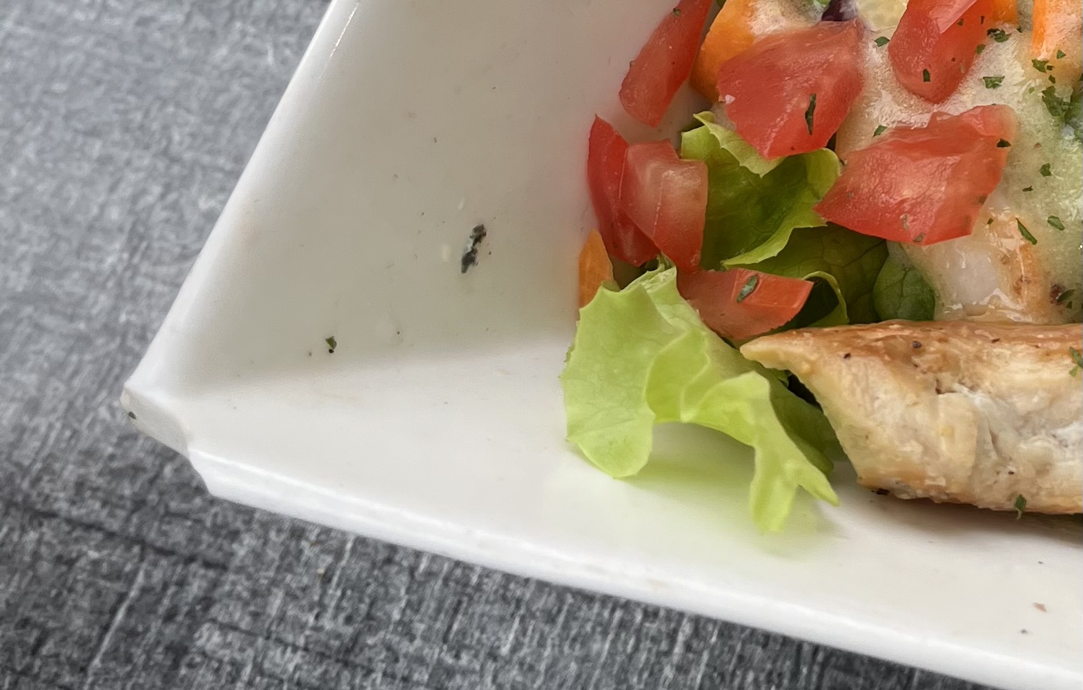 On nous a servi pour plat principal trois morceaux d’escalope de poulet desséché, cramé avec une sauce crème et des champignons qui eux aussi étaient réduits à l’extrême.