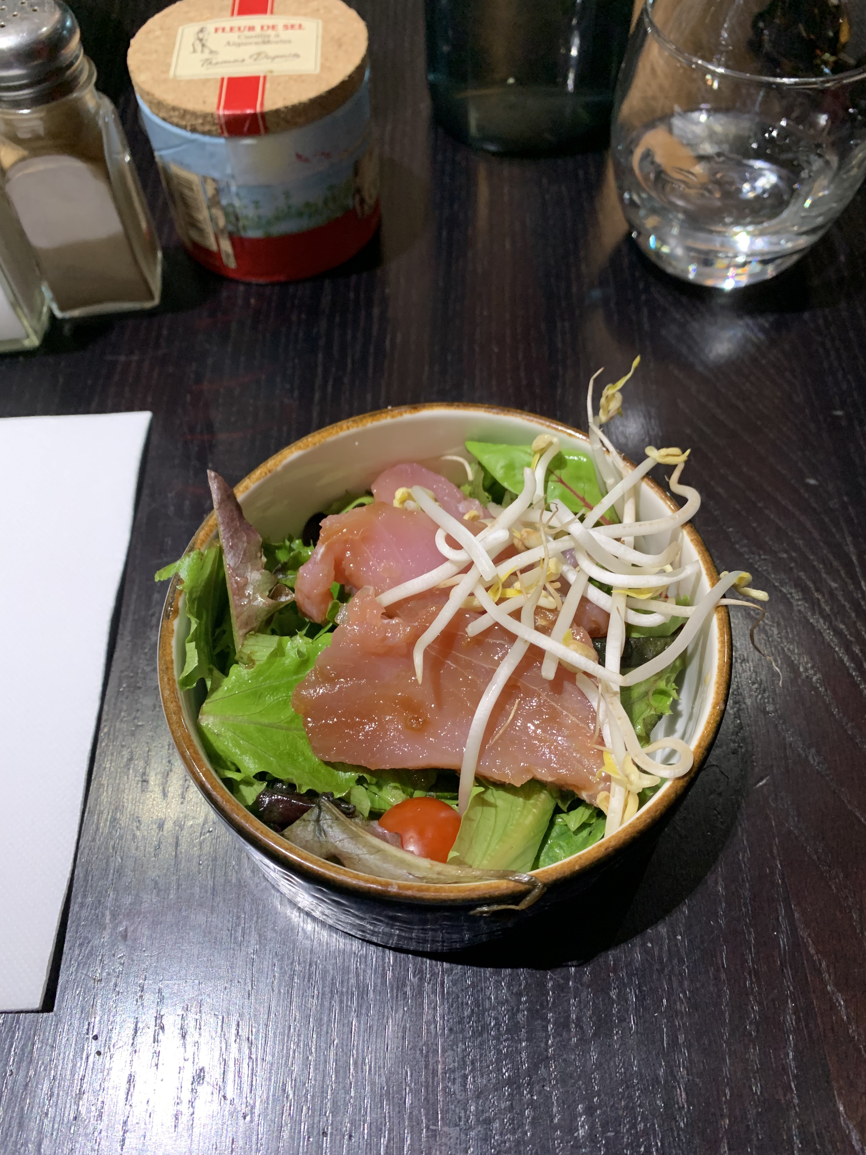 Nous avons déjeuné ce jour à l intérieur en plein courant d air🥶 nous avons commandé 2 verres de blancs (remplissage tout juste au 1/4) nous avons demandé cacahuette ou autre! on nous a dit non y en a pas! pas de formules non plus alors qu elles trônent sur les ardoises à l extérieur! Donc Tout à la carte!!!! tartare bœuf correct mais sans plus!et Poke bowl saumon et crudité (salade jaunie et riz tout juste cuit limite craquant) le tout fade! Le dessert était bon Banofee! Accueil froid! mobilier pas clean et trop serré, ambiance cantine scolaire! Bref pour nous, ce n est pas ce que nous attendons pour passer un bon moment nous regrettons notre argent, c était le début d un long we nous voulions nous faire plaisir et passer un bon moment c est raté! Le patron fait les 100 pas devant la porte!!!! cela aurait dû nous alerter à notre arrivée 😂