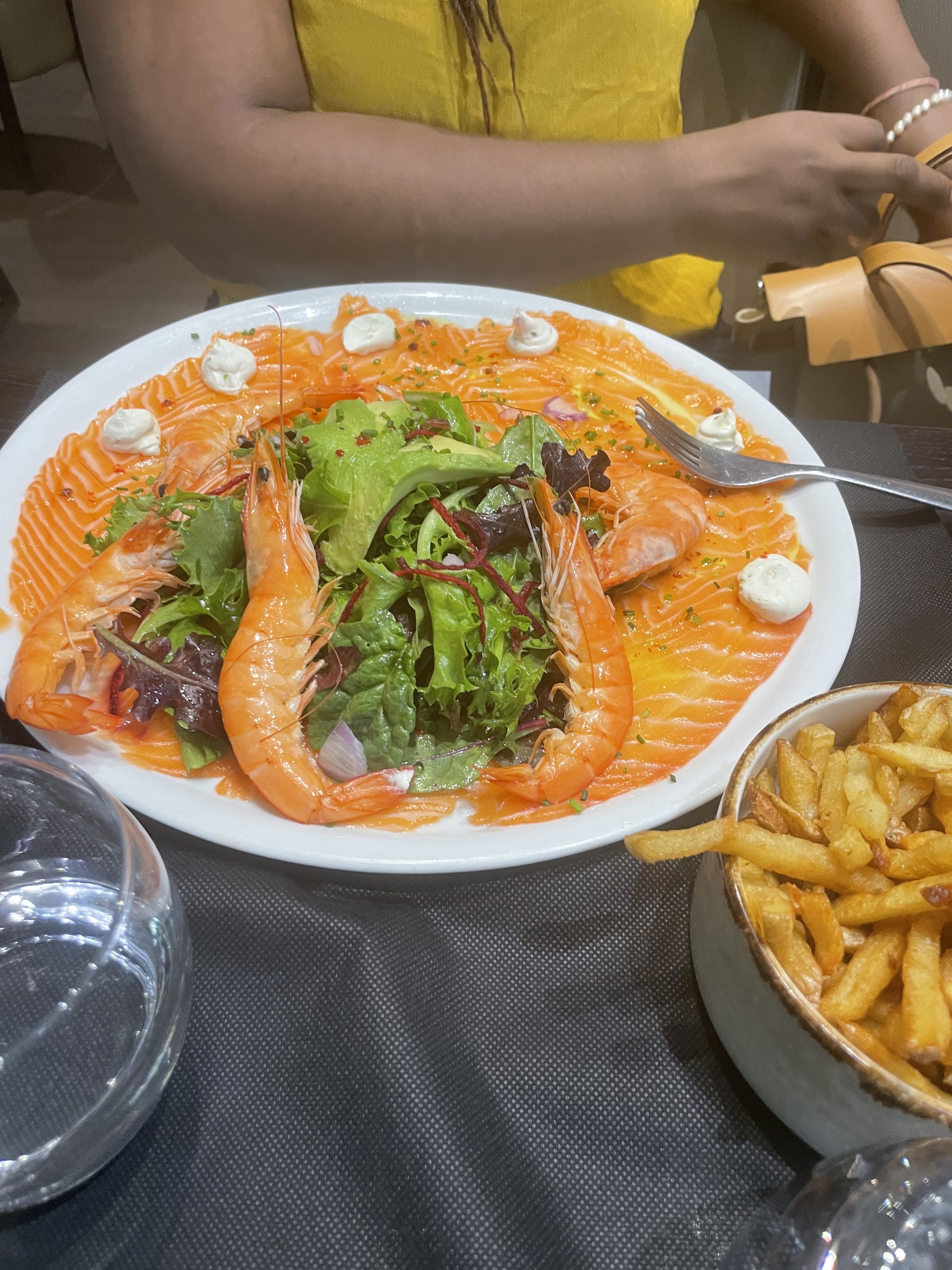 Première fois de ma vie que je teste la salade salée... certains restaurants ont visiblement tendance à croire que la salade n est que décorative.. C'est bien dommage.. vu qu'elle n était assaisonnée, j y ai ajouté du sel pour pouvoir la manger.. parce qu'on est d'accord, on est pas des lapins 😅 Ensuite, devoir redemander les apéros au bout de 25 min qui sont arrivés quand même après le plat.. Nos voisins ont un peu vécu la même chose en demandant au moins 3 fois leurs cafés gourmands... ils étaient 2, ils en ont eu 3 cafés et ont été servis à 15 min d écart pour leur dessert.. D autres voisins ont voulu partir... et pis on leur a dit vous inquiétez pas ça arrive... C'est arrivé tellement vite après que le serveur attendait a côté de la personne qu'elle finisse son entrée pour lui poser son plat... Ah oui ... encore une chose... les gambas, hum bah ça se nettoie... C'est comme... tout... C'était folklo, on l à pris avec humour avec nos voisins.. Mais nous ne reviendrons pas.. je vous laisse essayer si le coeur vous en dit... Après c'est pas mauvais. Le personnel était souriant..