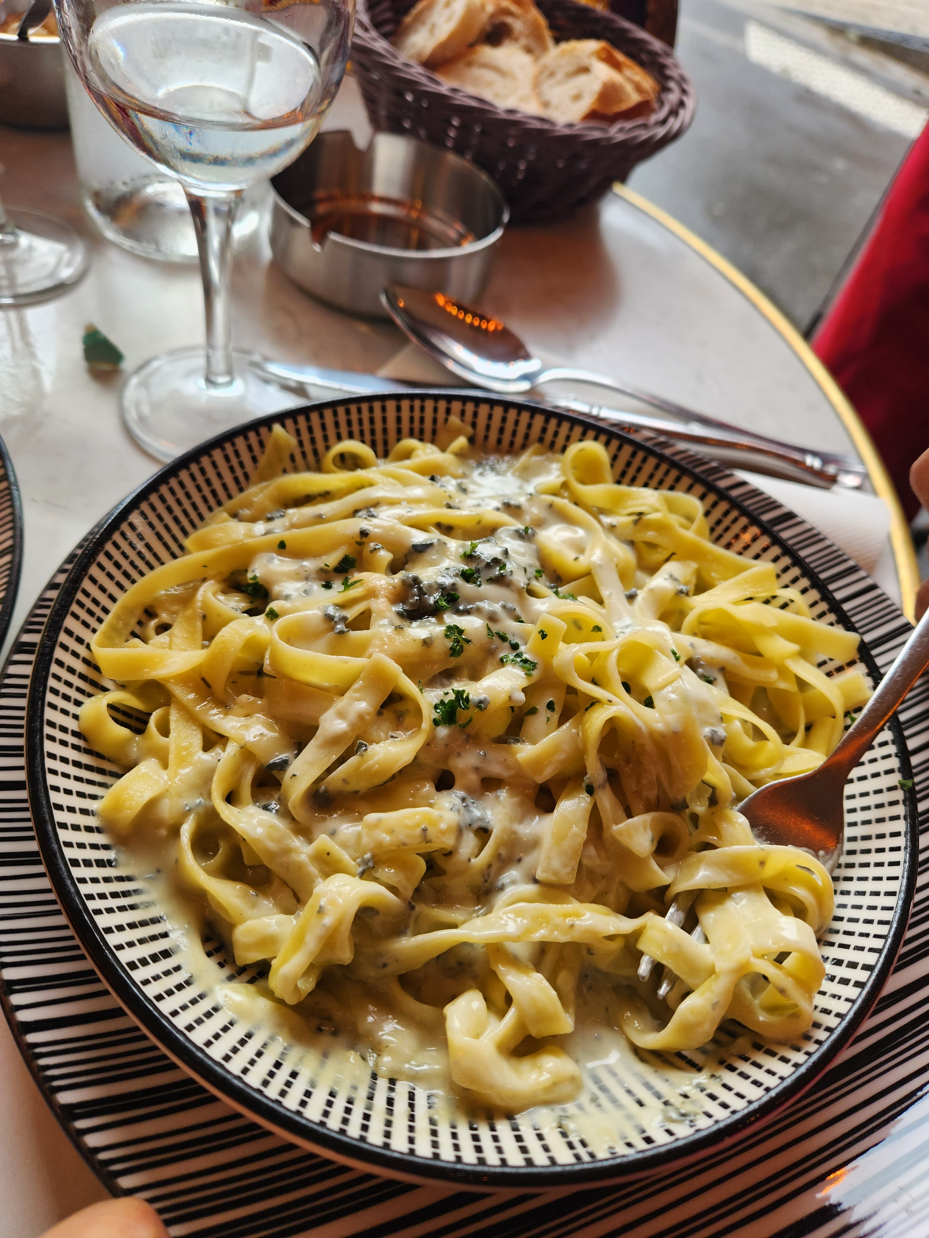 Nous sommes entrés dans cet endroit lorsque nous étions à Paris la semaine dernière et nous aurions aimé continuer à marcher. Le service était horrible, le serveur mettait simplement la main en l'air et passait devant nous plusieurs fois lorsque mon mari essayait d'attirer son attention pour que nous puissions commander. Il a fallu environ 20 minutes pour commander ! J'ai marché dans la rue jusqu'à notre hôtel pour récupérer ma veste et revenir et mon mari n'avait toujours pas commandé ! J'ai eu la bolognaise et c'était horrible. Littéralement nouilles, viande et tomates. Pas de sauce, pas d'assaisonnement. Si la nourriture à Paris est censée être excellente, ce n'est certainement pas ici !