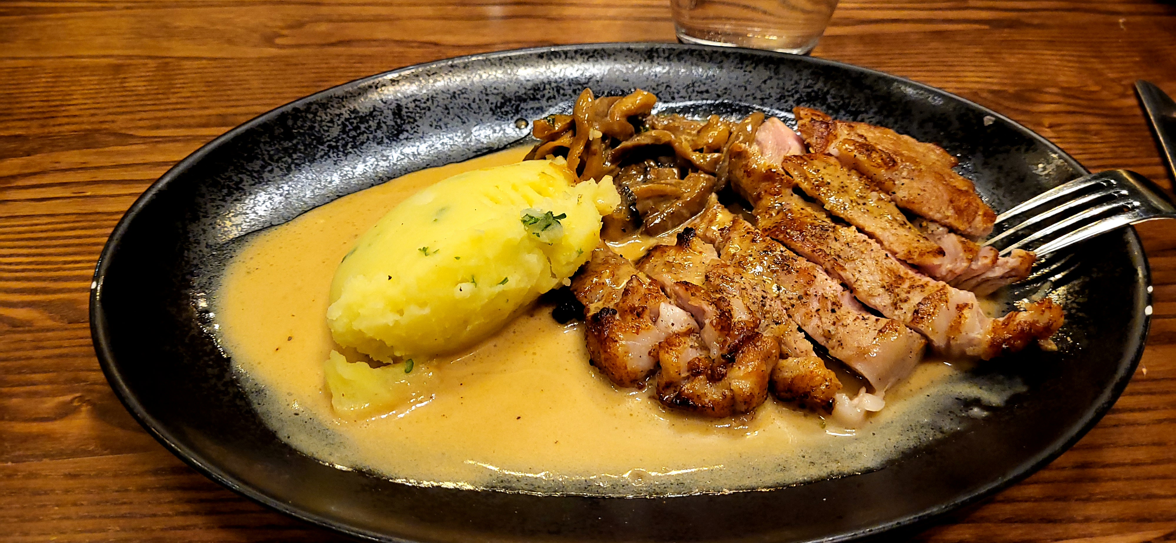 Restaurant superbe. Son architecture et son décor sont très agréable et cosy. On penserait que ça peut bien résonner au vu de la hauteur de plafond, mais les sons sont tamisés. Ça donne au restaurant une ambiance chaleureuse (on était de nuit aussi). Le service était très bien, les serveurs très aimables et discrets (on était bien absorbé par nos conversations et ils l'ont respecté). Les entrées, plats et desserts étaient excellents. La qualité était présente ainsi que la quantité. Nous étions 4 et sommes répartis tous avec le ventre plein. (4 menus) Petit plus: ils sont dog-friendly.