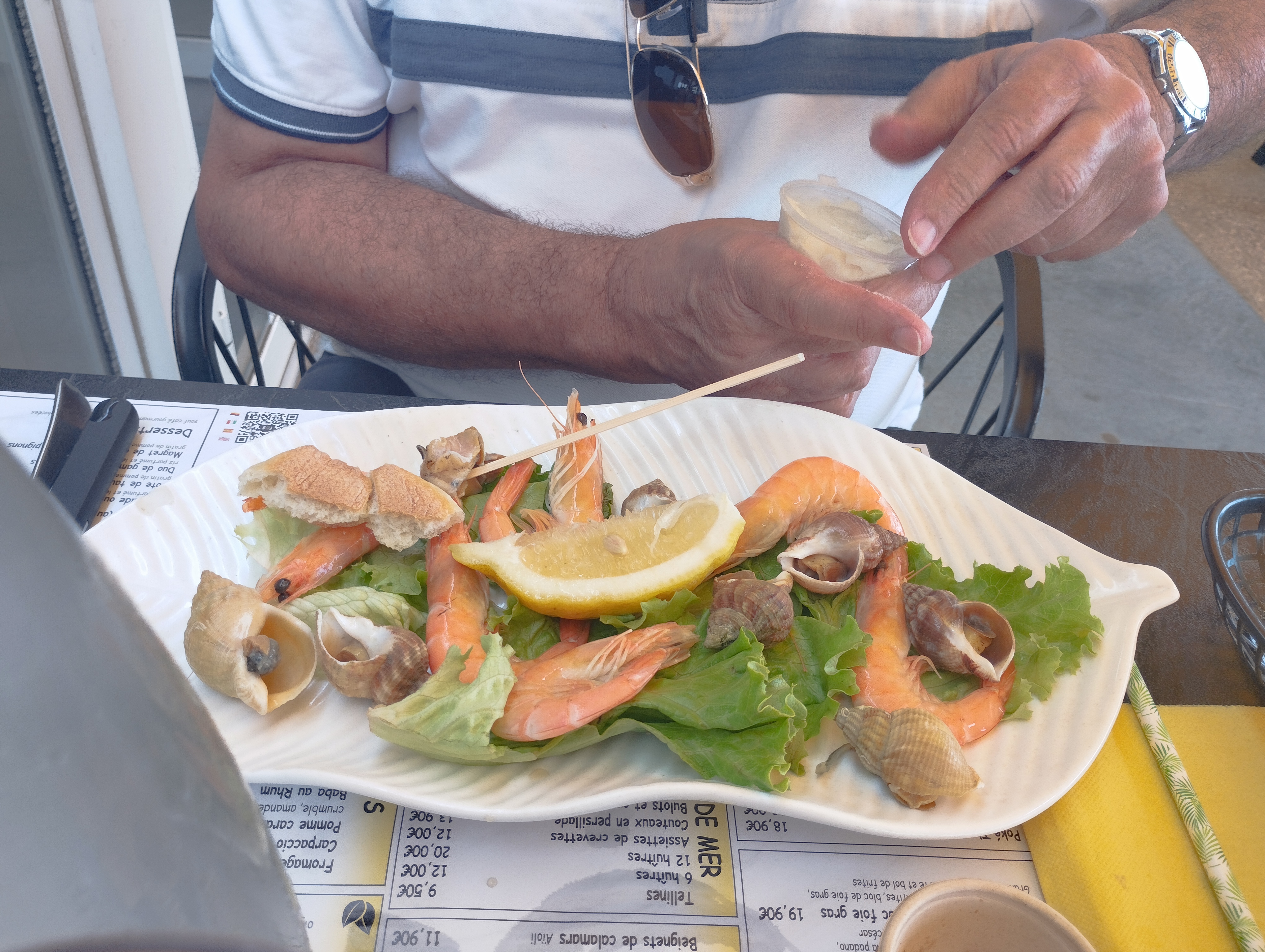Serveur blasé (sommes au mois de mars.. ) Moules à la marinière sèches rien qui ressemble à une sauce marinière, crevettes fades, bigorneaux pas frais dont 1 que je n'ai pas osé manger. Bref. Pas bon.