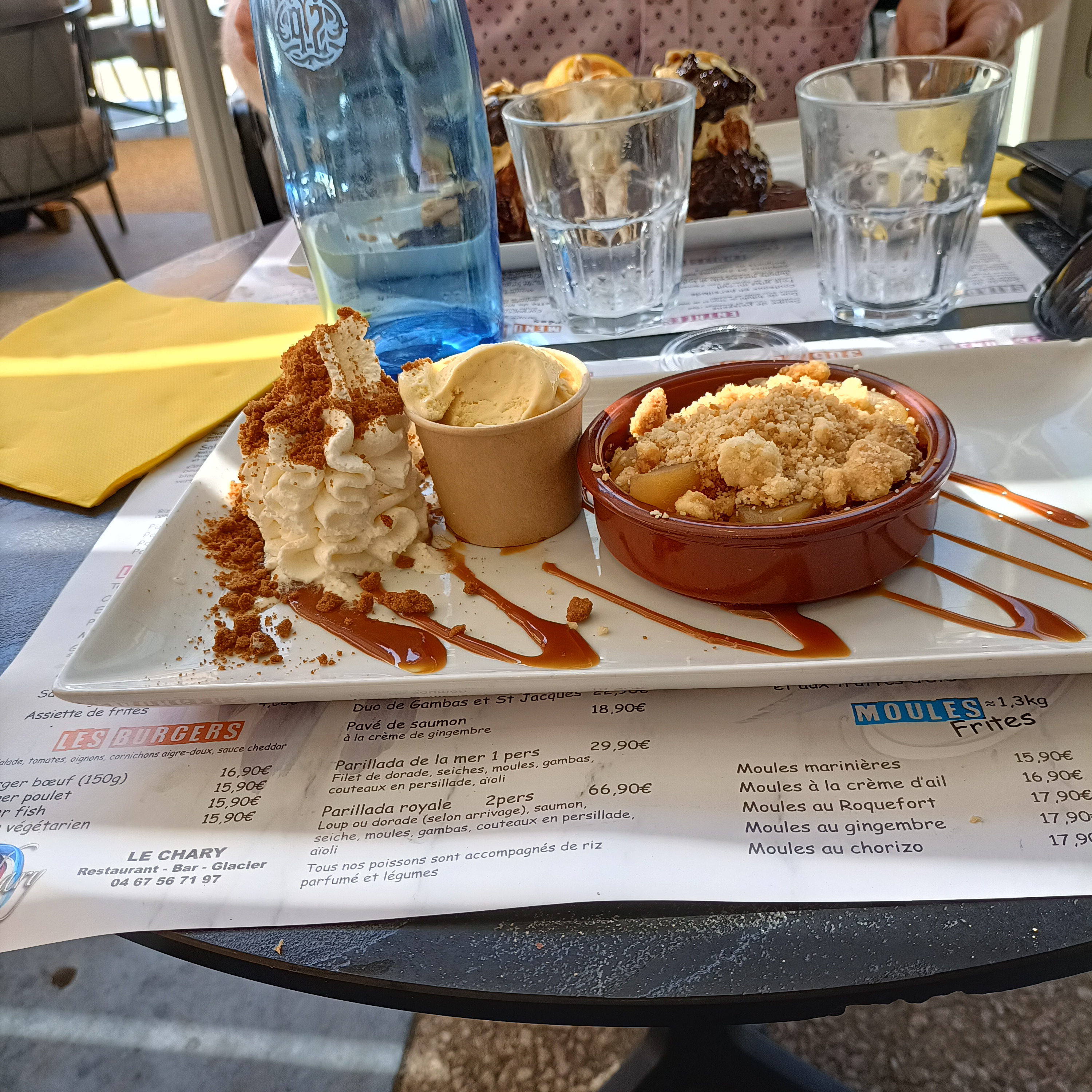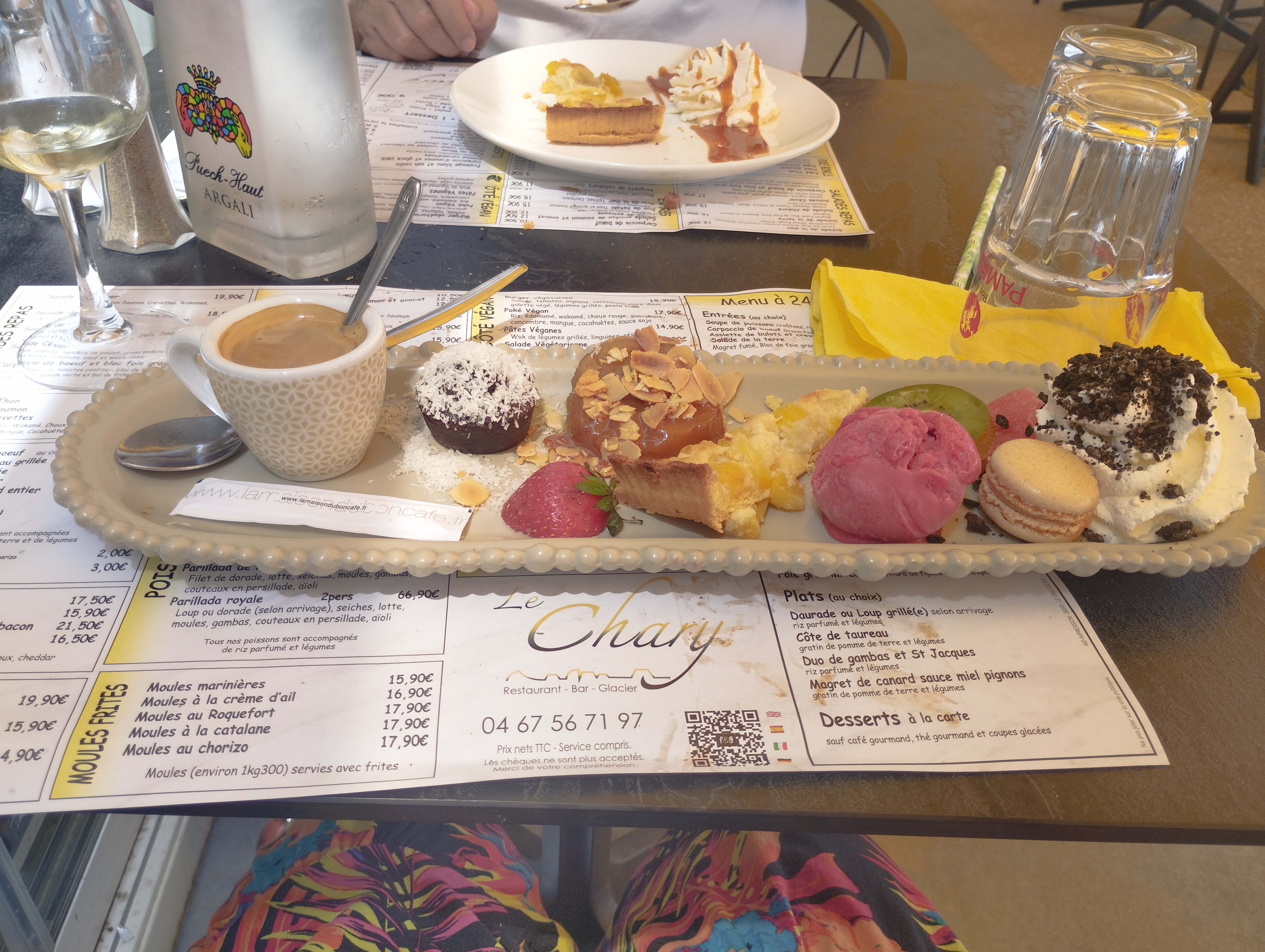 En promenade à la Grande Motte, l'heure du repas approchant, nous nous sommes arrêtés au restaurant Le Chary LGM. Un apéro avant, Sangria pour lui, bierre ambré pour moi. Menu à 24,90€ , et un verre de vin rouge Pic Saint-Loup pour Monsieur. Avec assiette de boulot et crevettes , moules à la crème d'ail et dessert du moment, une tarte et chantilly. Moi Salade de la terre, Moule à la Catalane, et café gourmand avec un verre de blanc Viogner Vraiment très bien,serveurs très avenants et souriants, super ambiance avec une musique de fond . On s' est régalé, on a mangé plus qu'il en faut. A savoir, ils peuvent servir les repas jusqu'à ... 14h. Bien sûr quand ils n'ont pas trop de monde . Très bonne adresse, face à la mer, prenez le temps, arrêtez vous !