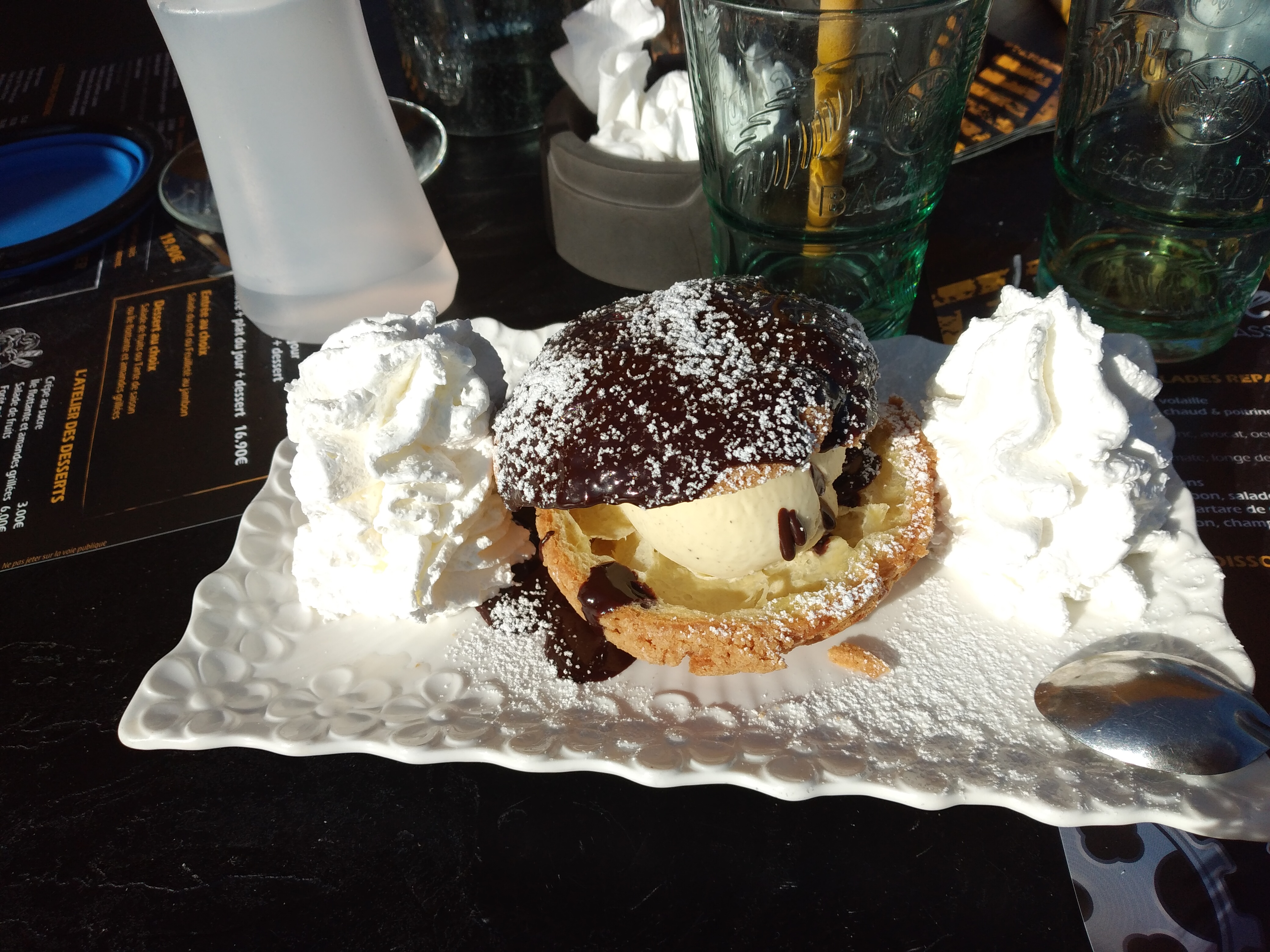 Petit arrêt en couple pour partage un bon moment au goûter... Face à la mer... vue superbe avec de l’ombre... Installation en terrasse compliquée pour trouver une table propre car elles sont débarrassées mais pas lavées ! Très désagréable d’avoir une table collante !!! Commande : Coupe rhum raisin et coupe bounty puis une gaufre au sucre et une crêpe citron... A part le non lavage de la table, le serveur est efficace, vous êtes servis très rapidement ! Les glaces sont bonnes mais pas maison. Elles contiennent a mon goût un peu trop de chantilly ! La gaufre n’a rien d’extraordinaire, visiblement faite avant puis réchauffée ! Pour la crêpe au citron... nous cherchons encore le citron ! Deux cafés pour terminer... Rien a dire... Montant : 23,40€ (très raisonnable) !