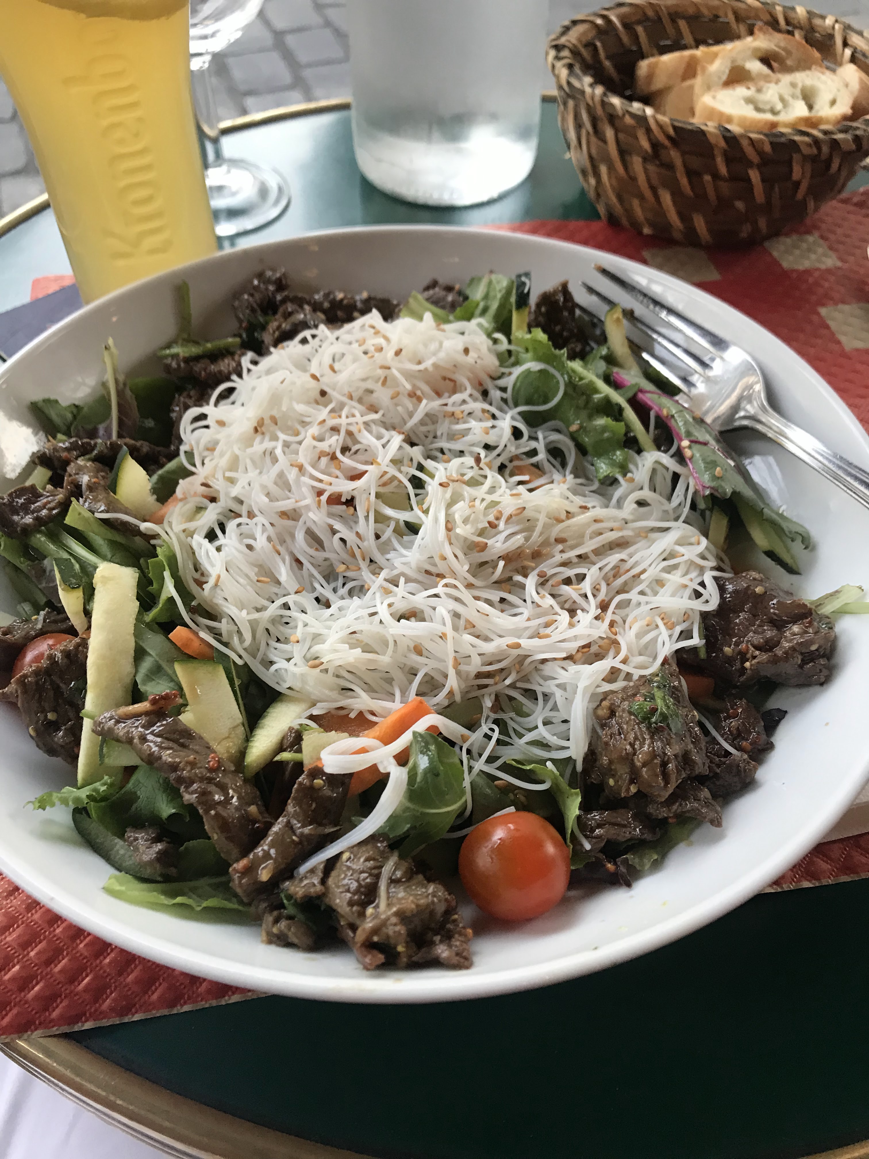 Il y avait une excellente salade thaïlandaise. L'extérieur est idéal pour regarder les gens. La nourriture est arrivée rapidement et le service était bon.