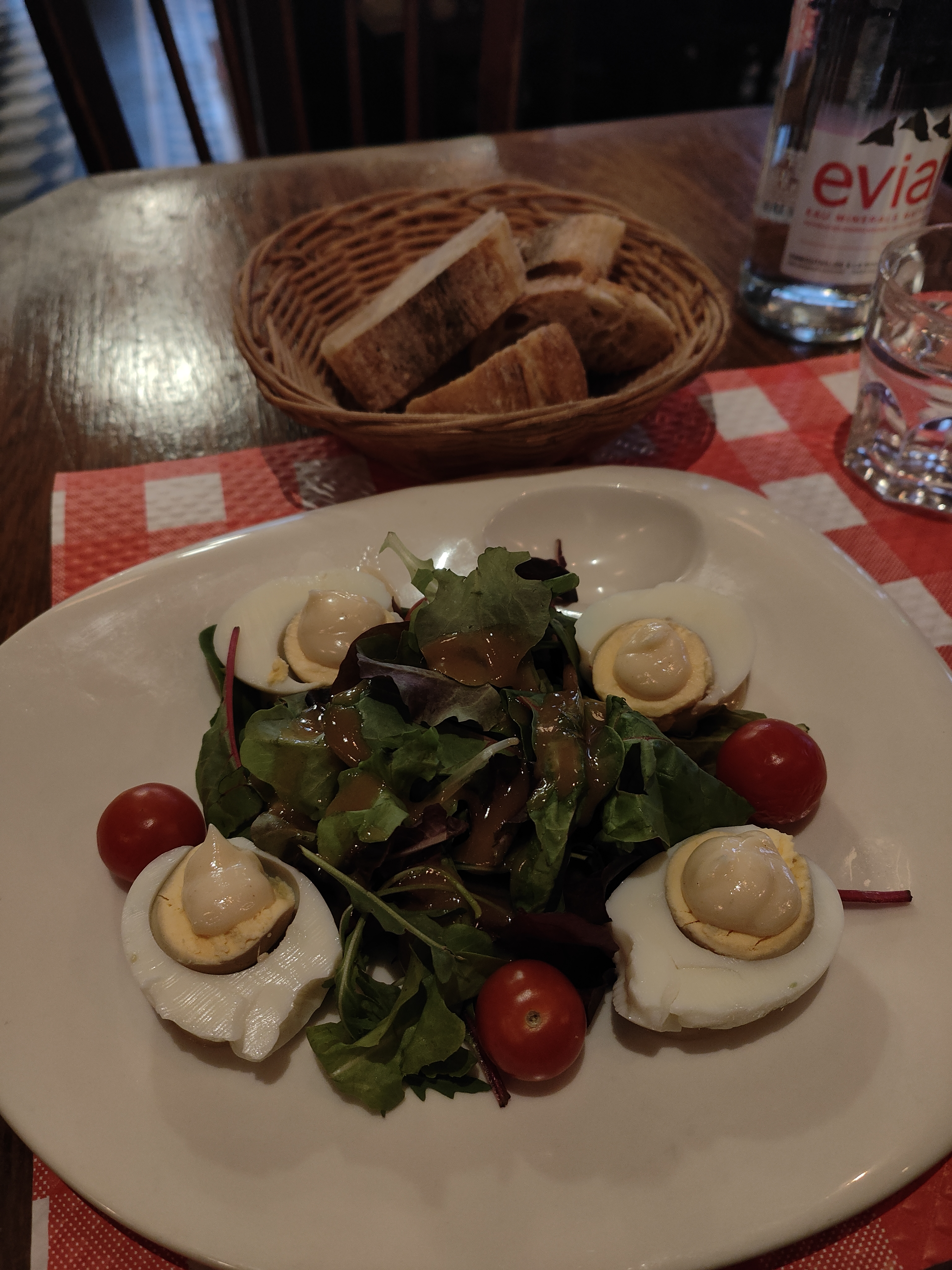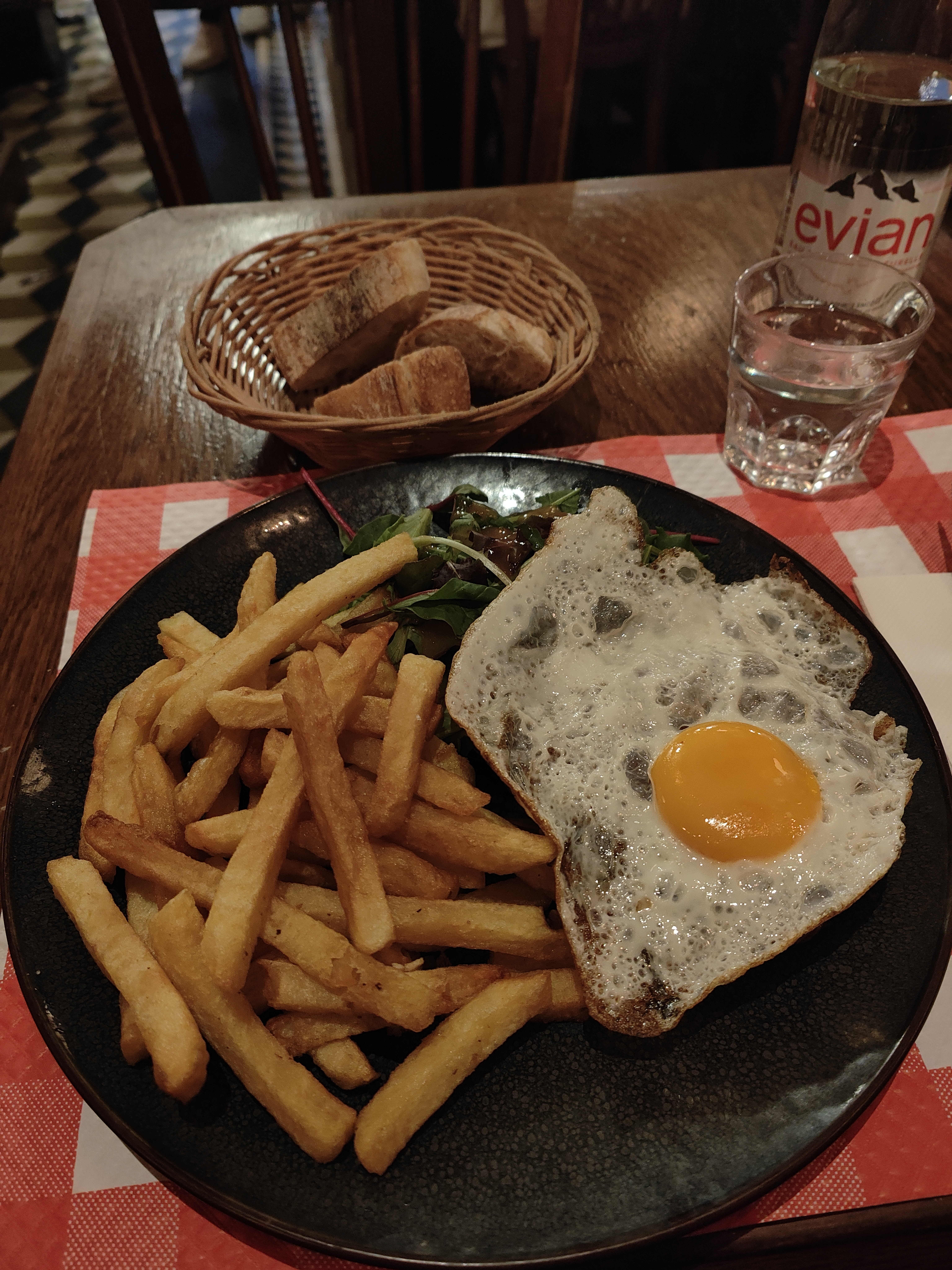 Le restaurant est plutôt petit mais dispose d'une terrasse sur le côté du restaurant, ainsi que d'une autre terrasse en face de la rue. J'ai pris des oeufs mayo, ainsi qu'un steak haché et une bouteille d'Évian 1/2 L'oeuf mayo, beaucoup trop cher pour ce que c'est, et la quantité de mayo dessus est minime... Le steak haché lui était très bon ! Bonne quantité dans l'assiette. Faut demander le sel et poivre, ça c'est vraiment dommage, première fois que je vois ça ! Les serveurs sont en sous-effectif et complètement dépassés, ça se voit, ils courent partout. J'ai attendu 10 minutes avant qu'un serveur me regarde pour prendre ma commande En tout cas, le barman à l'air de kiffer sa vie, ça fait plaisir