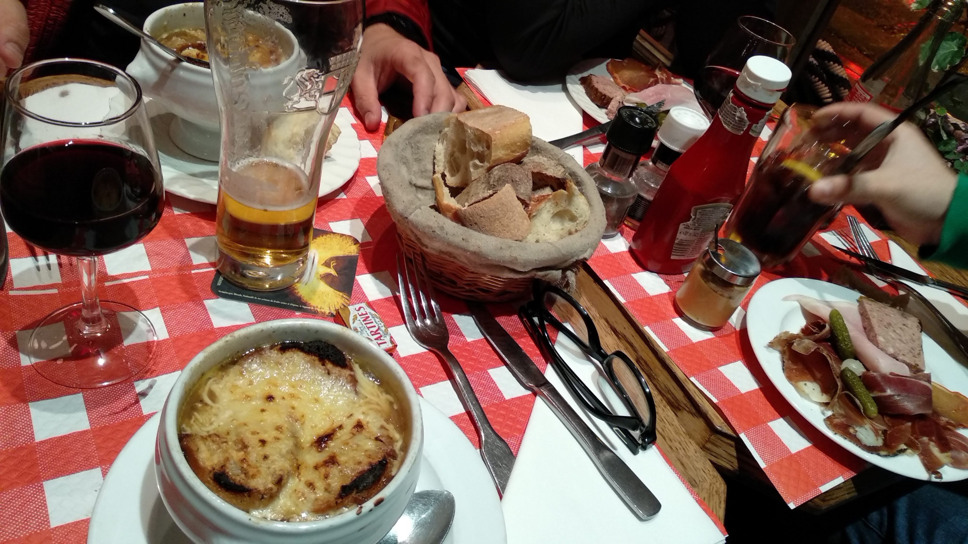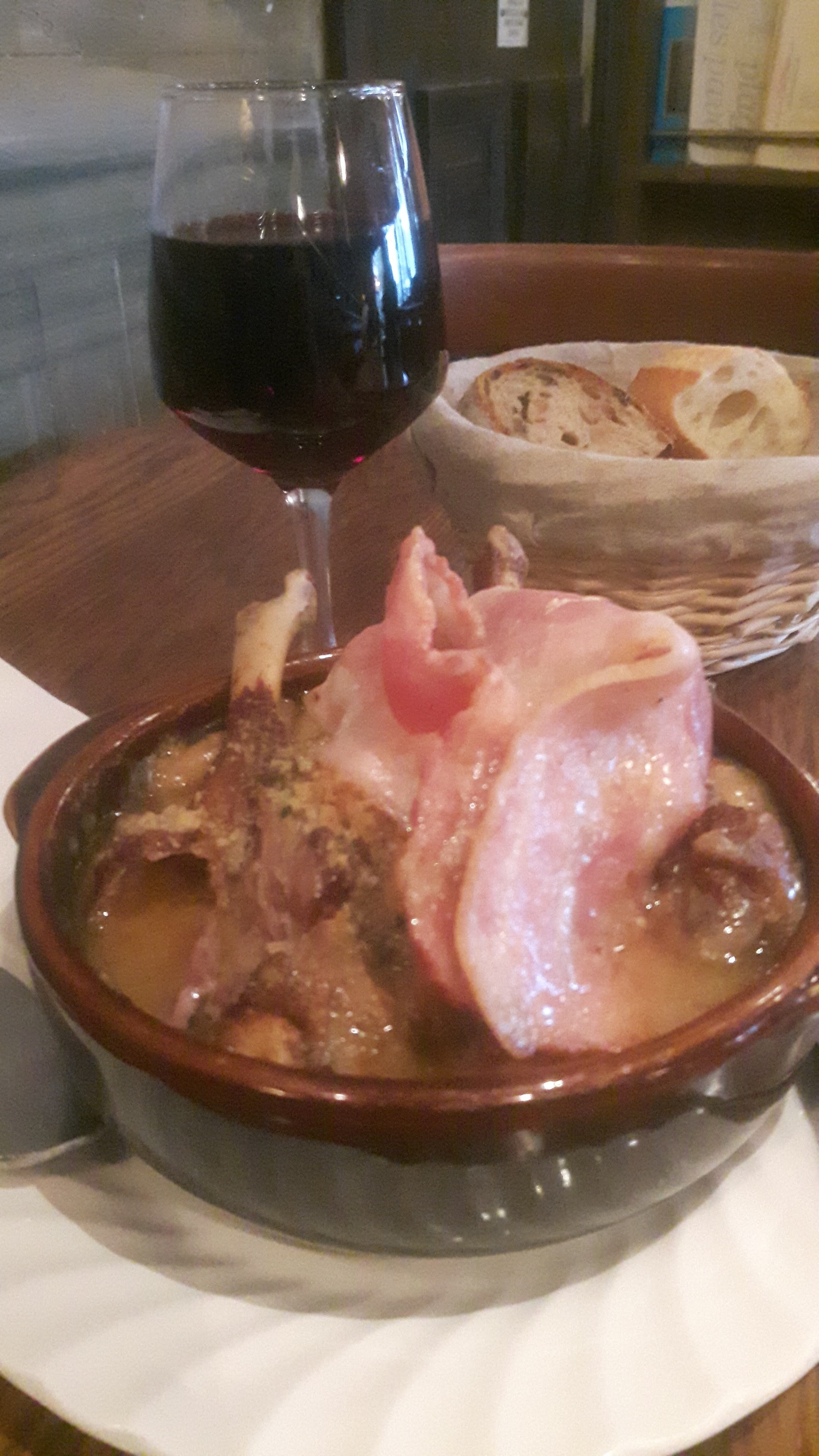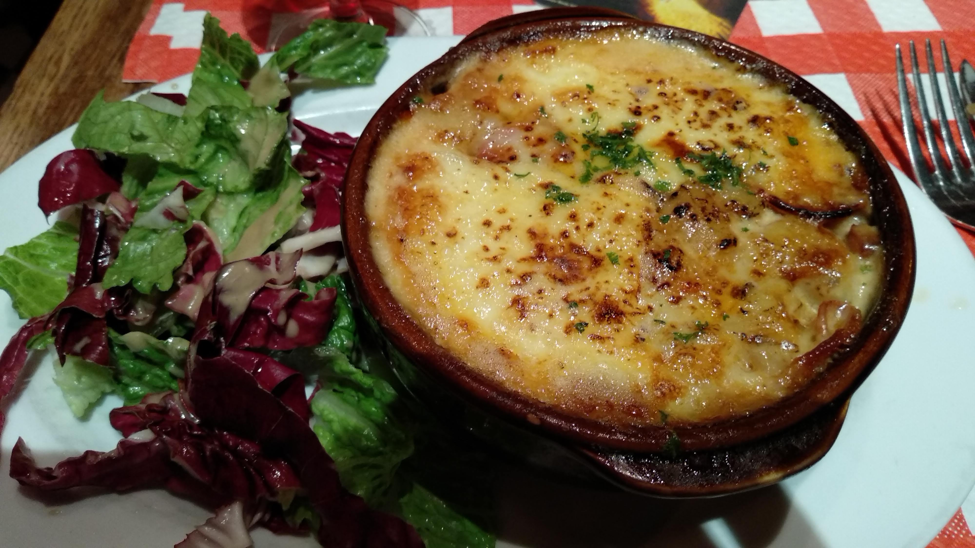 C'est un endroit tellement incroyable. Nous étions quatre personnes, avons réservé une table par téléphone, sommes arrivés sur place, un endroit tellement cosy... ça fait vraiment monter l'expérience parisienne aux cieux. Le personnel était très sympathique et tous parlaient anglais (et certains même espagnol !). Je recommande totalement la Basquiflette et la soupe à l'oignon en entrée. (La basquiflette est un plat très lourd, alors ne prenez pas d'entrée si vous optez pour cela). Nous avions des entrées, des plats principaux, des desserts et deux boissons chacun et avons payé environ 34 € chacun. Je recommande le cheesecake en dessert. Par ailleurs, les toilettes sont un peu bizarres... mais je suppose que c'est la norme à Paris ! 100% recommandé.